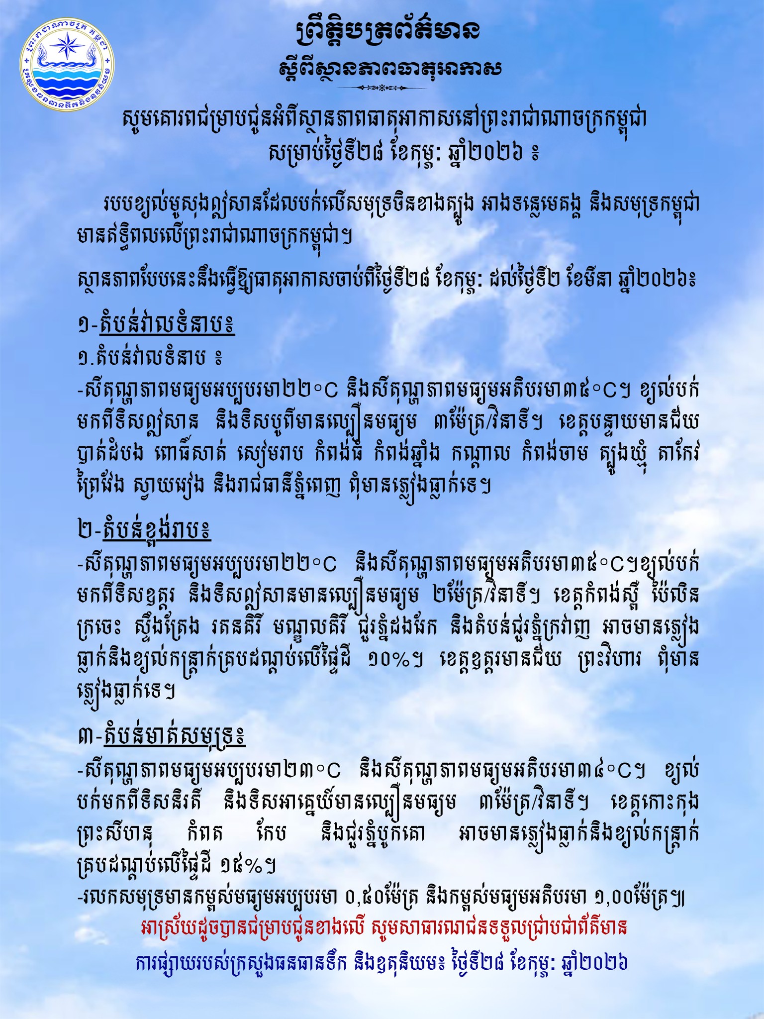 រាជធានីភ្នំពេញ៖ ក្រសួងធនធានទឹក និងឧតុនិយម បានឱ្យដឹងថា ចាប់ពីថ្ងៃទី ២៨ ខែកុម្ភៈ ដល់ថ្ងៃទី ០២ ខែមីនា ឆ្នាំ ២០២៦ តំបន់មាត់សមុទ្ររួមមានខេត្តកោះកុង ព្រះសីហនុ កំពត កែប និងជួរភ្នំបូកគោ អាចនឹងមានភ្លៀងធ្លាក់ និងខ្យល់កន្ត្រាក់គ្របដណ្តប់លើផ្ទៃដីប្រមាណ ១៥%។