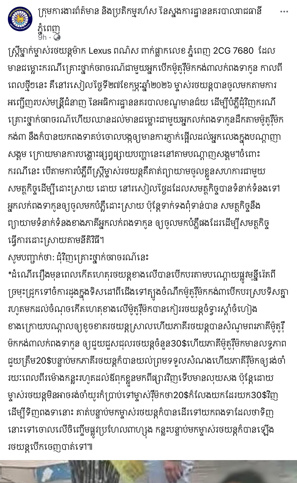 រាជធានីភ្នំពេញ ៖ យោងតាមក្រុមការងារ និងប្រតិកម្មរហ័សនៃស្នងការដ្ឋាននគរបាលរាជធានីភ្នំពេញបានឱ្យដឹងថា ស្ត្រីម្នាក់ជាម្ចាស់រថយន្តម៉ាក Lexus ពណ៌ស ពាក់ផ្លាកលេខភ្នំពេញ 2CG 7680 ដែលមានជម្លោះករណីគ្រោះថ្នាក់ចរាចរណ៍ ជាមួយអ្នកបើកម៉ូតូរ៉ឺម៉កកង់៣លក់ពងទាកូន កាលពីពេលថ្មីៗនេះ គឺនៅរសៀលថ្ងៃទី២៧ ខែកុម្ភៈ ឆ្នាំ២០២៦ ម្ចាស់រថយន្តបានចូលមកតាមការអញ្ជើញរបស់មន្ត្រីជំនាញនៃអធិការដ្ឋាននគរបាលខណ្ឌមានជ័យ ដើម្បីបំភ្លឺជុំវិញករណីគ្រោះថ្នាក់ចរាចរណ៍ ហើយឈានដល់មានជម្លោះជាមួយអ្នកលក់ពងទាកូនដឹកតាមម៉ូតូរ៉ឺម៉កកង់៣ នឹងក៏បានយកពងទាគប់ចោល បង្កឲ្យមានការភ្ញាក់ផ្អើលដល់អ្នកលេងក្នុងបណ្តាញសង្គម ក្រោយមានការបង្ហោះផ្សព្វផ្សាយបញ្ហានេះ នៅតាមបណ្តាញសង្គម ។