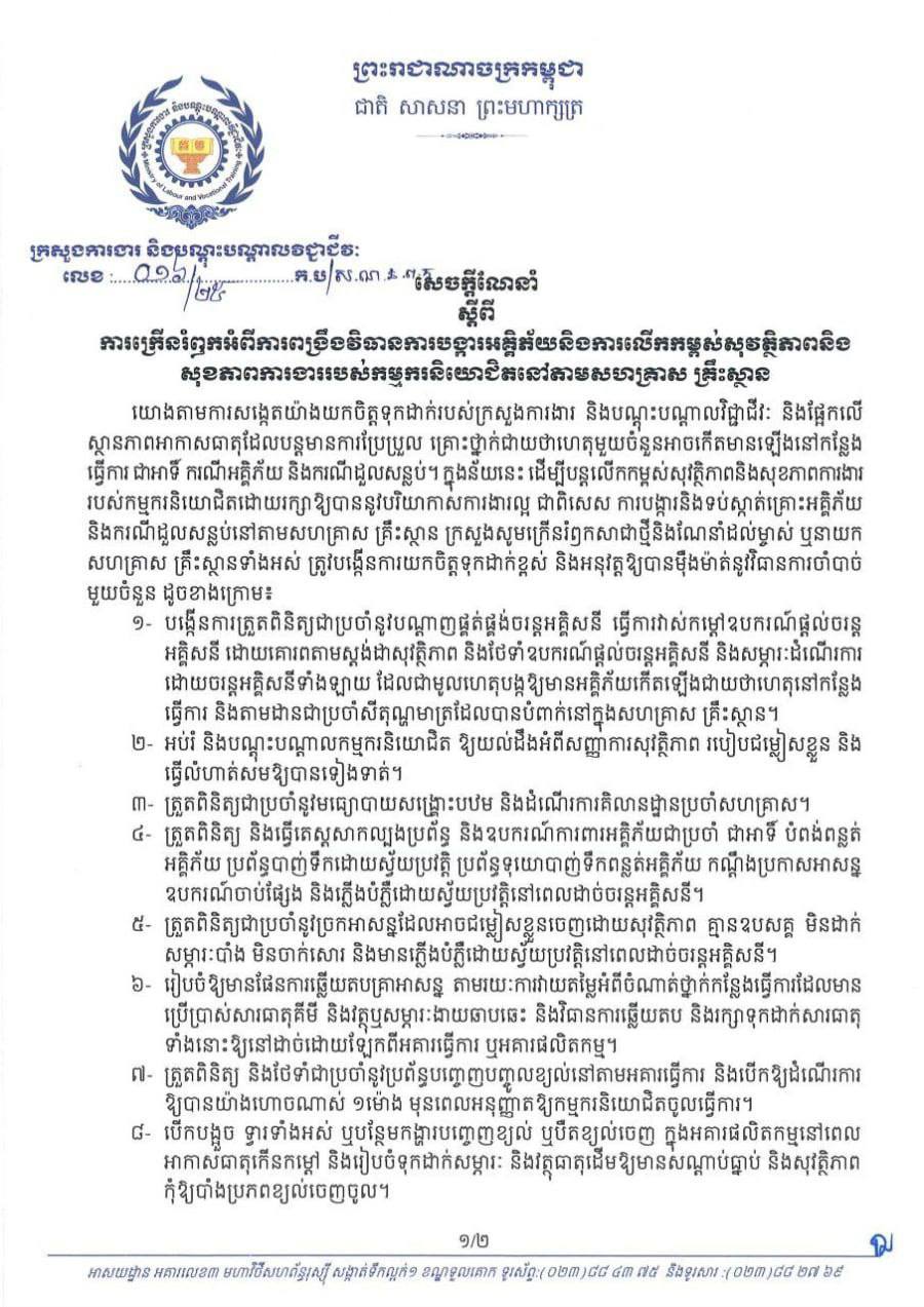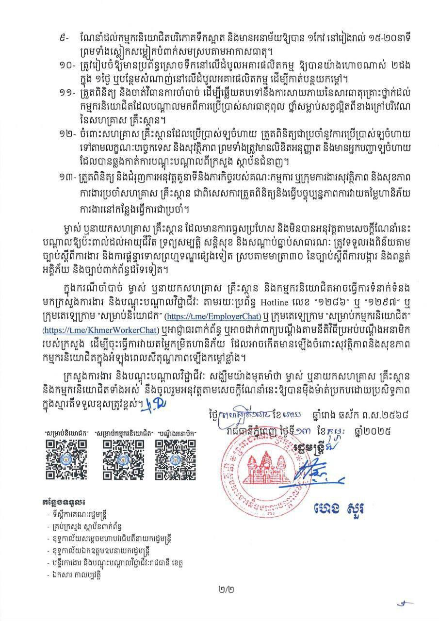 បើតាមលោក ស៊ុន មេសា ក្នុងករណីចាំបាច់ ម្ចាស់ ឬនាយកសហគ្រាស គ្រឹះស្ថាន និងកម្មករនិយោជិត អាចធ្វើការទំនាក់ទំនង មកក្រសួងការងារ និងបណ្តុះបណ្តាលវិជ្ជាជីវៈ តាមរយៈប្រព័ន្ធ Hotline លេខ “១២៨៦” ឬអាជ្ញាធរមានសមត្ថកិច្ចពាក់ព័ន្ធ ឬអាចដាក់ពាក្យបណ្តឹងតាមនីតិវិធីប្រអប់ បណ្តឹងអនាមិករបស់ក្រសួង ដើម្បីចុះធ្វើការវាយតម្លៃកម្រិតហានិភ័យ ដែលអាចកើតមានឡើងចំពោះសុវត្ថិភាព និងសុខភាពកម្មករនិយោជិតក្នុងអំឡុងពេលសីតុណ្ហភាពនៅក្នុងសហគ្រាស គ្រឹះស្ថានឡើងកម្ដៅខ្លាំង ៕ អត្ថបទសហការ