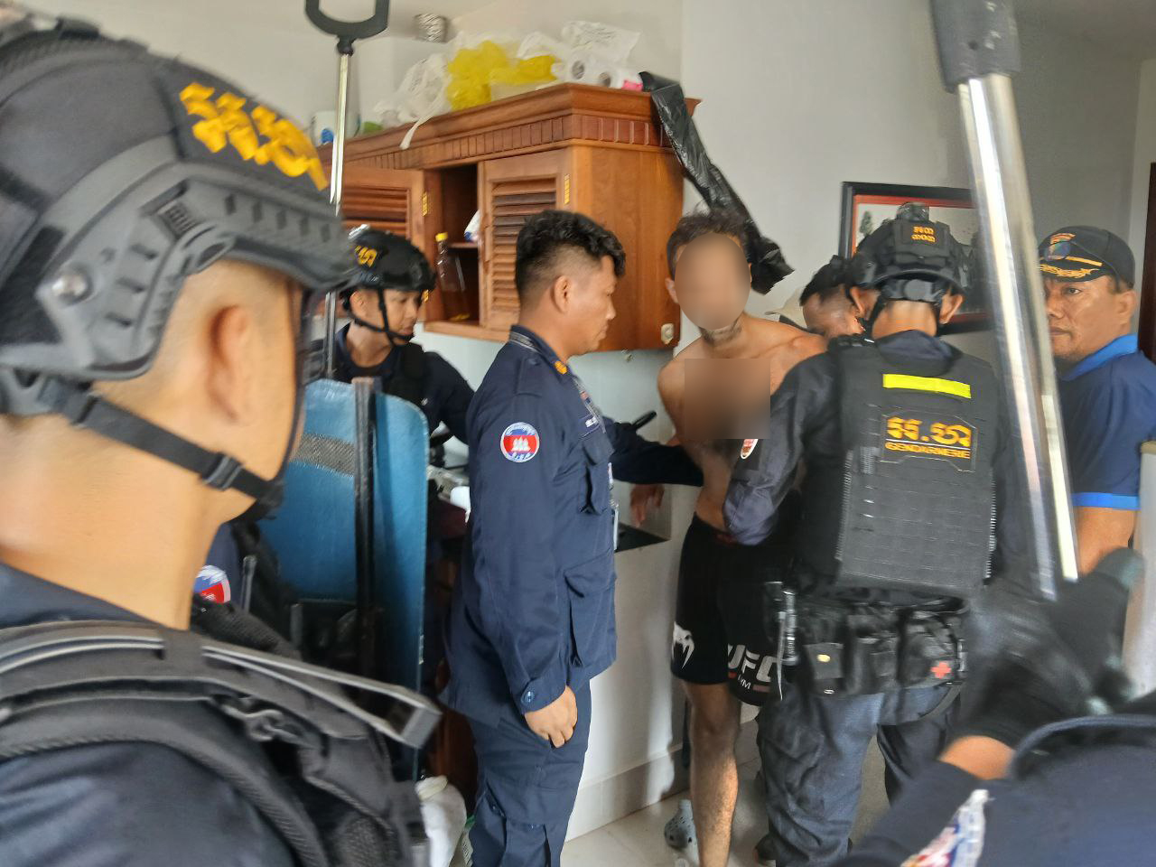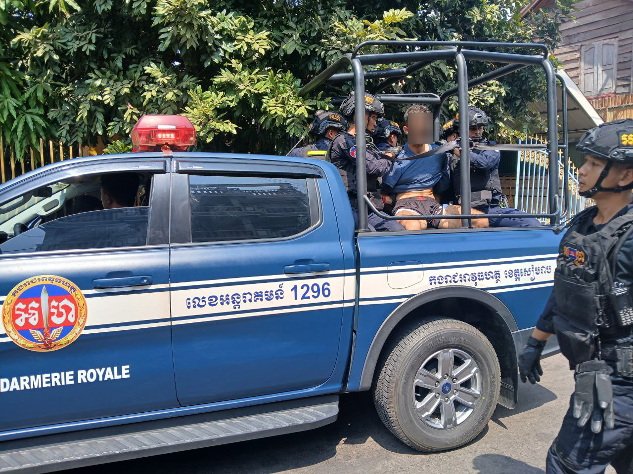 ខេត្តសៀមរាបះ កម្លាំងកងរាជអាវុធហត្ថខេត្ត បានទទួលពាក្យបណ្តឹង តាមរយៈលេខទូរស័ព្ទបន្ទាន់ ១២៩៦ សុំកិច្ចអន្តរាគមន៍លើករណី បុរស ជនជាតិ ចិនម្នាក់ បែកថ្នាំ កាប់បំផ្លាញទ្រព្យសម្បត្តិអ្នកដ៏ទៃ ក្នុង ( ខុន ដូរ )នាព្រឹកថ្ងៃទី ០៤ ខែមីនា ឆ្នាំ២០២៦ ស្ថិតនៅចំណុចជាន់ទី៣ ក្នុងភូមិវត្តដំណាក់ សង្កាត់សាលា កំរើក ក្រុង ខេត្តសៀមរាប រួចធ្វើការឃាត់ខ្លួន នាំយកមកសួរនាំនៅទីបញ្ជាការកងរាជអាវុធ ហត្ថខេត្តដើម្បីរៀបចំចាត់ការតាមនីតិវិធីច្បាប់។