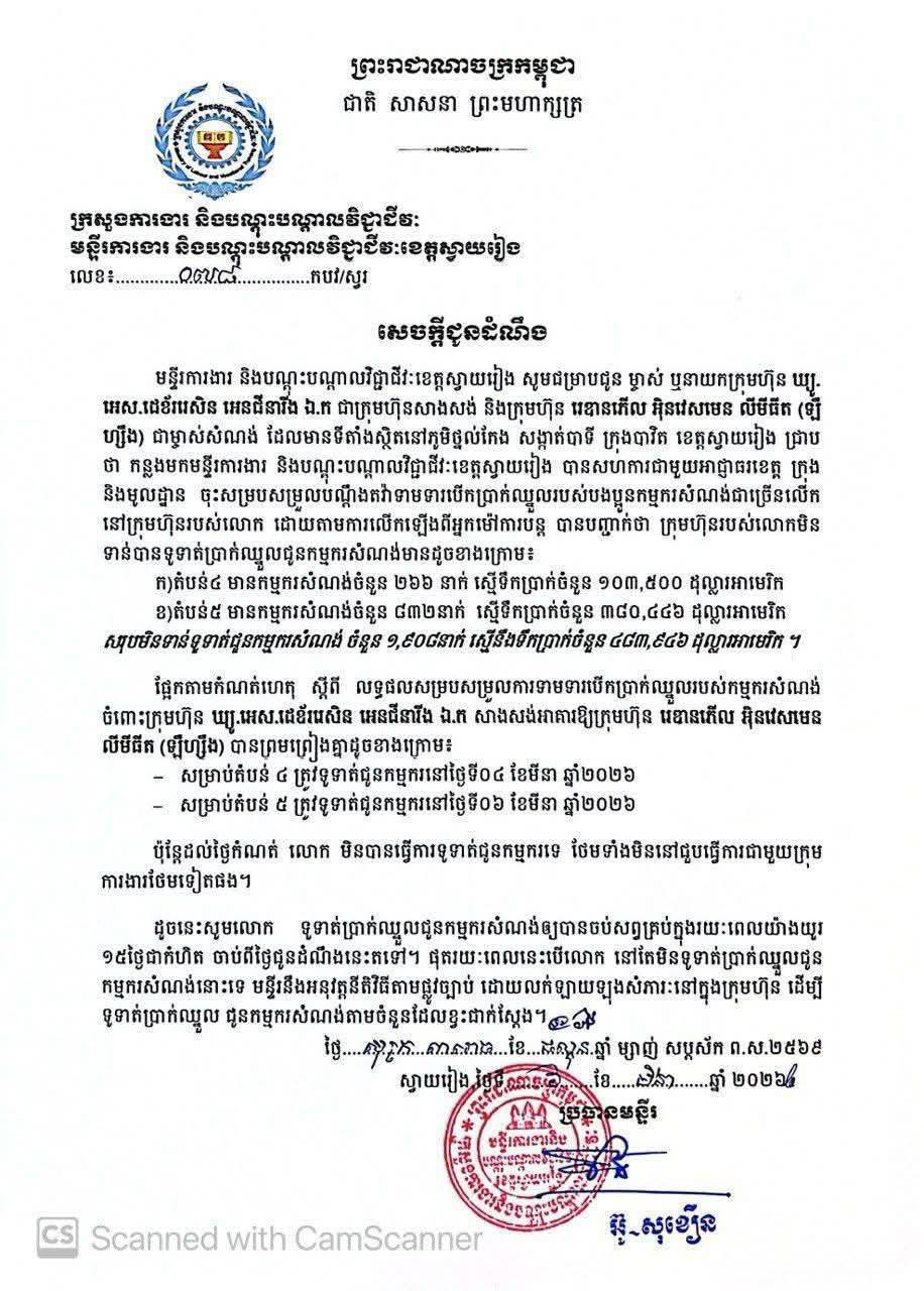 ខេត្តស្វាយរៀង ៖បន្ទាប់ពីភាគីក្រុមហ៊ុនបានខកខានមិនគោរពតាមកិច្ចសន្យាបើកប្រាក់ឈ្នួលជាលើកទី២ កាលពីព្រឹកថ្ងៃទី០៦ខែមីនា ឆ្នាំ២០២៦នេះក្រោមការបញ្ជាផ្ទាល់ពី លោក ប៉េង ពោធិ៍សា អភិបាលខេត្តស្វាយរៀង ក្រុមការងារចម្រុះខេត្តដឹកនាំដោយលោក ម៉ែន អេង អភិបាលរង តំណាងលោកអភិបាលខេត្ត លោក អ៊ូ សុខឿន ប្រធានមន្ទីរការងារ និងបណ្តុះបណ្តាលវិជ្ជាជីវៈខេត្ត លោកដាំ ឃុនពិសី ប្រធានស្តីទីមន្ទីរព័ត៌មានខេត្ត និងអាជ្ញាធរមូលដ្ឋានពាក់ព័ន្ធ បានចុះអន្តរាគមន៍ដោះស្រាយវិវាទការងាររវាងភាគីកម្មករ អ្នកម៉ៅការ និងភាគីម្ចាស់ការដ្ឋានអគារ របស់ក្រុមហ៊ុន ឃ្យូ.អេស ដេខ័ររេសិន អេនជឺនារីង ឯ.ក សាងសង់អគារក្រុមហ៊ុន រេឌាន ភើល អិនវេសមេន លីមីធីត (ឡឹហ្សឹង) ដើម្បីការពារសិទ្ធិ និងផលប្រយោជន៍បងប្អូនកម្មករ ស្ថិតនៅភូមិថ្នល់កែង សង្កាត់បាទី ក្រុងបាវិត ខេត្តស្វាយរៀង ។