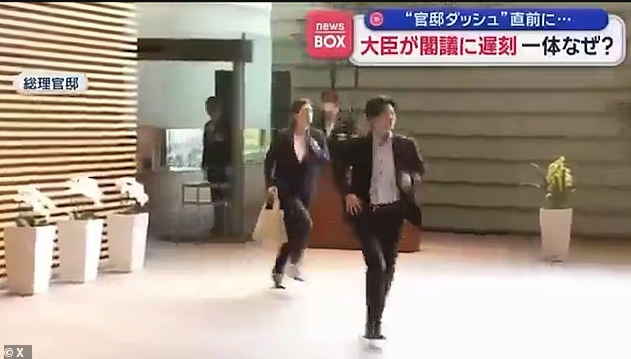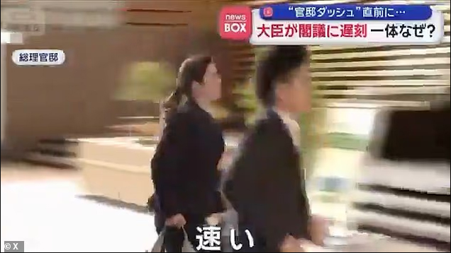 វីដេអូល្បី និងត្រូវបានចែកចាយពាសពេញបណ្តាញសង្គមមួយនេះ បានបង្ហាញពីស្ត្រីវ័យ៤៣ឆ្នាំរូបនេះ ដែលត្រូវបានស្គាល់ច្បាស់ថា កញ្ញា គីមី អូណូដា រត់យ៉ាងលឿនចូលទៅក្នុងអគារគណៈរដ្ឋមន្ត្រីដោយកាន់កាបូបដៃ ឆ្លងកាត់ក្រុមអ្នកសារព័ត៌មាន ដោយមានជំនួយការម្នាក់រត់ជាមួយ។ បន្ទាប់មក អ្នកនយោបាយស្រីរូបនេះ ត្រូវបានឃើញប្រញាប់ប្រញាល់រត់ចុះតាមជណ្តើរមួយឆ្ពោះទៅកាន់បន្ទប់ប្រជុំ។