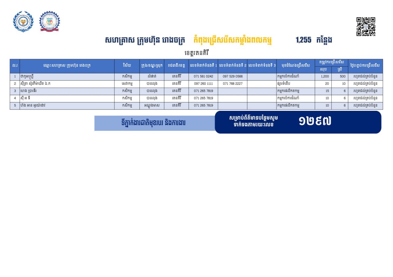 ជាមួយគ្នានេះ ក្រៅពីទំនាក់ទំនងផ្ទាល់ជាមួយក្រុមហ៊ុន សហគ្រាស និងរោងចក្រផ្ទាល់ អ្នកស្វែងរកការងារទាំងអស់ ជាពិសេសបងប្អូនអតីតពលករ ក៏អាចទាក់ទងមក ប្រព័ន្ធទំនាក់ទំនងបន្ទាន់ ១២៩៧ ដើម្បីឱ្យក្រុមការងាររបស់ក្រសួងការងារ និងបណ្ដុះបណ្ដាលវិជ្ជាជីវៈ ជួយសម្របសម្រួលស្វែងរកការងារជូនផងដែរ ៕ អត្ថបទសហការ
