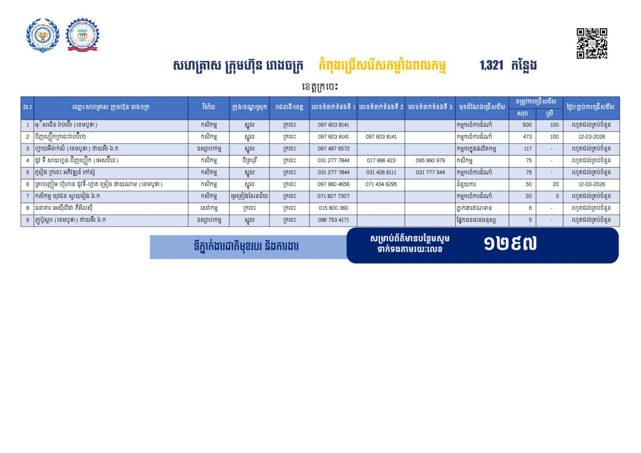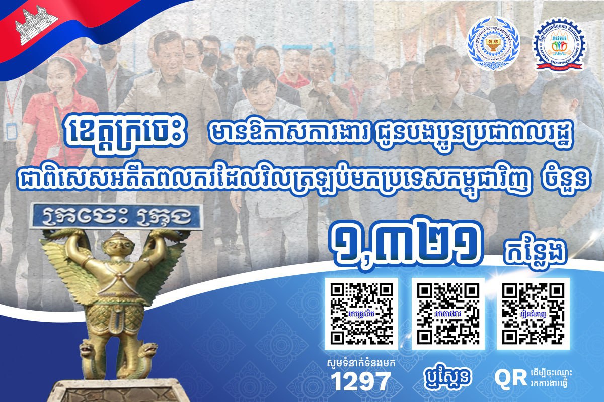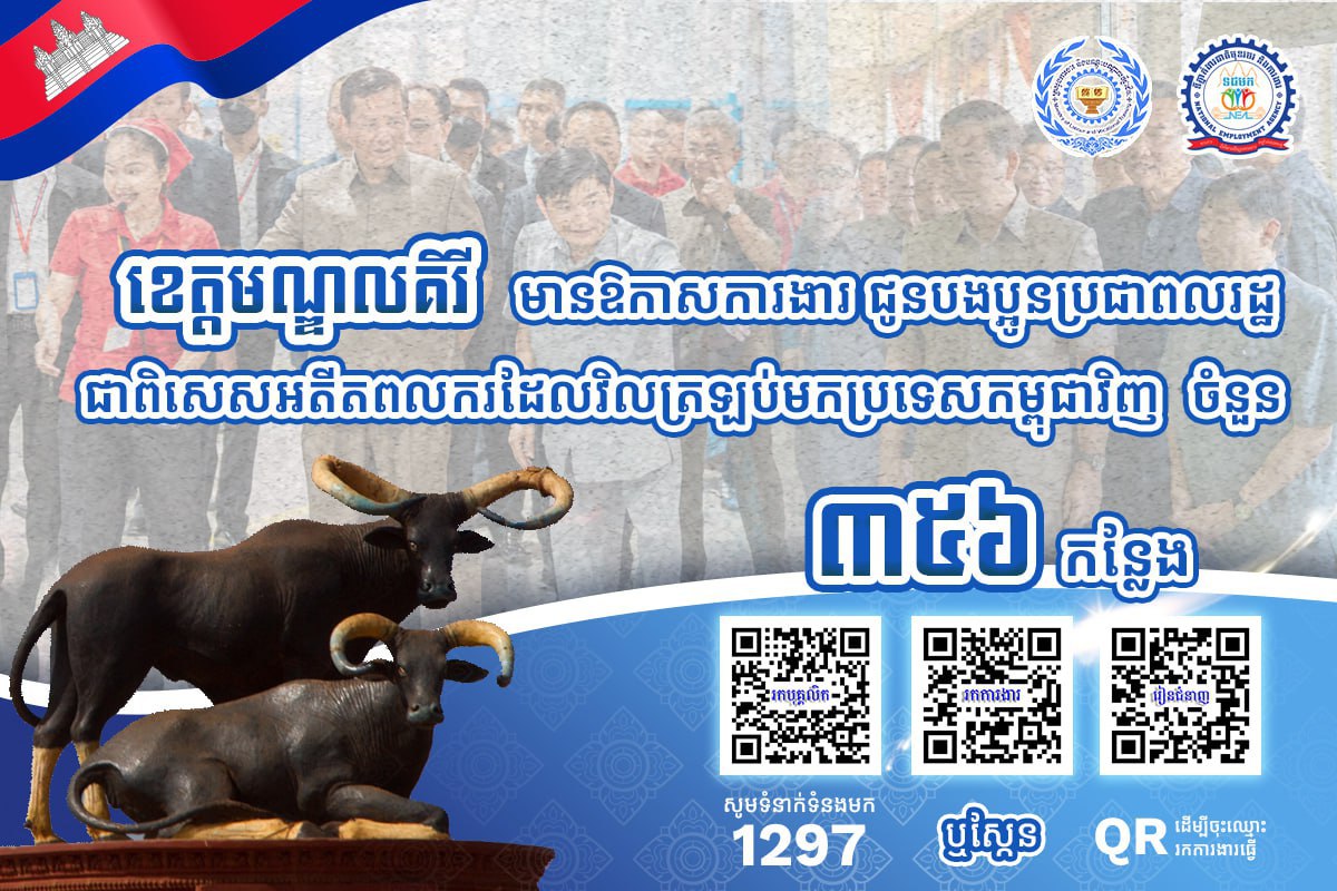 សេចក្ដីជូនដំណឹង របស់ក្រសួងការងារ បានឱ្យដឹងថា គិតត្រឹមថ្ងៃទី០៦ ខែមីនា ឆ្នាំ២០២៦នេះ ខេត្តដែលស្ថិតនៅភូមិភាគឦសាន្ត រួមមាន ខេត្តក្រចេះ ស្ទឹងត្រែង រតនគិរី និងខេត្តមណ្ឌលគិរី មានឱកាសការងារសរុបចំនួន ៣ ៤៧៧កន្លែង កំពុងរង់ចាំបងប្អូន អតីតពលករត្រឡប់ មកពីប្រទេសថៃ និងអ្នកកំពុងស្វែងរកការងារធ្វើ ក្នុងវិស័យកសិកម្ម ឧស្សាហកម្ម និងវិស័យសេវាកម្ម ។