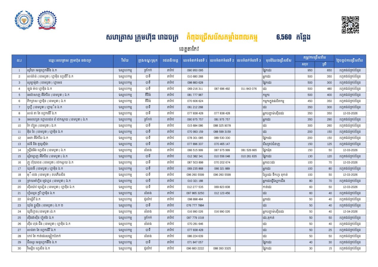 តាមរយៈការផ្សព្វផ្សាយរបស់ក្រសួងការងារបានឱ្យដឹងថា គិតត្រឹមថ្ងៃទី០៦ ខែមីនានេះ ខេត្តតាកែវ មានឱកាសការងារចំនួន ៦,៥៦០កន្លែង កំពុងរង់ចាំបងប្អូនអតីតពលករត្រឡប់មកពីប្រទេសថៃ និងអ្នកកំពុងស្វែងរកការងារធ្វើក្នុងវិស័យឧស្សាហកម្ម ។