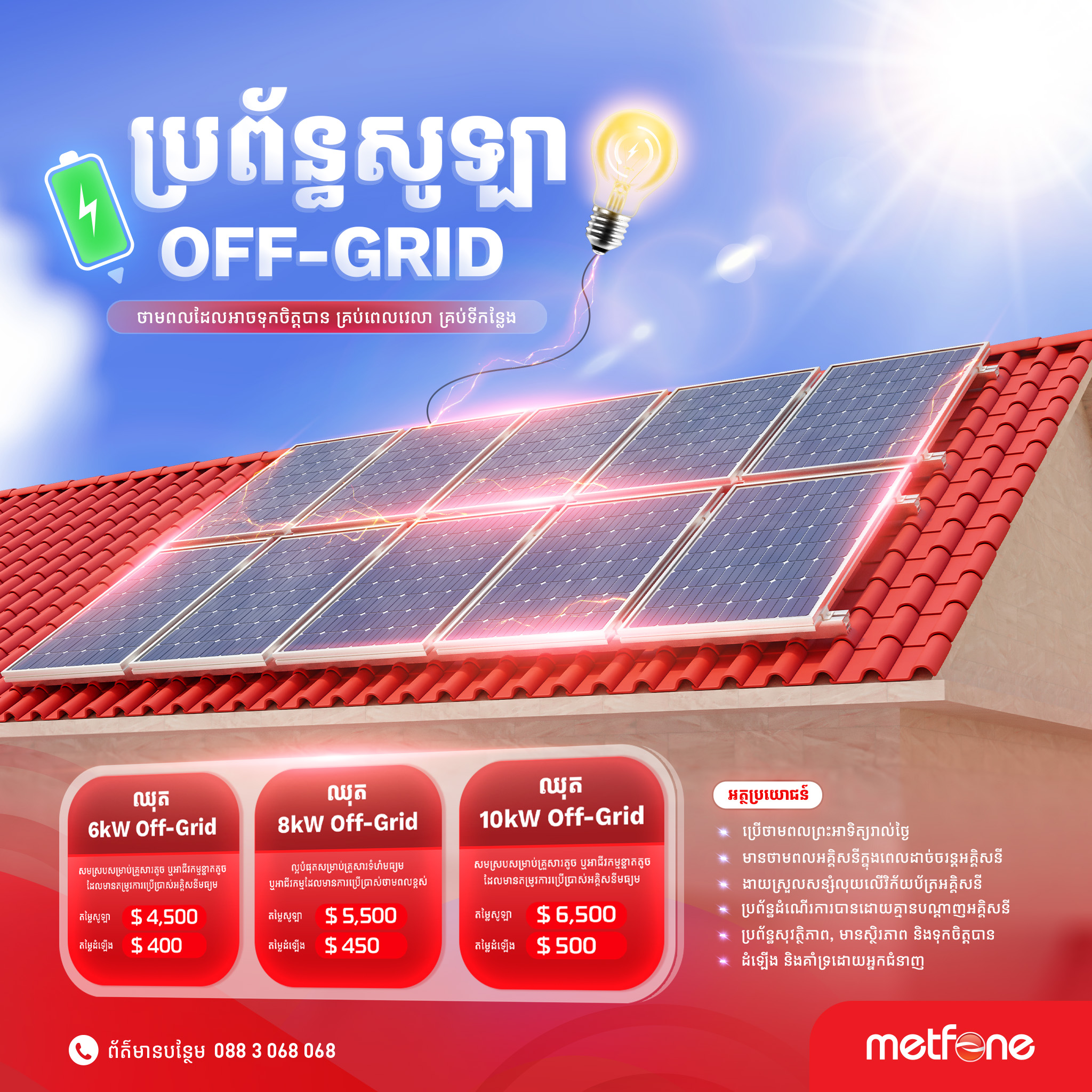 ប្រព័ន្ធថាមពលព្រះអាទិត្យរបស់ក្រុមហ៊ុន Metfone អនុញ្ញាតឱ្យអ្នកប្រើប្រាស់បង្កើតអគ្គិសនីពីថាមពលព្រះអាទិត្យ និងរក្សាទុកវាដោយឆ្លាតវៃសម្រាប់ការប្រើប្រាស់ 24/7 ។ នៅពេលថ្ងៃ អគ្គិសនីដែលបង្កើតចេញពីបន្ទះសូឡាត្រូវបានផ្តល់អាទិភាពដើម្បីផ្តល់ថាមពលដល់ឧបករណ៍ប្រើប្រាស់ក្នុងផ្ទះ និងប្រតិបត្តិការអាជីវកម្ម ។ ថាមពលលើសណាមួយត្រូវបានរក្សាទុក ក្នុងប្រព័ន្ធថ្មនឹងត្រូវរក្សាទុក ដល់ការប្រើប្រាស់នៅពេលល្ងាច ឬក្នុងអំឡុងពេលមានតម្រូវការខ្ពស់ ។ សូមអរគុណចំពោះយន្តការប្រតិបត្តិការទំនើបរបស់វា ប្រព័ន្ធនេះបង្កើនប្រសិទ្ធភាពថាមពលអតិបរមា និងធានាបាននូវការផ្គត់ផ្គង់ថាមពលដែលមានស្ថេរភាព និងបន្តក្រោមលក្ខខណ្ឌផ្សេងៗ ។