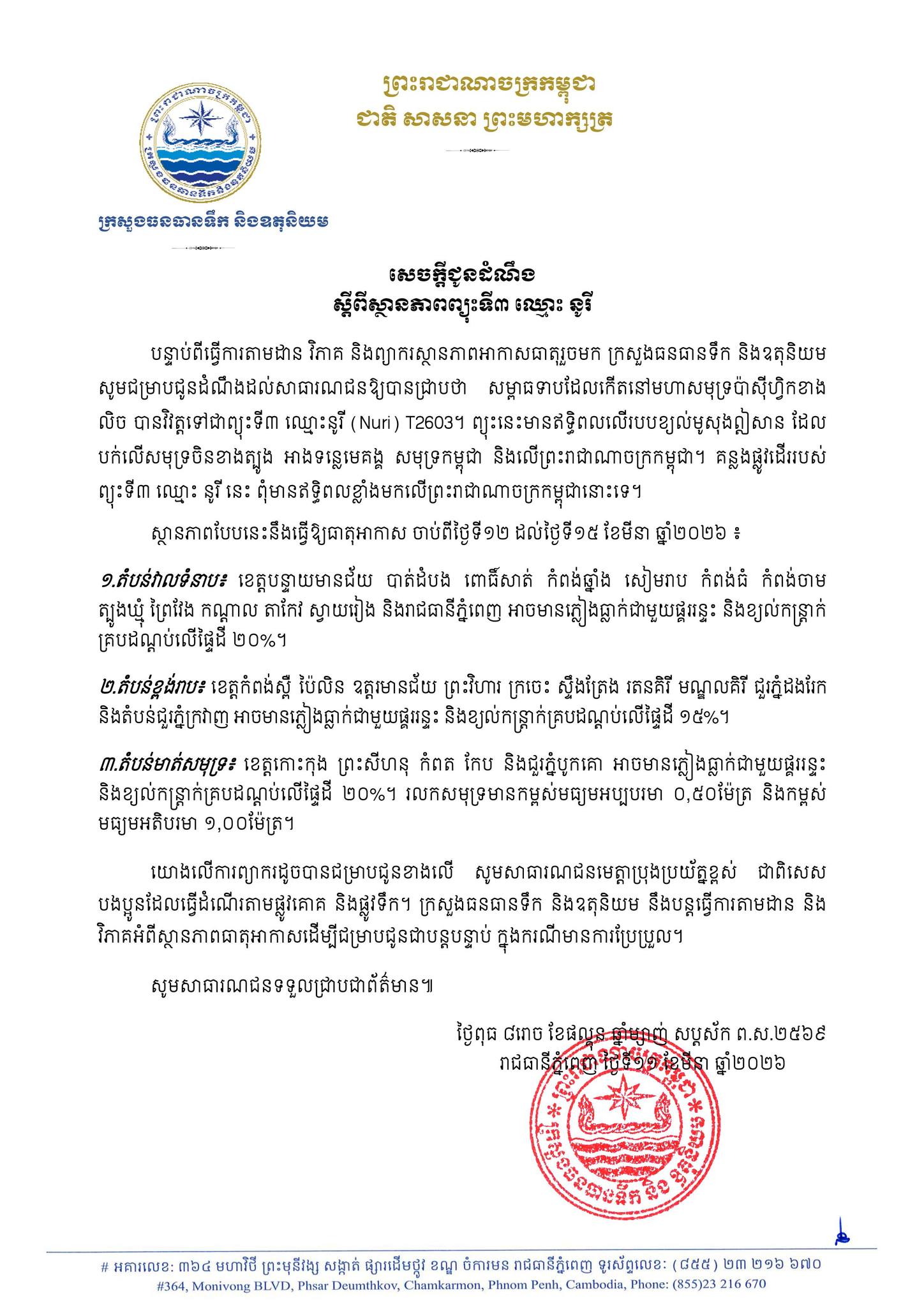 យោងតាមសេចក្តីជូនដំណឹង ស្តីពីស្ថានភាពព្យុះទី៣ ឈ្មោះ នូរីរបស់ក្រសួងធនធានទឹក នៅថ្ងៃទី១១ ខែមីនា ឆ្នាំ២០២៦ថា បន្ទាប់ពីធ្វើការតាមដាន វិភាគ និងព្យាករស្ថានភាពអាកាសធាតុរួចមក ក្រសួងធនធានទឹក និងឧតុនិយម សូមជម្រាបជូនដំណឹងដល់សាធារណជនឱ្យបានជ្រាបថា សម្ពាធទាបដែលកើតនៅមហាសមុទ្រប៉ាស៊ីហ្វិកខាង លិច បានវិវត្តទៅជាព្យុះទី៣ ឈ្មោះនូរី (Nuri) T2603 ។
