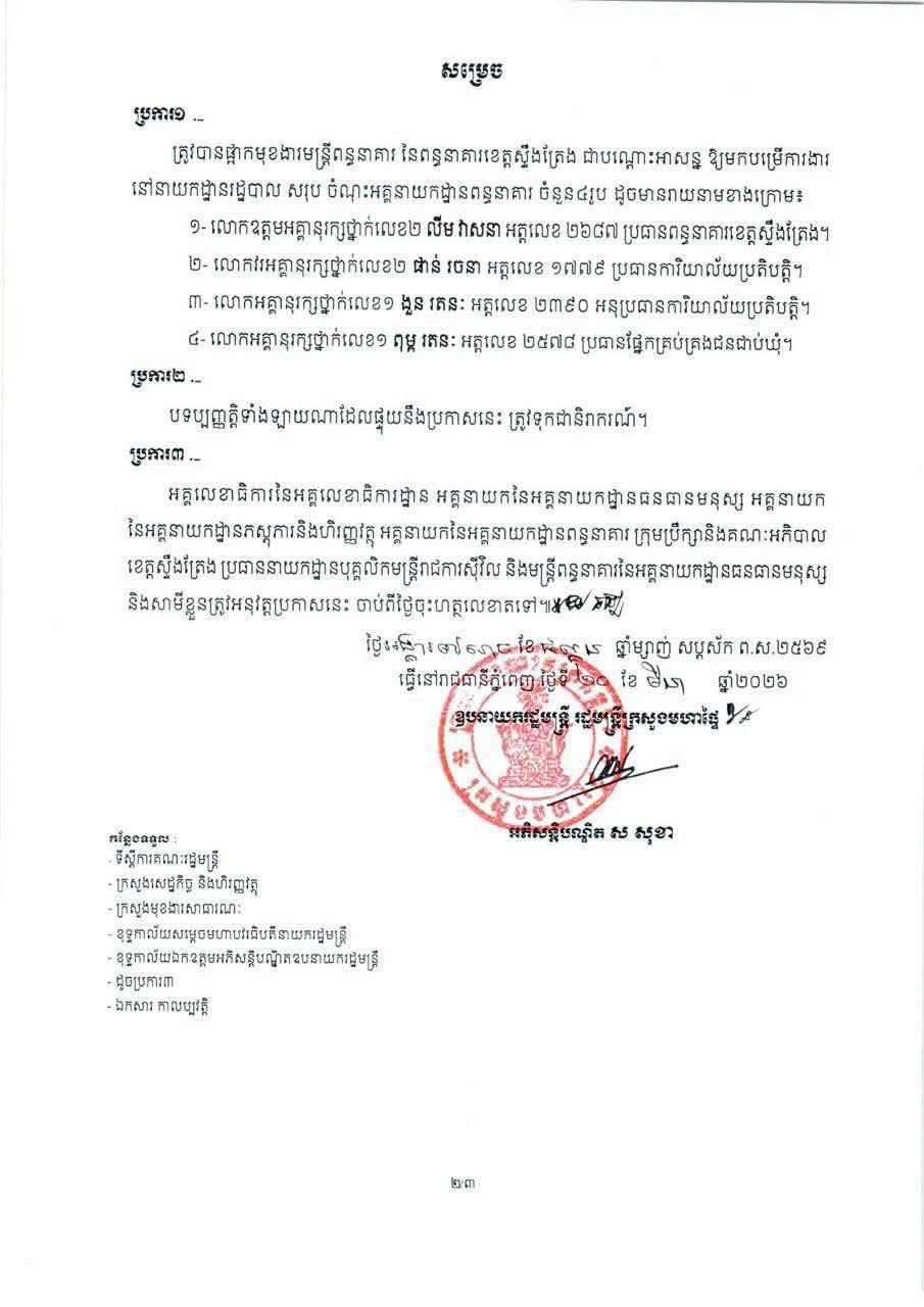 ខេត្តស្ទឹងត្រែង ៖ ឧបនាយករដ្ឋមន្ត្រី ស សុខា រដ្ឋមន្ត្រីក្រសួងមហាផ្ទៃ បានចេញសេចក្តីសម្រេចផ្អាកការងារ និងមុខតំណែងជាបណ្តោះអាសន្នចំពោះ លោក លីម វាសនា ប្រធានពន្ធនាគារខេត្តស្ទឹងត្រែង រួមជាមួយមន្ត្រីក្រោមឱវាទចំនួន ៣រូបផ្សេងទៀតជុំវិញករណីមិនប្រក្រតីនាពេលថ្មីៗ ។