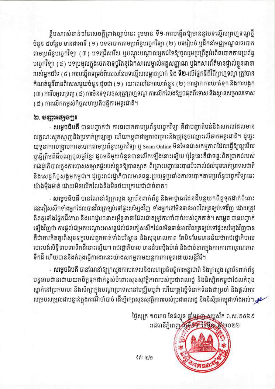 ក្នុងសេចក្តីប្រកាសព័ត៌មាននោះ សម្ដេចធិបតី បានគូសបញ្ជាក់ថា «ដូច្នេះ យុទ្ធនាការបង្ក្រាបការឆបោកតាមប្រព័ន្ធបច្ចេកវិទ្យា ឬ Scam Online មិនមែនជាសកម្មភាពដែលធ្វើឱ្យល្អមើល ឬធ្វើត្រឹមពិធីបុណ្យចូលឆ្នាំខ្មែរ ដូចមតិមួយចំនួនបានលើកឡើងនោះឡើយ ប៉ុន្តែនេះគឺជាឆន្ទៈពិតប្រាកដរបស់ រាជរដ្ឋាភិបាលក្នុងការបោសសម្អាតផ្ទះរបស់ខ្លួនឱ្យបានស្អាត ពីព្រោះបញ្ហានេះបានប៉ះពាល់ដល់មុខមាត់ប្រទេសជាតិ និងសេដ្ឋកិច្ចសង្គមកម្ពុជា។ ដូច្នេះរាជរដ្ឋាភិបាលមានឆន្ទៈប្រយុទ្ធប្រឆាំងការឆបោកតាមប្រព័ន្ធបច្ចេកវិទ្យានេះ យ៉ាងម៉ឺងម៉ាត់ ដោយមិនលើកលែងនិងមិនថយក្រោយជាដាច់ខាត» ។