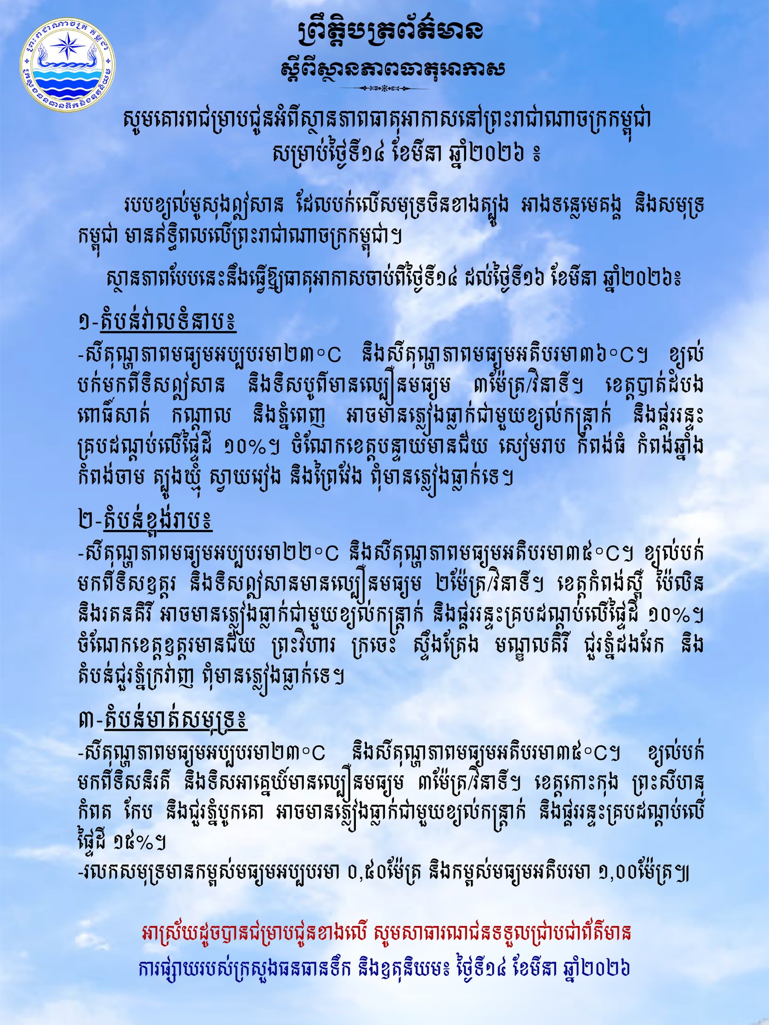(រាជធានីភ្នំពេញ)៖ ក្រសួងធនធានទឹក និងឧតុនិយម បានឱ្យដឹងថា ចាប់ពីថ្ងៃទី១៤ ដល់ថ្ងៃទី១៦ ខែមីនា ឆ្នាំ២០២៦ កម្ពុជានឹងបន្តទទួលរងឥទ្ធិពលពីខ្យល់មូសុង ដែលបង្កឱ្យមានអាកាសធាតុក្តៅហួតហែង លាយឡំជាមួយភ្លៀងកក់ខែតិចតួចនៅតាមបណ្តាតំបន់មួយចំនួន។