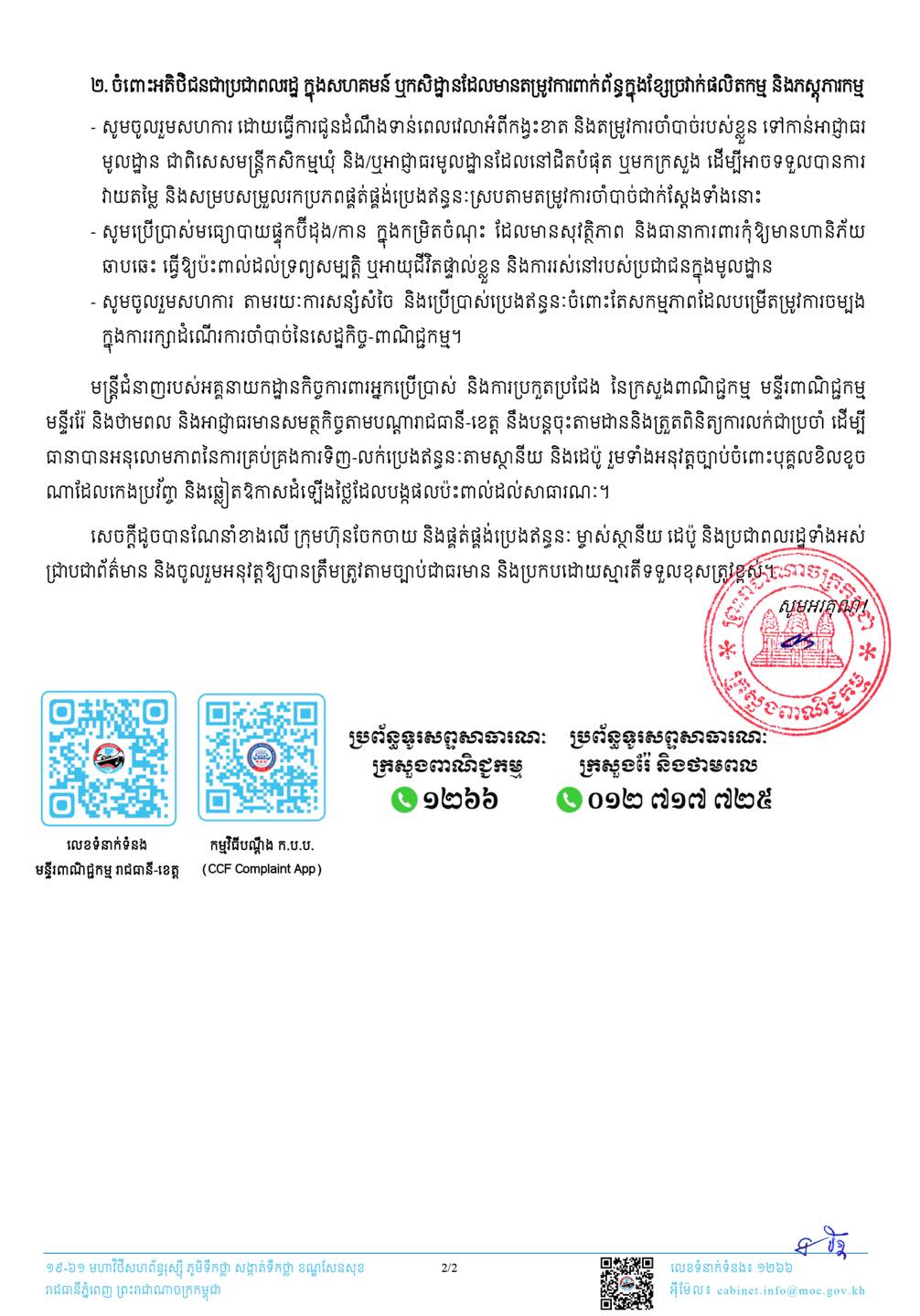 សេចក្តីដូចបានណែនាំខាងលើ ក្រុមហ៊ុនចែកចាយ និងផ្គត់ផ្គង់ប្រេងឥន្ធនៈ ម្ចាស់ស្ថានីយ ដេប៉ូ និងប្រជាពលរដ្ឋទាំងអស់ ជ្រាបជាព័ត៌មាន និងចូលរួមអនុវត្តឱ្យបានត្រឹមត្រូវ តាមច្បាប់ជាធរមាន និងប្រកបដោយស្មារតីទទួលខុសត្រូវខ្ពស់ ៕