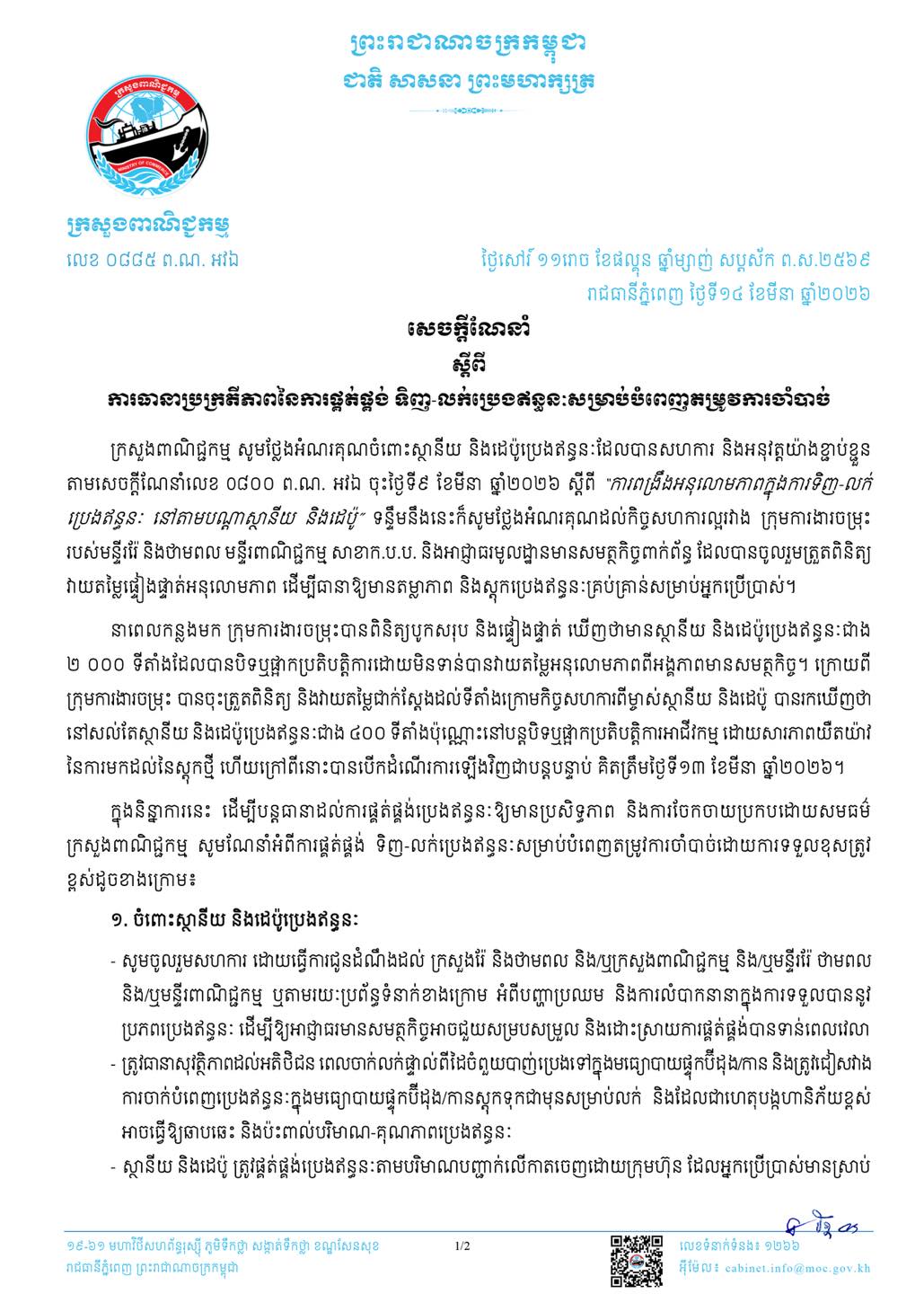 រាជធានីភ្នំពេញ ៖ ក្រសួងពាណិជ្ជកម្ម នៅថ្ងៃទី១៤ ខែមីនា ឆ្នាំ២០២៦ ចេញសេចក្តីណនាំ ស្តីពីការធានាប្រក្រតីភាព នៃការផ្គត់ផ្គង់ ទិញ-លក់ប្រេងឥន្ធនៈ សម្រាប់បំពេញតម្រូវការចាំបាច់ ។