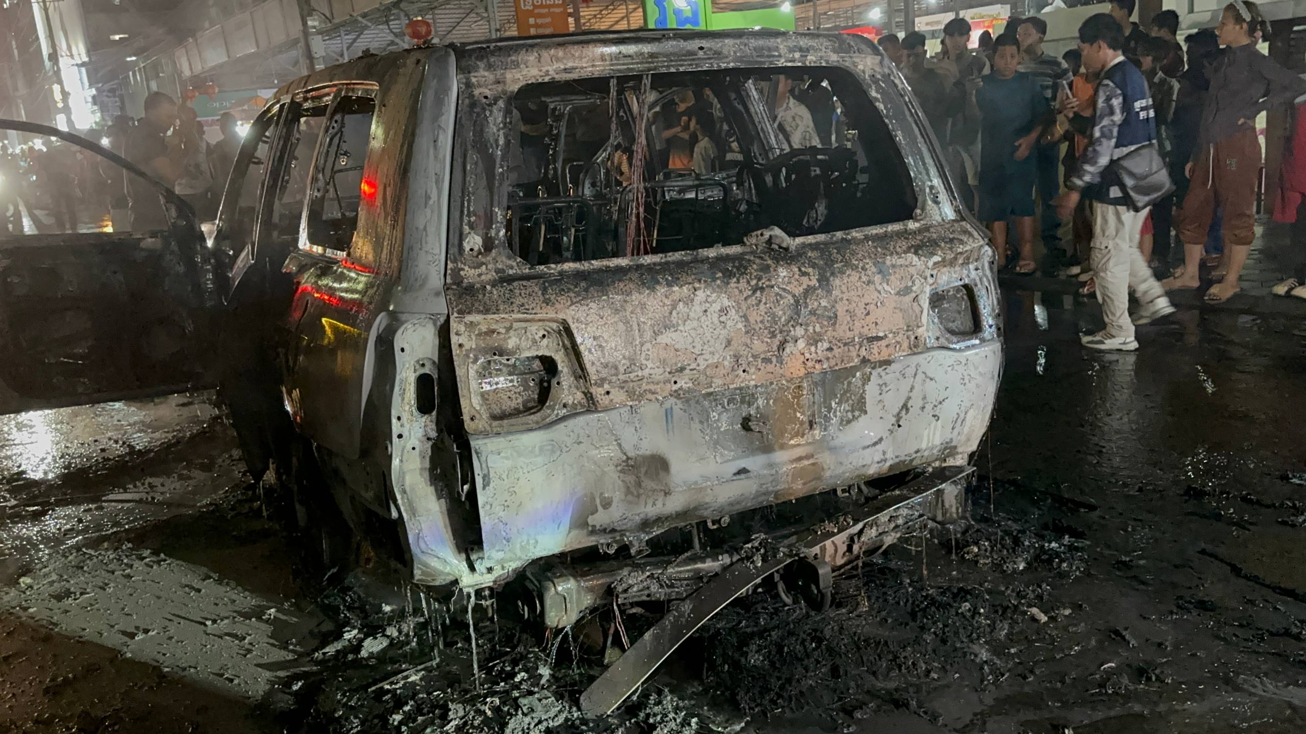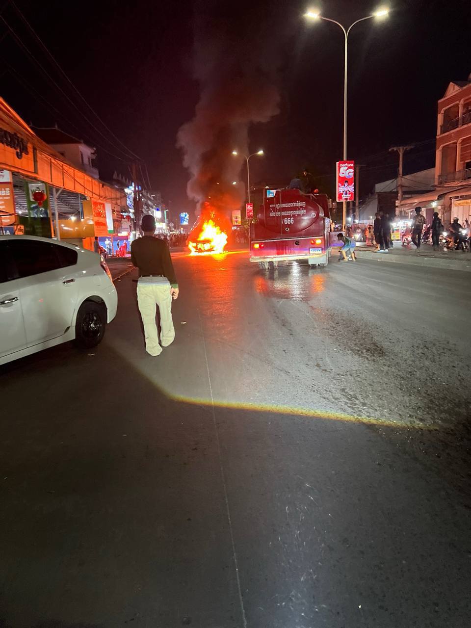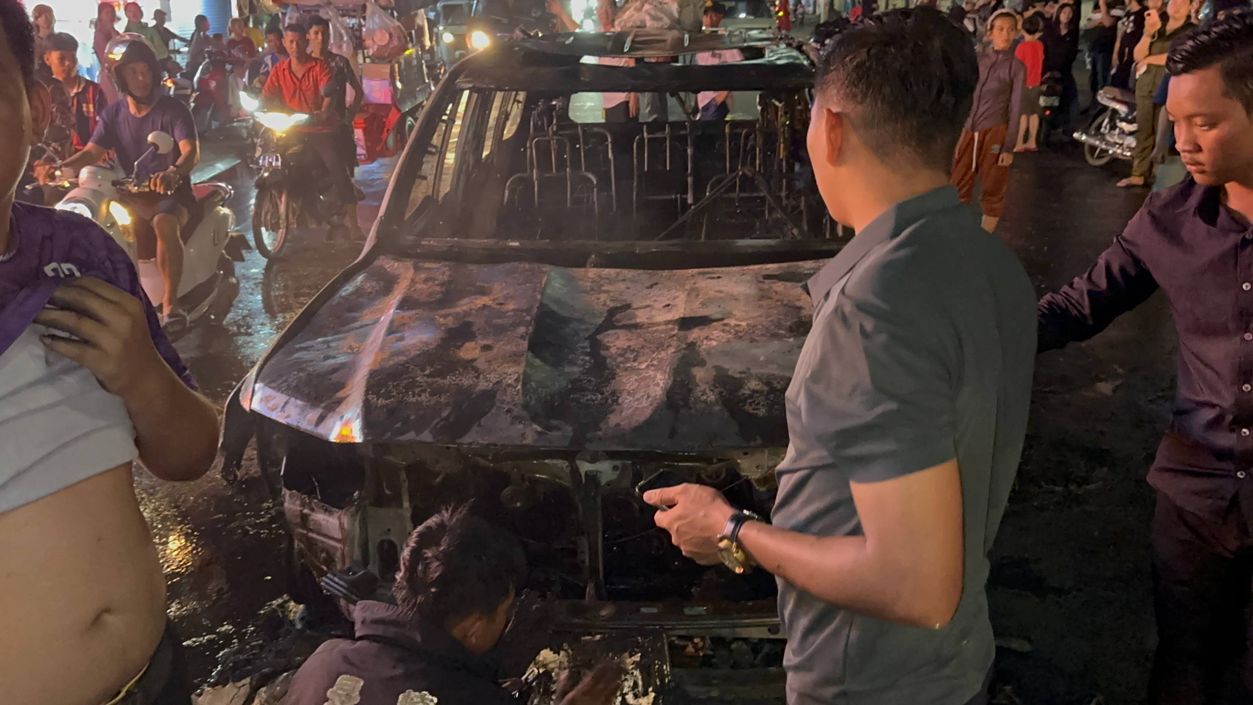 តាមប្រភពព័ត៍មានបានអោយដឹងថា មុនកើតហេតុ មានបុរសម្នាក់បើករថយន្តម៉ាកឡង់គ្រីស័រពណ៍សទំនើប១គ្រឿងតាមផ្លូវវេងស្រេងពីកាល់ណាស៊ីធីសំដៅទៅស្តុបលូ៥ សង្ស័យឆ្លងចរន្ត ស្រាប់តែមានអណ្តាតភ្លើងឆេះរថយន្ត១គ្រឿងនោះយ៉ាងសន្ធោសន្ធៅ ទោះបីប្រជាពលរដ្ឋខំយកបំពង់ពន្លត់អគ្គីភ័យទៅជួយបាញ់អស់ច្រើនបំពង់ នៅតែអណ្ដាតភ្លើងបន្តការឆាបឆេះ ភ្លាមៗនោះប្រជាពលរដ្ឋបានសុំកិច្ចអន្តរាគមន៍ពីអាជ្ញាធរ ដើម្បីហៅរថយន្តពន្លត់អគ្គីភ័យចេញមកបាញ់ពន្លត់ ។