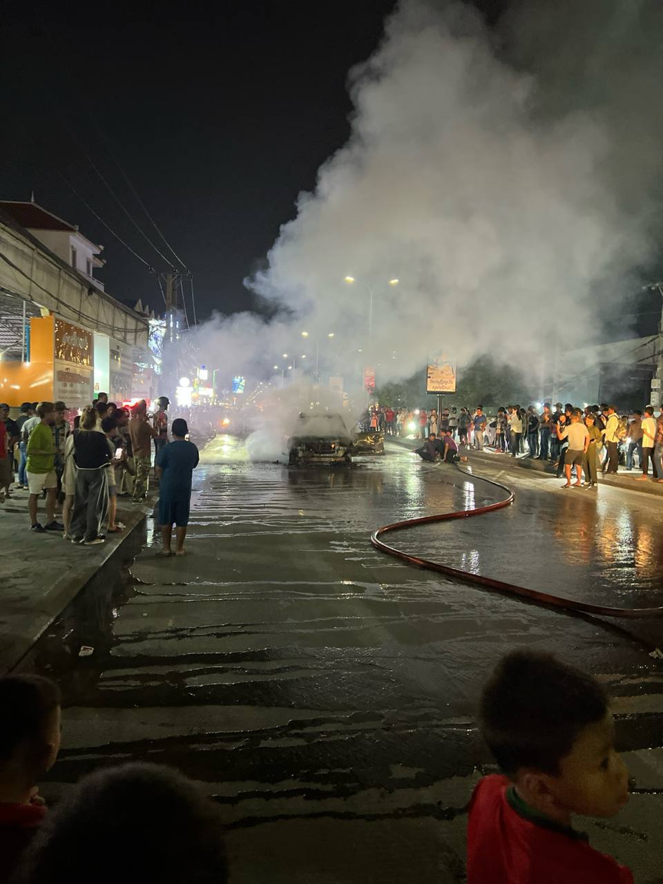 រាជធានីភ្នំពេញ ៖ រថយន្ត១គ្រឿងស៊េរីទំនើបម៉ាកឡង់គ្រីស្ស័រ ពណ៍ស ( ស្លាកលេខមើលមិនឃើញ ដោយសារភ្លើងឆាបឆេះខ្លាំងពេក) បើកសុខៗតាមផ្លូវ ស្រាប់តែមានអណ្ដាតភ្លើងឆេះយ៉ាងសន្ធោសន្ធៅ ហើយភ្លាមៗអ្នកបើករថយន្តនាំគ្នារត់ចេញមកខាងក្រៅ បង្កការភ្ញាក់ផ្អើលដល់ប្រជាពលរដ្ឋរាយការណ៍ទៅអាជ្ញាធរ ដើម្បីសុំរថយន្តពន្លត់អគ្គីភ័យចេញអន្តរាគមន៍ ។