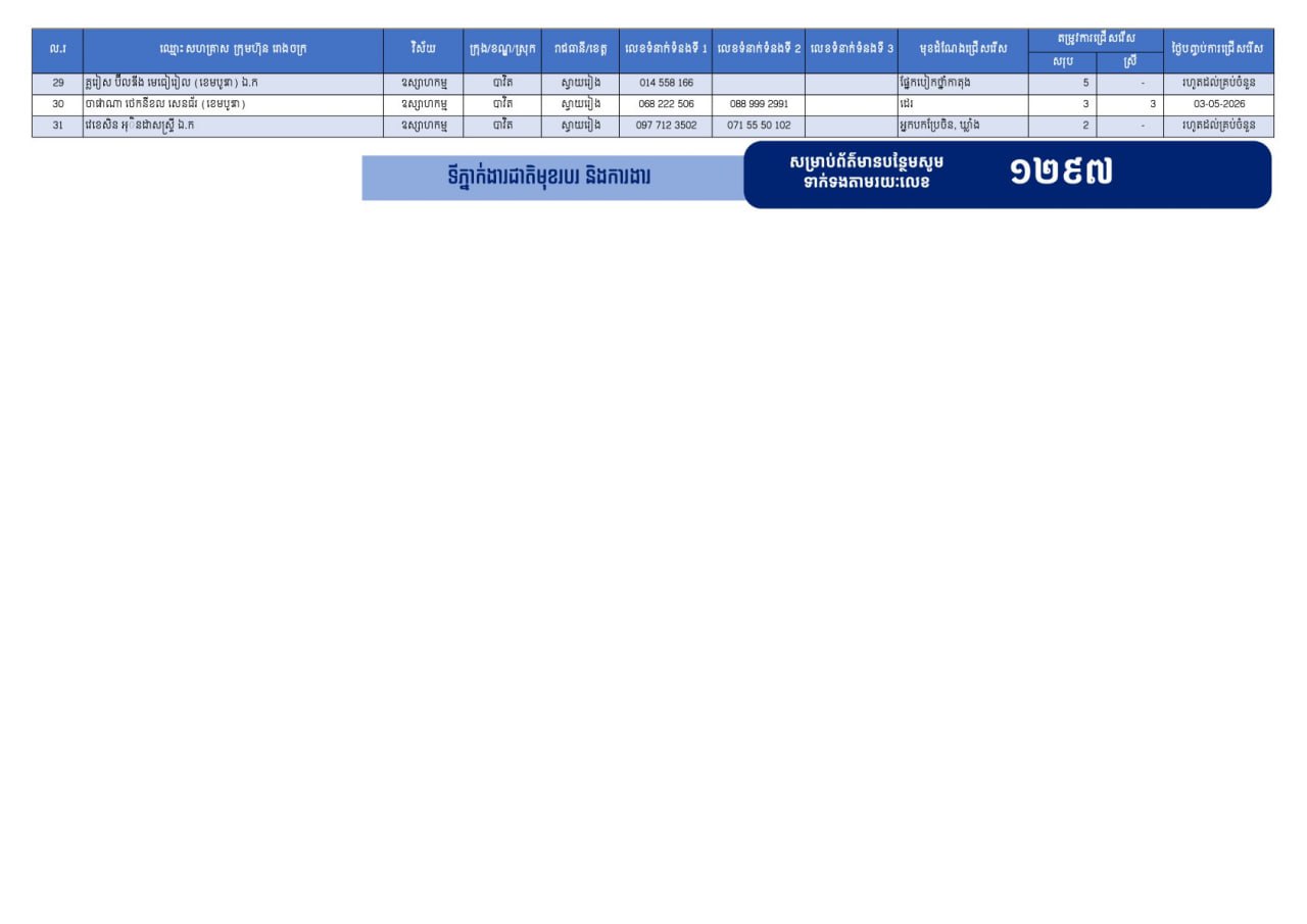 ជាមួយគ្នានេះ ក្រៅពីទំនាក់ទំនងផ្ទាល់ជាមួយក្រុមហ៊ុន រោងចក្រ សហគ្រាស អ្នកស្វែងរកការងារទាំងអស់ ជាពិសេសបងប្អូនអតីតពលករ ក៏អាចទាក់ទងមកប្រព័ន្ធទំនាក់ទំនងបន្ទាន់ ១២៩៧ ដើម្បីឱ្យក្រសួងការងារជួយសម្របសម្រួលស្វែងរកការងារជូនផងដែរ ។ នេះបើតាមក្រសួងការងារដដែល ៕ អត្ថបទសហការ
