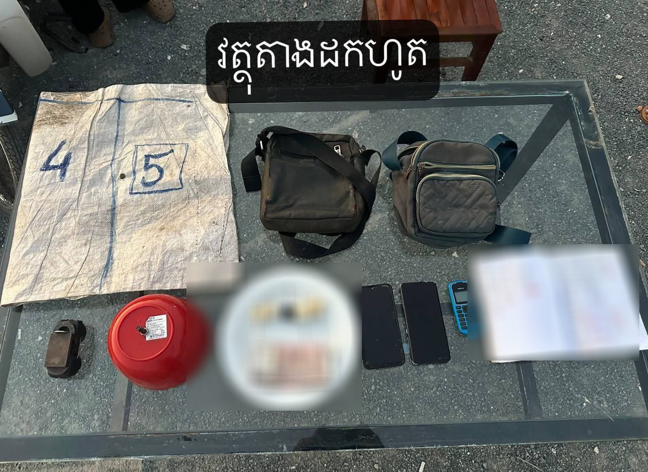 ដកហូតវត្ថុតាងរួមមាន÷ មេអាប៉ោងចំនួន០៥គ្រាប់ – មេដែកឆក់១ – ចាន០១ -គម្រប០១ ទូរស័ព្ទចំនួន០៣គ្រឿង -លុយចំនួន២៩០០០៛ -កាបូប០២ -សៀវភៅកត់កន្ទុយលេខ០១ក្បាល -ប៉ាយលេខ ចំនួន០១ និងម៉ូតូចំនួន០៣គ្រឿងផងដែរ។
