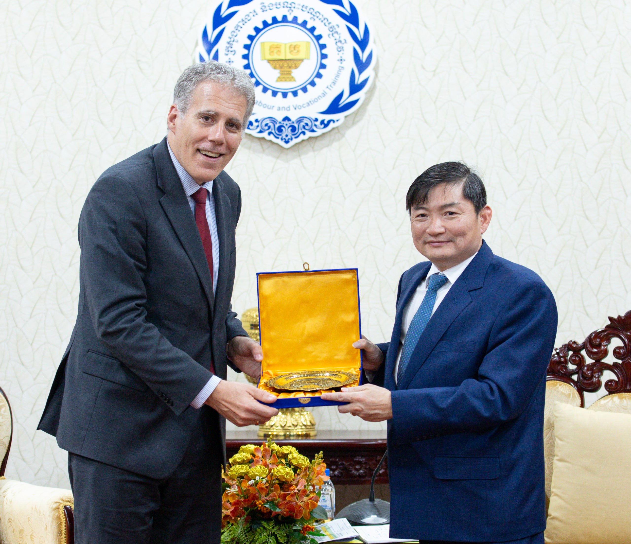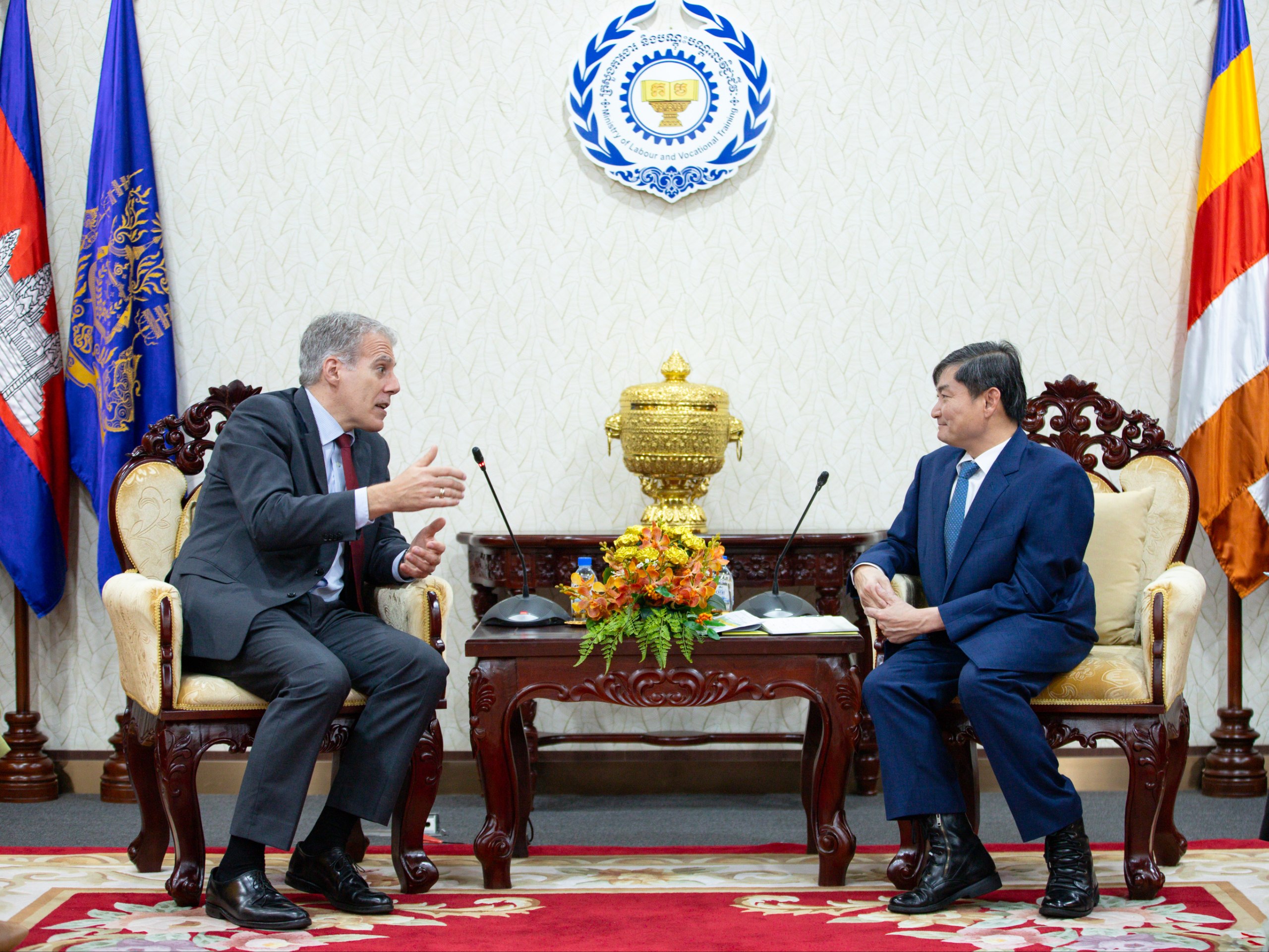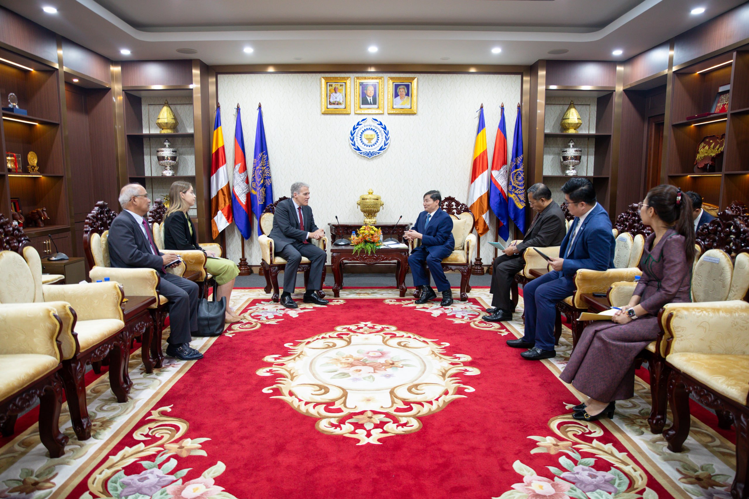 រាជធានីភ្នំពេញ៖ នារសៀលថ្ងៃពុធ ទី១៨ ខែមីនា ឆ្នាំ២០២៦ ឯកឧត្តម ហេង សួរ រដ្ឋមន្ត្រីក្រសួងការងារ និងបណ្តុះបណ្តាលវិជ្ជាជីវៈ បានអនុញ្ញាតឱ្យឯកឧត្តម គ្រីស្ទៀន ដេរ៉ូហ្ស (Christian DesRoches) ឯកអគ្គរដ្ឋទូតវិសាមញ្ញ និងពេញសមត្ថភាពនៃប្រទេសកាណាដាប្រចាំកម្ពុជា ចូលជួបសម្ដែងការគួរសម និងពិភាក្សាការងារ នៅទីស្តីការក្រសួង ដើម្បីពង្រឹងកិច្ចសហប្រតិបត្តិការទ្វេភាគីលើវិស័យការងារ សន្តិសុខសង្គម និងការបណ្តុះបណ្តាលវិជ្ជាជីវៈ ។