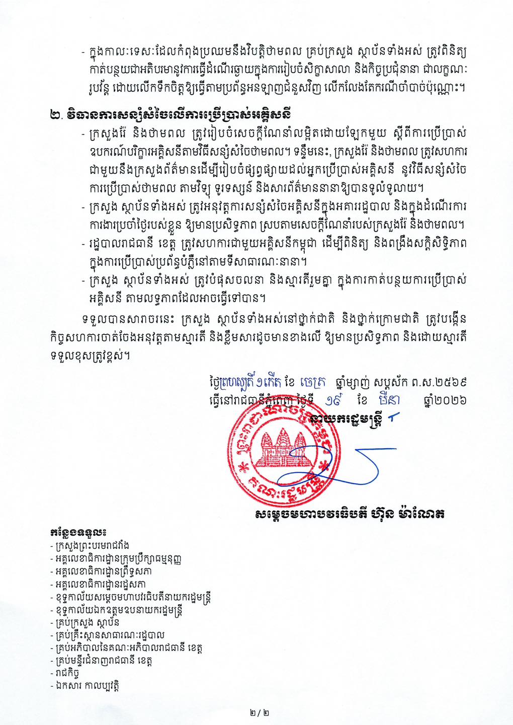 រាជធានីភ្នំពេញ ៖ រាជរដ្ឋាភិបាលកម្ពុជា នៅថ្ងៃទី១៩ ខែមីនា ឆ្នាំ២០២៦នេះ បានចេញសារាចរ ស្តីពី វិធានការសន្សំសំចៃលើការប្រើប្រាស់ប្រេងឥន្ធនៈ និងអគ្គិសនី នៅក្នុងប្រទេសកម្ពុជា ។