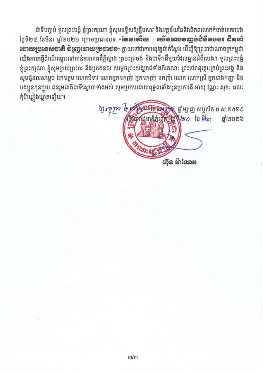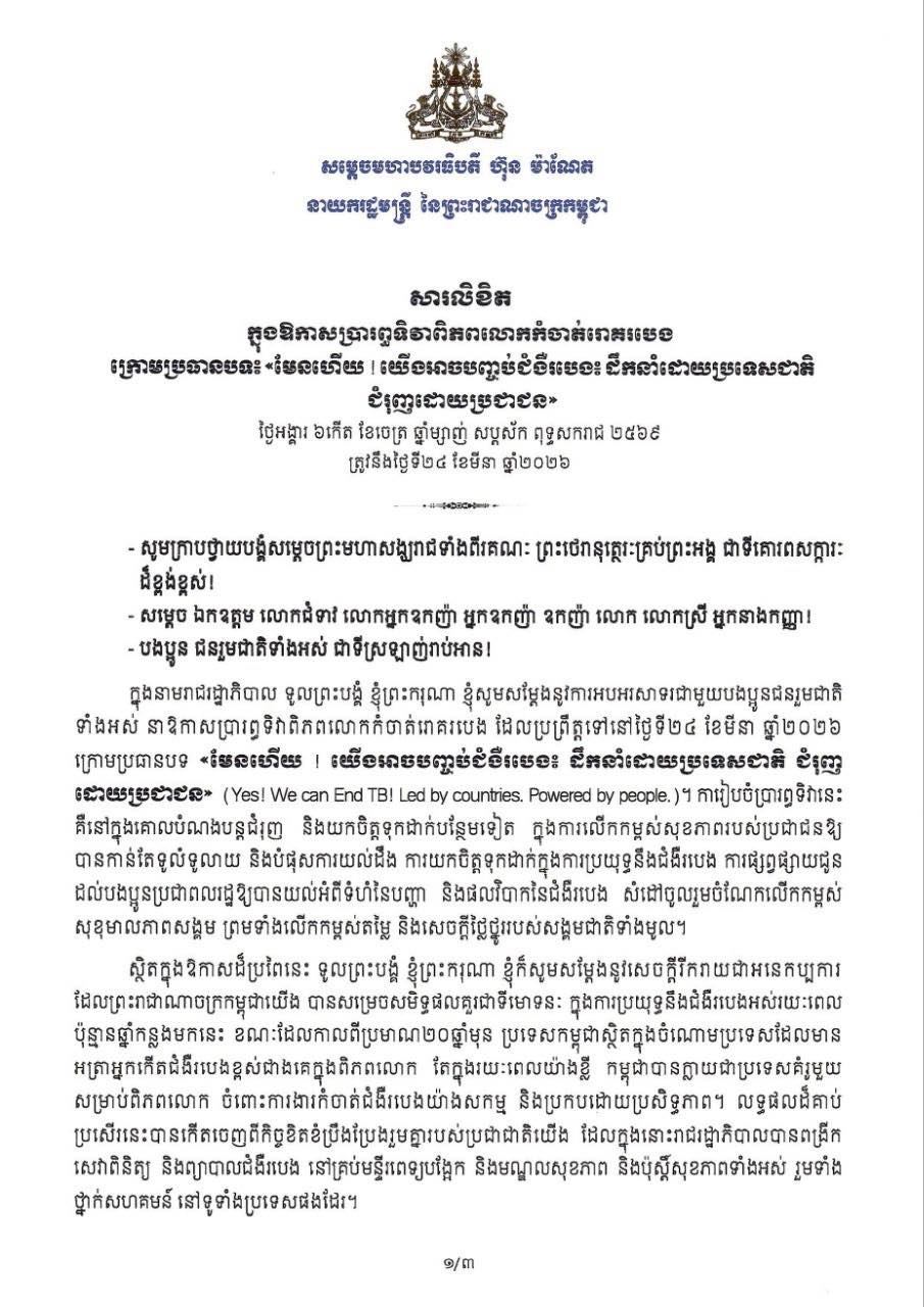 នៅក្នុងសារសម្រាប់ទិវាពិភពលោក កំចាត់រោគរបេង ២៤ មីនា សម្តេចធិបតី ហ៊ុន ម៉ាណែត បានកំណត់បង្ហាញថា កម្ពុជាពិតជាចង់បញ្ចប់វត្តមានជំងឺរបេងពីនៅក្នុងប្រទេស ។