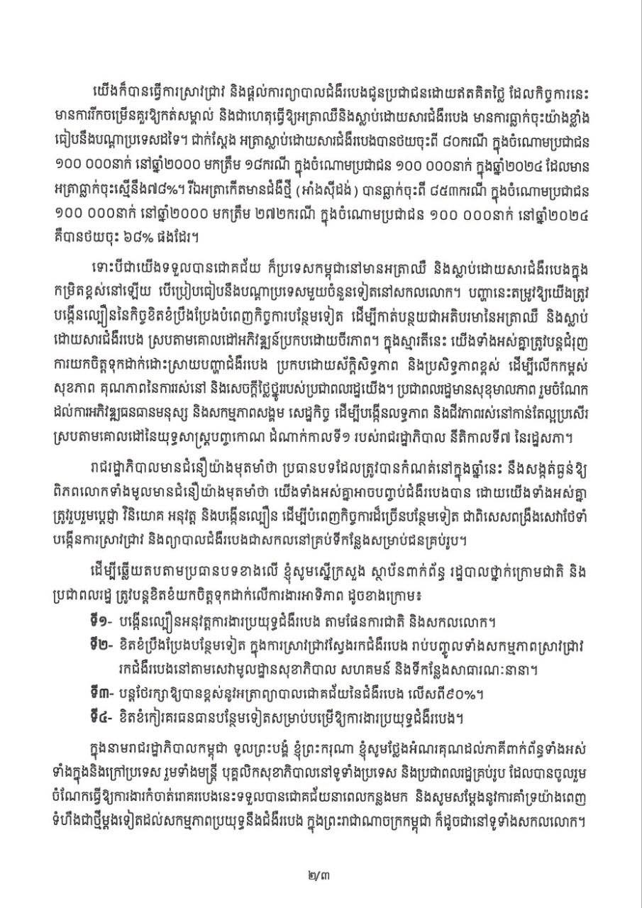 សម្តេចធិបតី បានលើកឡើងថា ប្រមាណជា២០ឆ្នាំមុន កម្ពុជាស្ថិតក្នុងចំណោមប្រទេស ដែលមានអត្រាអ្នកកើតរបេងខ្ពស់ជាងគេបំផុតនៅលើពិភពលោក ប៉ុន្តែតាមកំណត់ត្រាចុងក្រោយ ដែលបានធ្វើនៅក្នុង ឆ្នាំ២០២៤ មានការកត់ត្រាករណីនេះត្រឹមតែ ១៨នាក់ប៉ុណ្ណោះ នៅក្នុងចំណោមប្រជាពលរដ្ឋ ១០០.០០០ នាក់ ៕