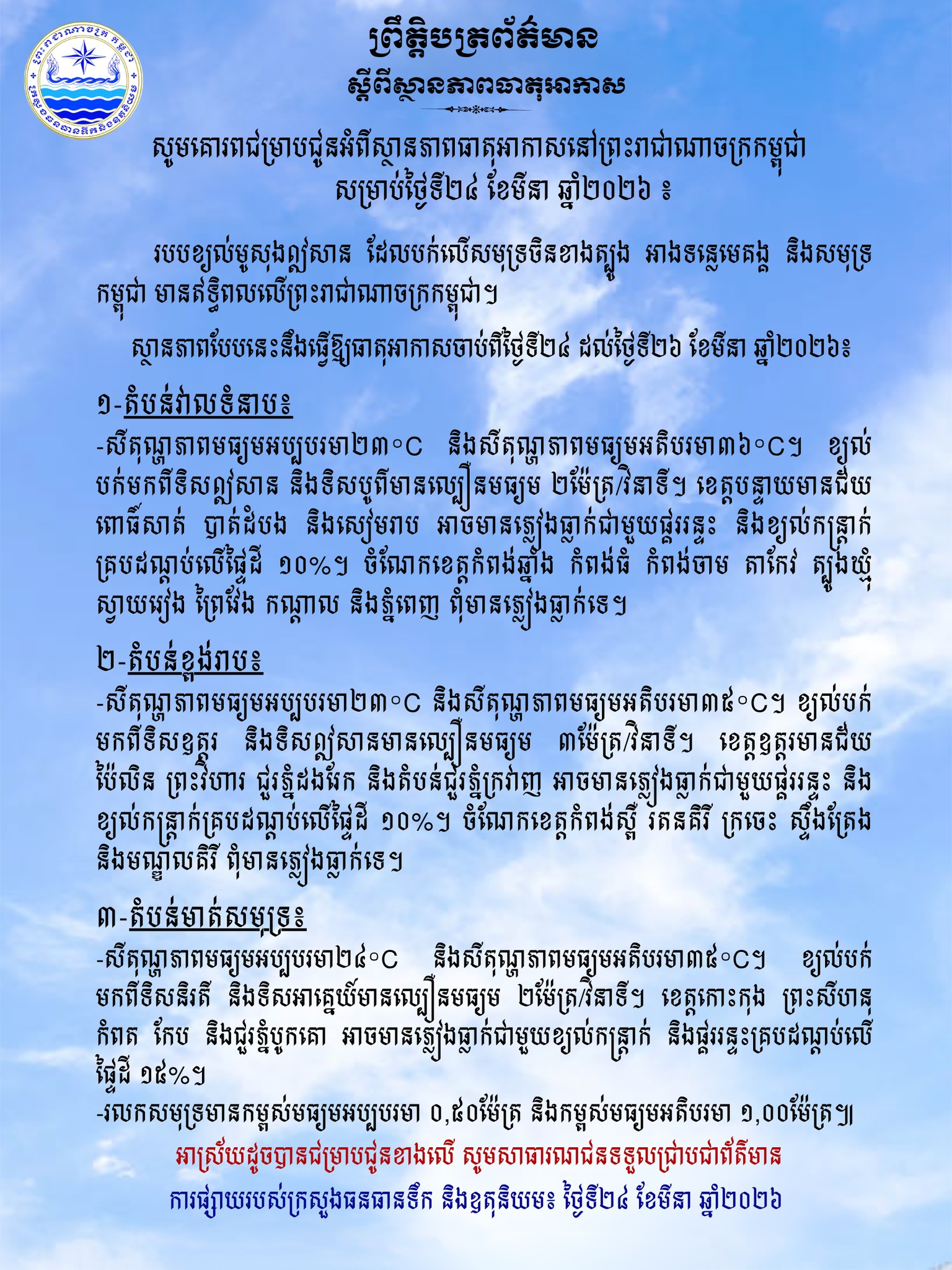 ប្រជាពលរដ្ឋទាំងអស់ បន្តតាមដានព័ត៌មានធាតុអាកាសឱ្យបានជាប់ជាប្រចាំ និងបង្កើនការប្រុងប្រយ័ត្នចំពោះបាតុភូតធម្មជាតិ ដើម្បីសុវត្ថិភាពក្នុងការធ្វើដំណើរ និងការរស់នៅប្រចាំថ្ងៃ៕