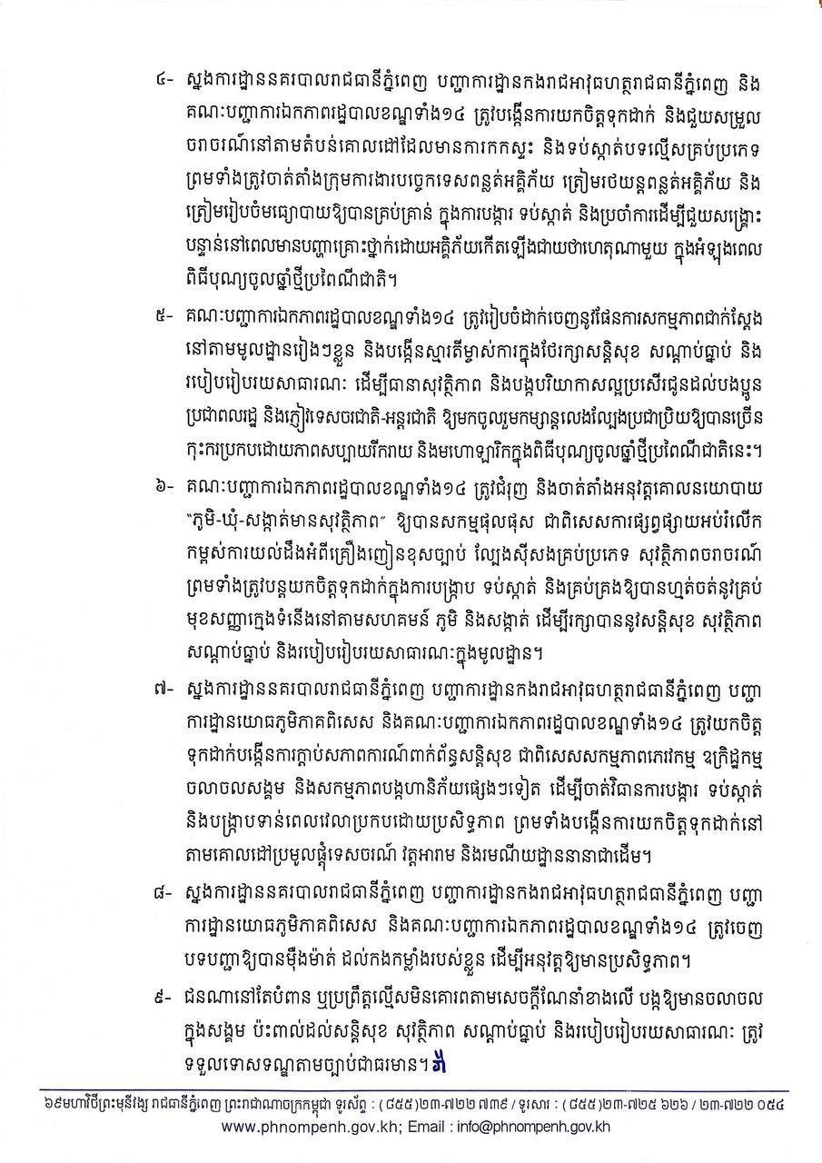 ៤- ស្នងការដ្ឋាននគរបាលរាជធានីភ្នំពេញ បញ្ជាការដ្ឋានកងរាជអាវុធហត្ថរាជធានីភ្នំពេញ និង គណៈបញ្ជាការឯកភាពរដ្ឋបាលខណ្ឌទាំង១៤ ត្រូវបង្កើនការយកចិត្តទុកដាក់ និងជួយសម្រួល ចរាចរណ៍នៅតាមតំបន់គោលដៅដែលមានការកកស្ទះ និងទប់ស្កាត់បទល្មើសគ្រប់ប្រភេទ ព្រមទាំងត្រូវចាត់តាំងក្រុមការងារបច្ចេកទេសពន្លត់អគ្គិភ័យ ត្រៀមរថយន្តពន្លត់អគ្គិភ័យ និង ត្រៀមរៀបចំមធ្យោបាយឱ្យបានគ្រប់គ្រាន់ ក្នុងការបង្ការ ទប់ស្កាត់ និងប្រចាំការដើម្បីជួយសង្គ្រោះ បន្ទាន់នៅពេលមានបញ្ហាគ្រោះថ្នាក់ដោយអគ្គិភ័យកើតឡើងជាយថាហេតុណាមួយ ក្នុងអំឡុងពេល ពិធីបុណ្យចូលឆ្នាំថ្មីប្រពៃណីជាតិ។