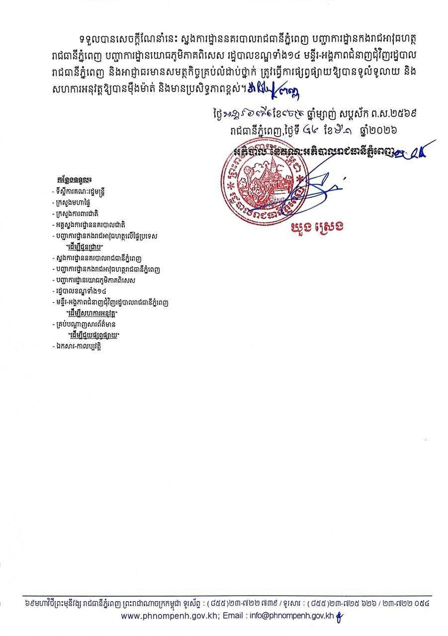 ទទួលបានសេចក្តីណែនាំនេះ ស្នងការដ្ឋាននគរបាលរាជធានីភ្នំពេញ បញ្ជាការដ្ឋានកងរាជអាវុធហត្ថ រាជធានីភ្នំពេញ បញ្ជាការដ្ឋានយោធភូមិភាគពិសេស រដ្ឋបាលខណ្ឌទាំង១៤ មន្ទីរ-អង្គភាពជំនាញជុំវិញរដ្ឋបាល រាជធានីភ្នំពេញ និងអាជ្ញាធរមានសមត្ថកិច្ចគ្រប់លំដាប់ថ្នាក់ ត្រូវធ្វើការផ្សព្វផ្សាយឱ្យបានទូលំទូលាយ និង សហការអនុវត្តឱ្យបានម៉ឺងម៉ាត់ និងមានប្រសិទ្ធភាពខ្ពស់ ៕
