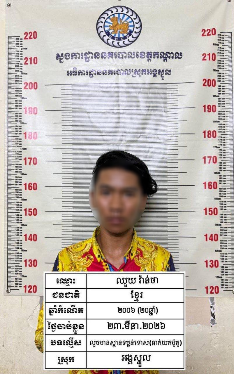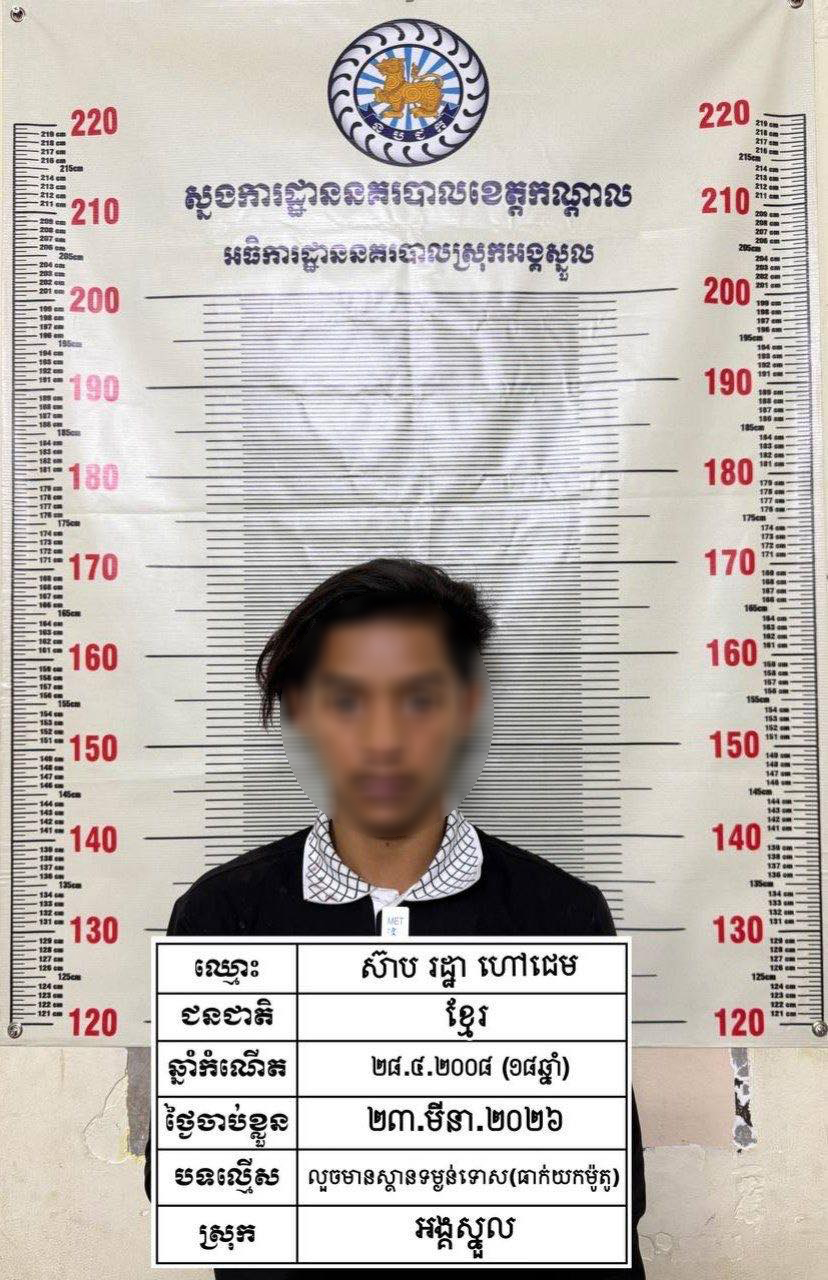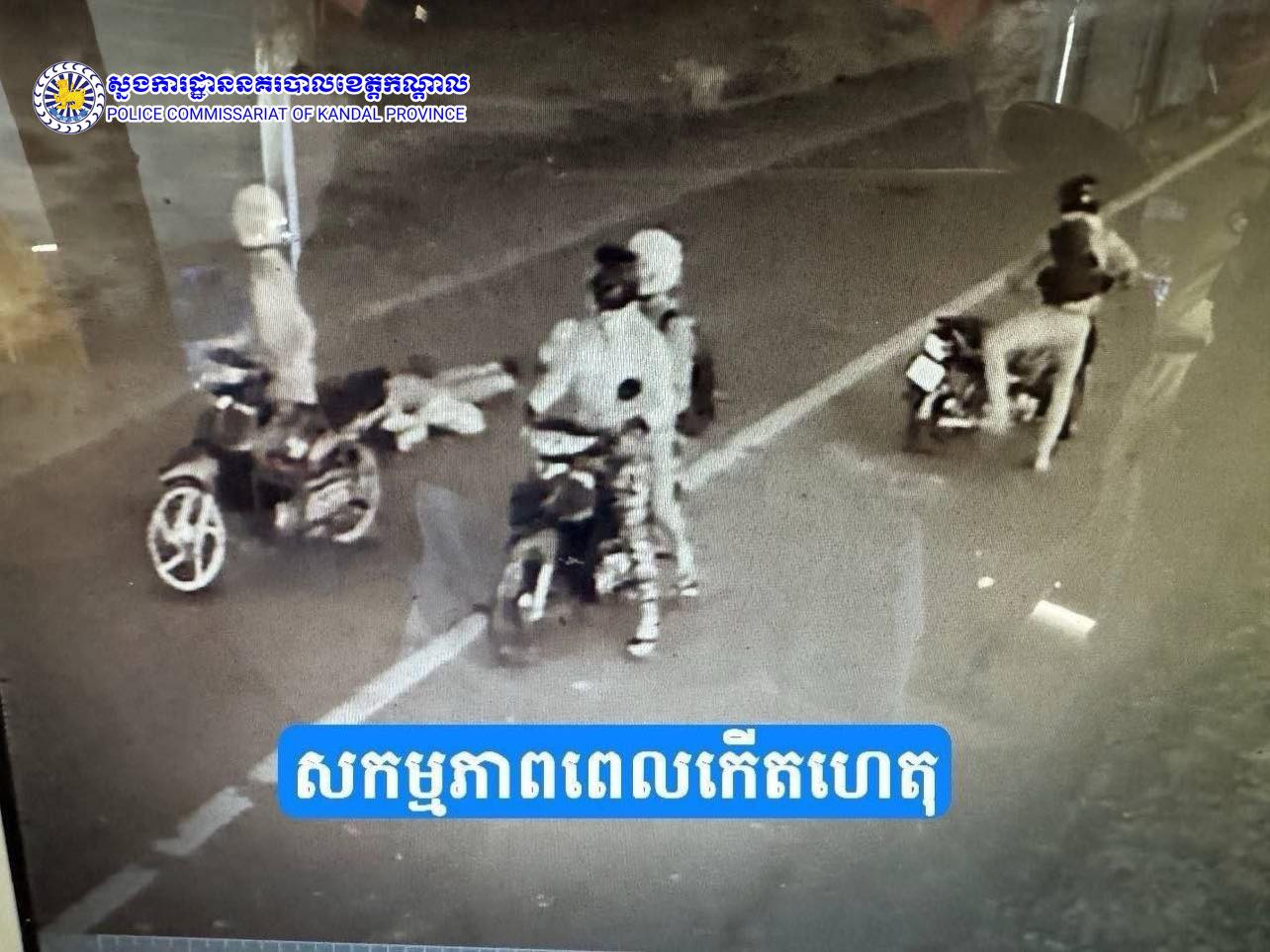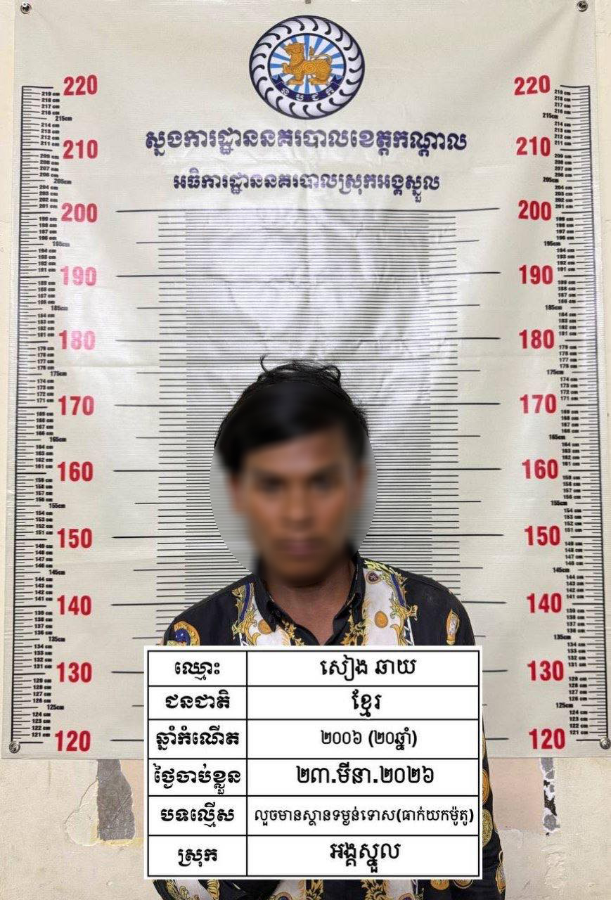 ករណីធាក់យកម៉ូតូ កើតឡើងកាលពីវេលាម៉ោង០៥ និង៤០នាទីថ្ងៃទី២៣ ខែមីនា ឆ្នាំ២០២៦ នៅចំណុចផ្លូវកៅស៊ូ ភូមិស្វាយឧត្តម ឃុំសំរោងលើ ស្រុកអង្គស្នួល ខេត្តកណ្តាល ។