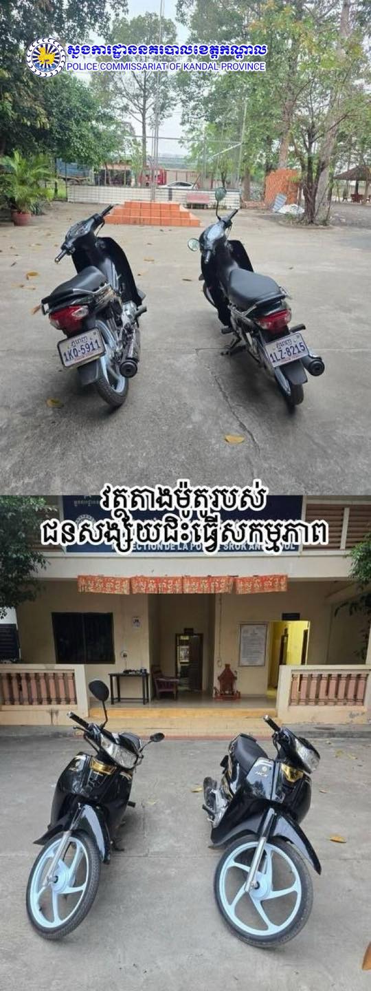ខេត្តកណ្តាល ៖ ដោយអនុវត្តតាមបទបញ្ជាលោកឧត្តមសេនីយ៍ទោ ឈឿន សុចិត្ត ស្នងការនគរបាលខេត្តកណ្តាល កម្លាំងជំនាញខេត្ត សហការជាមួយកម្លាំងជំនាញ នៃអធិការដ្ឋាននគរបាលស្រុកអង្គស្នួល សហការជាមួយកម្លាំងជំនាញ នៃស្នងការដ្ឋាននគរបាលខេត្តកំពង់ស្ពឺ បានស្រាវជ្រាវបង្ក្រាបឃាត់ខ្លួនជនសង្ស័យចំនួន០៤នាក់ ក្នុងករណីលួចមានស្ថានទម្ថន់ទោស (ធាក់យកម៉ូតូ) ។