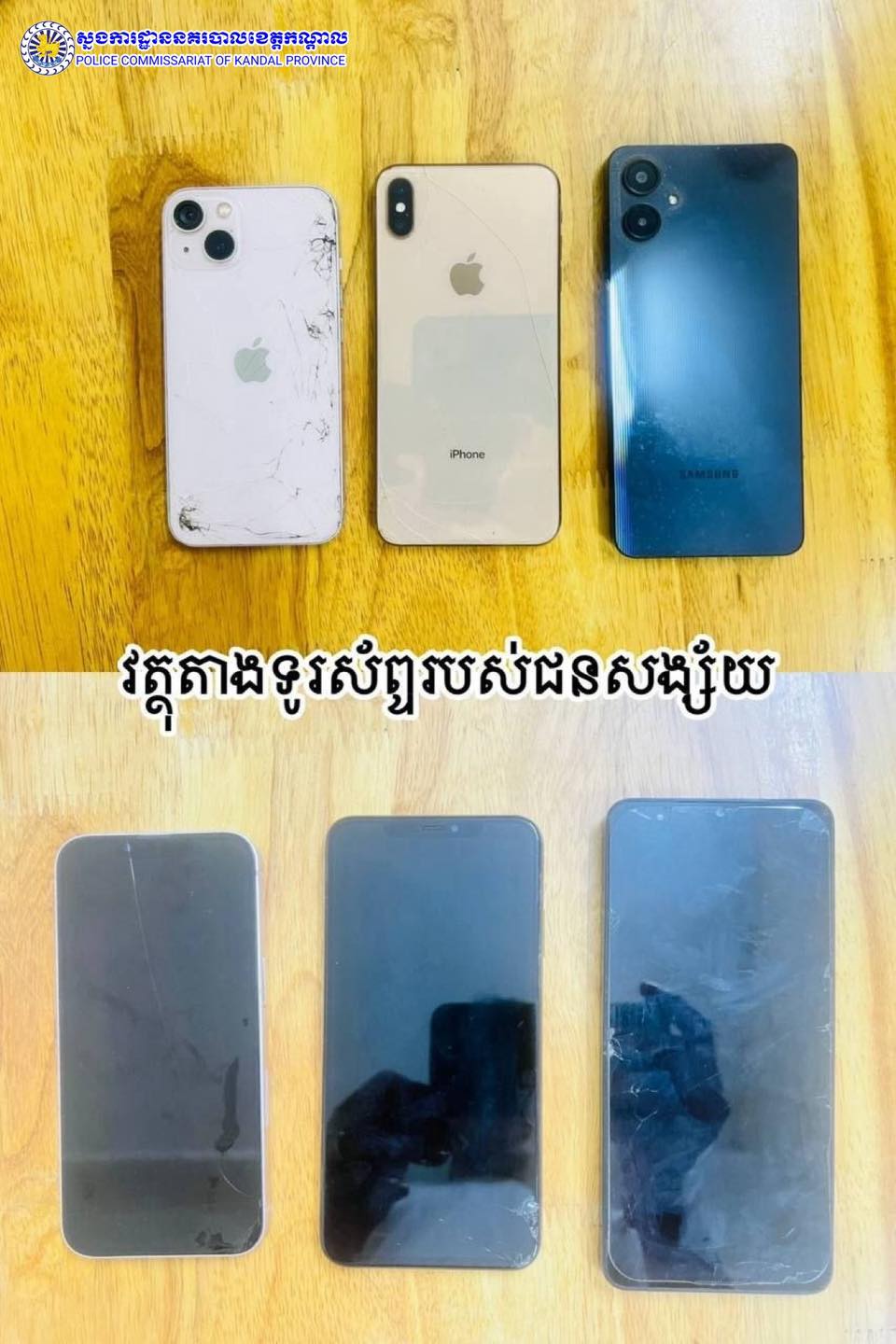 ៣.ទូរសព្ទចំនួន០៣គ្រឿង ក្នុងនោះម៉ាកអាយហ្វូនចំនួន០២គ្រឿង និងម៉ាកសាំសុង០១គ្រឿង (ជារបស់ជនសង្ស័យ)។