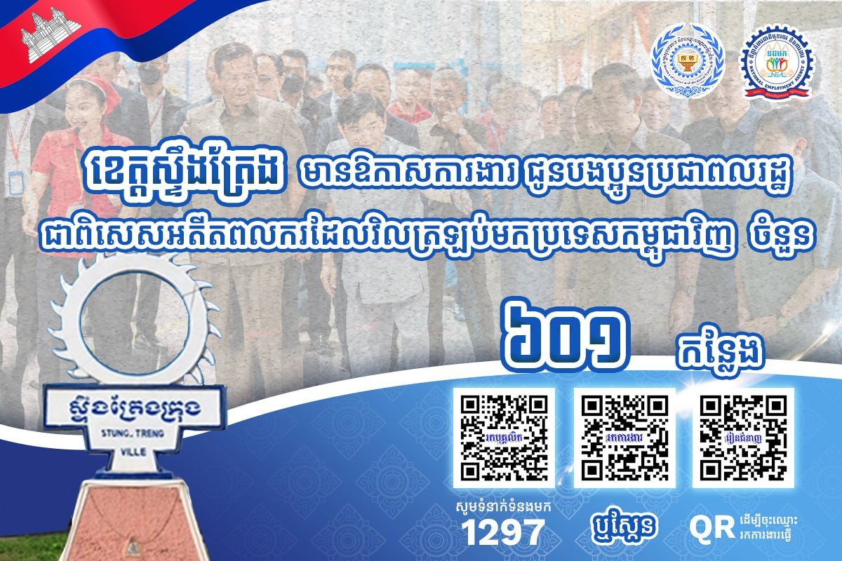 សេចក្ដីជូនដំណឹងរបស់ក្រសួងការងារ បានឱ្យដឹងថា គិតត្រឹមថ្ងៃទី២៨ ខែមីនា ឆ្នាំ២០២៦នេះ ខេត្តដែលស្ថិតនៅភូមិភាគឦសាន្តរួមមាន ខេត្តក្រចេះ ស្ទឹងត្រែង រតនគិរី និងខេត្តមណ្ឌលគិរី មានឱកាសការងារសរុបចំនួន ៣,៧៨៨កន្លែង កំពុងរង់ចាំបងប្អូនអតីតពលករត្រឡប់មកពីប្រទេសថៃ និងអ្នកកំពុងស្វែងរកការងារធ្វើក្នុងវិស័យកសិកម្ម ឧស្សាហកម្ម និងវិស័យសេវាកម្ម ។