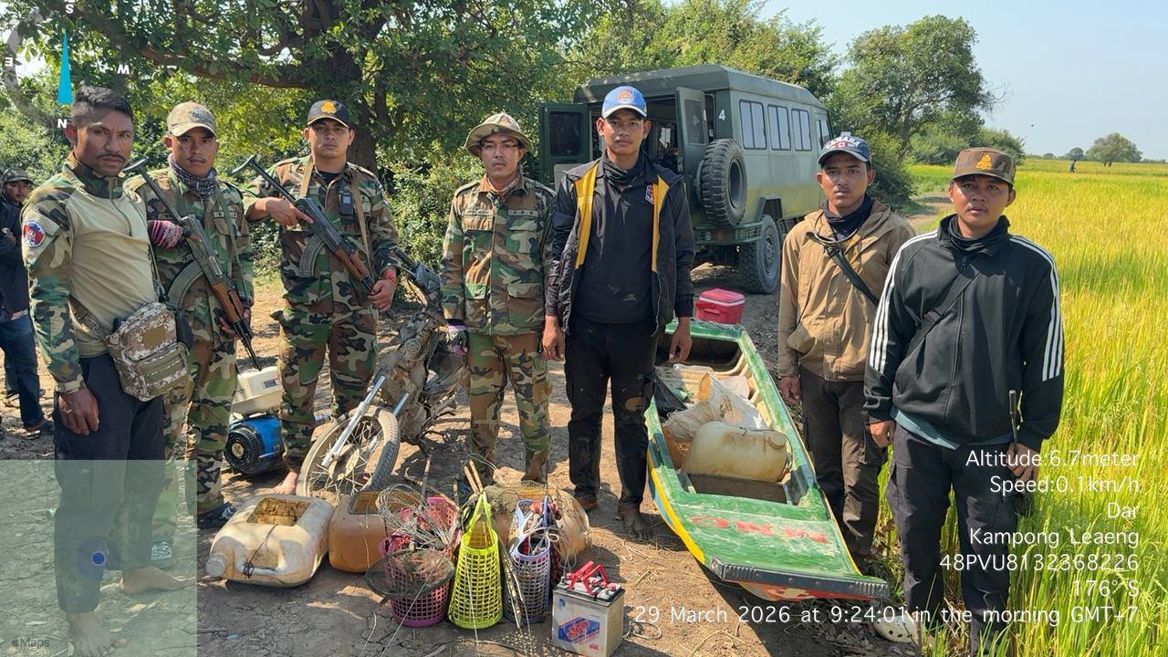 នៅខេត្តកំពង់ឆ្នាំង ថ្ងៃទី២៩ ខែមីនា ឆ្នាំ ២០២៦ កងកម្លាំងកងពលតូចលេខ៧០ ចំនួន២៤នាក់ សហការជាមួយអាជ្ញាធរមូលដ្ឋាន ចុះល្បាតបង្ក្រាបបទល្មើសនេសាទខុសច្បាប់ និងដកហូតបាន (ទូកបាឡា ១គ្រឿង, ម៉ាស៊ីនទូក១គ្រឿង, អាគុយ ៤គ្រាប់, ដងឆក់ ៤គូ, ខ្សែភ្លើង ១២ ម៉ែត្រ) ក្នុងភូមិសាស្ត្រ ឃុំស្វាយរំពារ ស្រុកកំពង់លែង ខេត្តកំពង់ឆ្នាំង ។