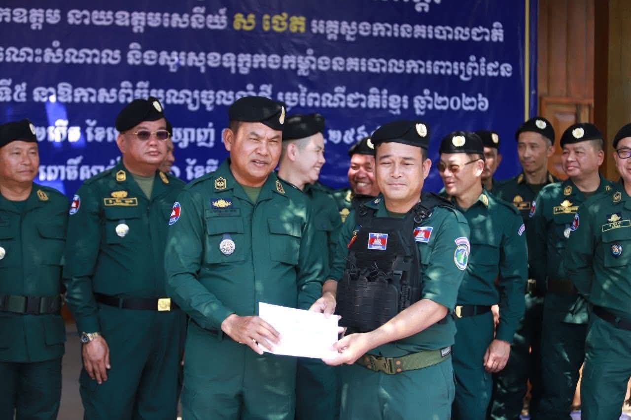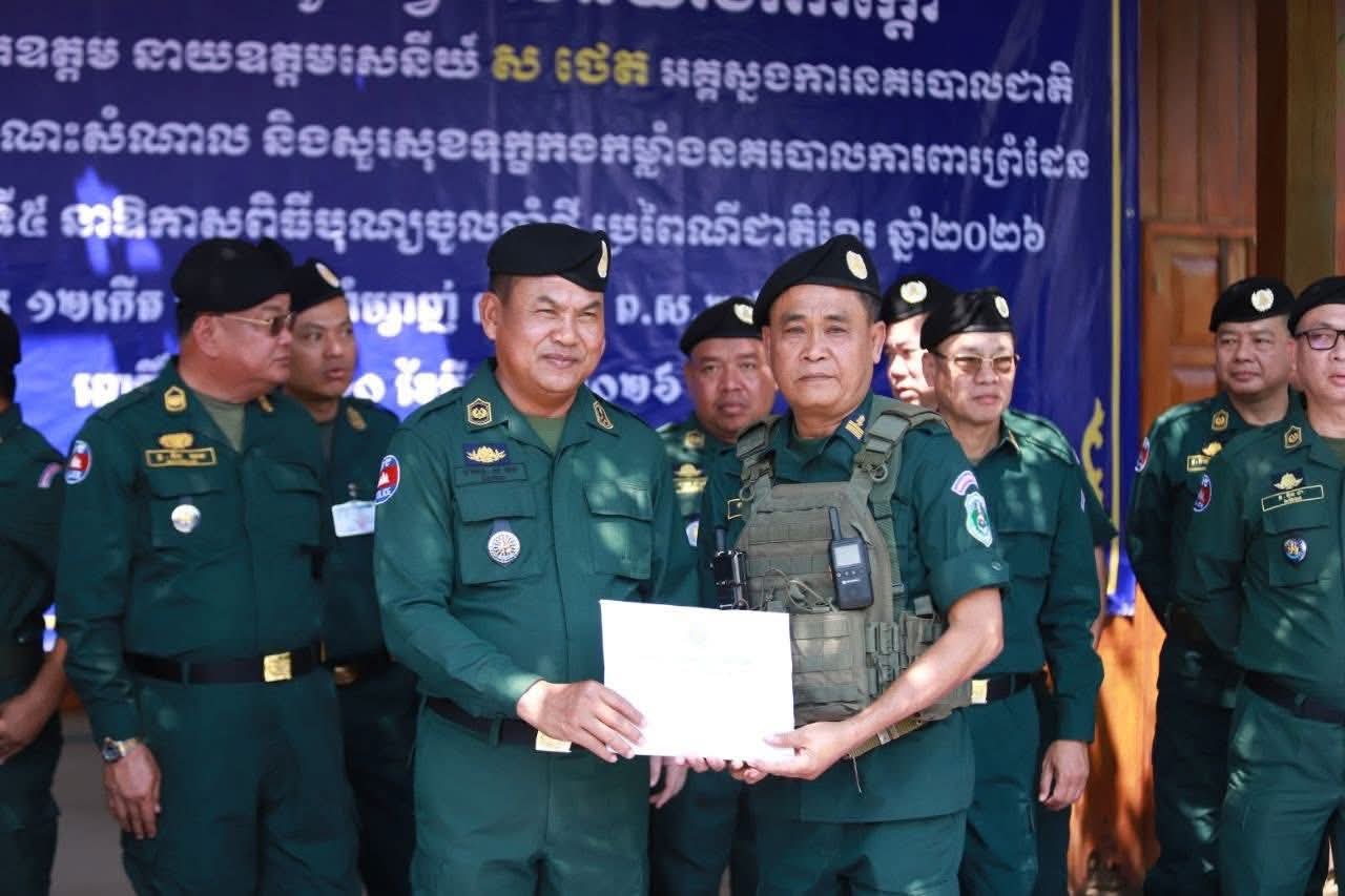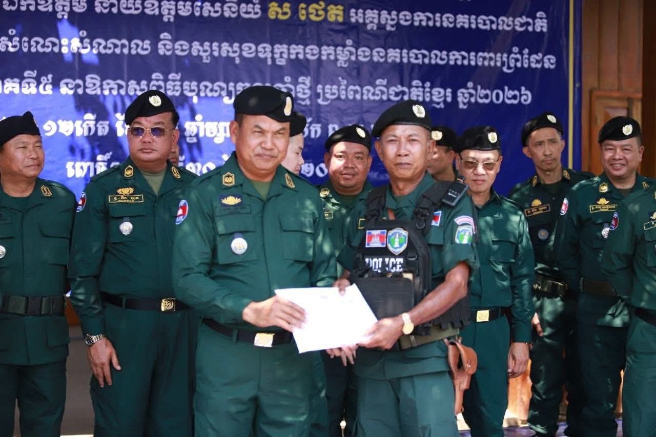 ខេត្តពោធិ៍សាត់ ៖ នាឱកាសដ៏វិសេសវិសាល នៃពិធីបុណ្យចូលឆ្នាំថ្មី ប្រពៃណីជាតិខ្មែរ ឆ្នាំ២០២៦ ខាងមុខនេះ លោកនាយឧត្តមសេនីយ៍ ស ថេត អគ្គស្នងការនគរបាលជាតិ បានអញ្ជើញចុះជួបសំណេះសំណាល និងសួរសុខទុក្ខផ្ទាល់ដល់កងកម្លាំងនគរបាលការពារព្រំដែន ប្រចាំទិសភូមិភាគទី៥ ដើម្បីលើកទឹកចិត្តដល់ស្មារតីលះបង់របស់កងកម្លាំង ដែលកំពុងឈរជើងបំពេញភារកិច្ចការពារបូរណភាពទឹកដី ។