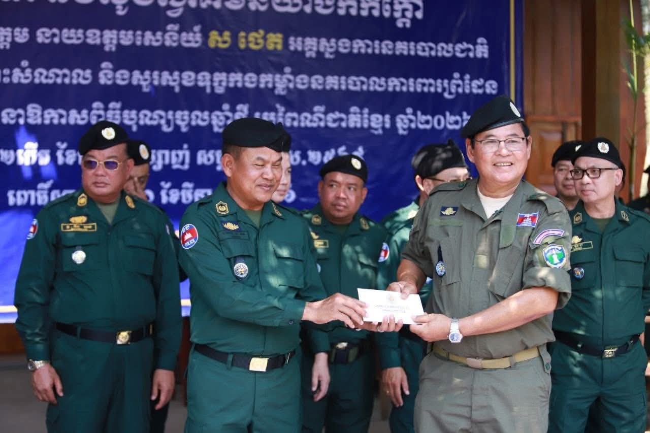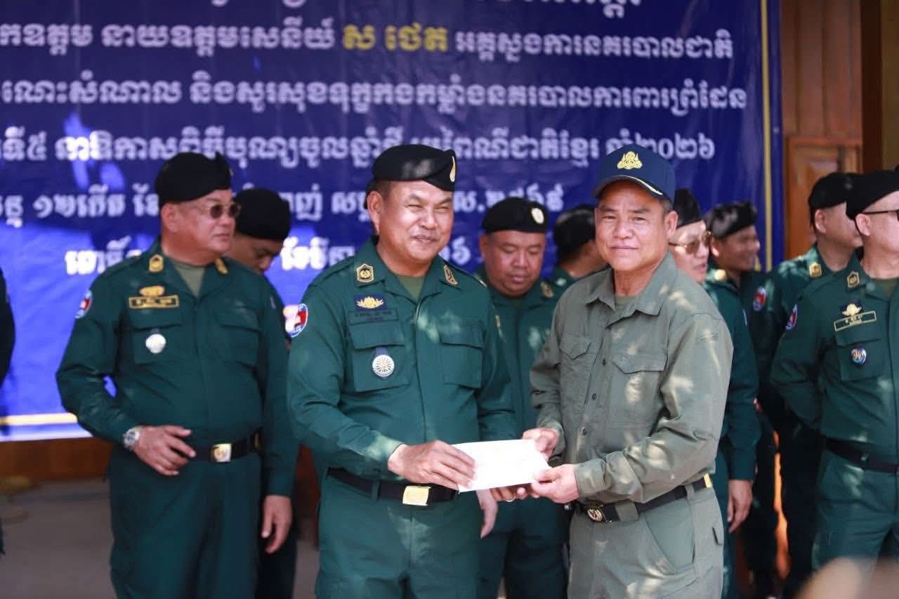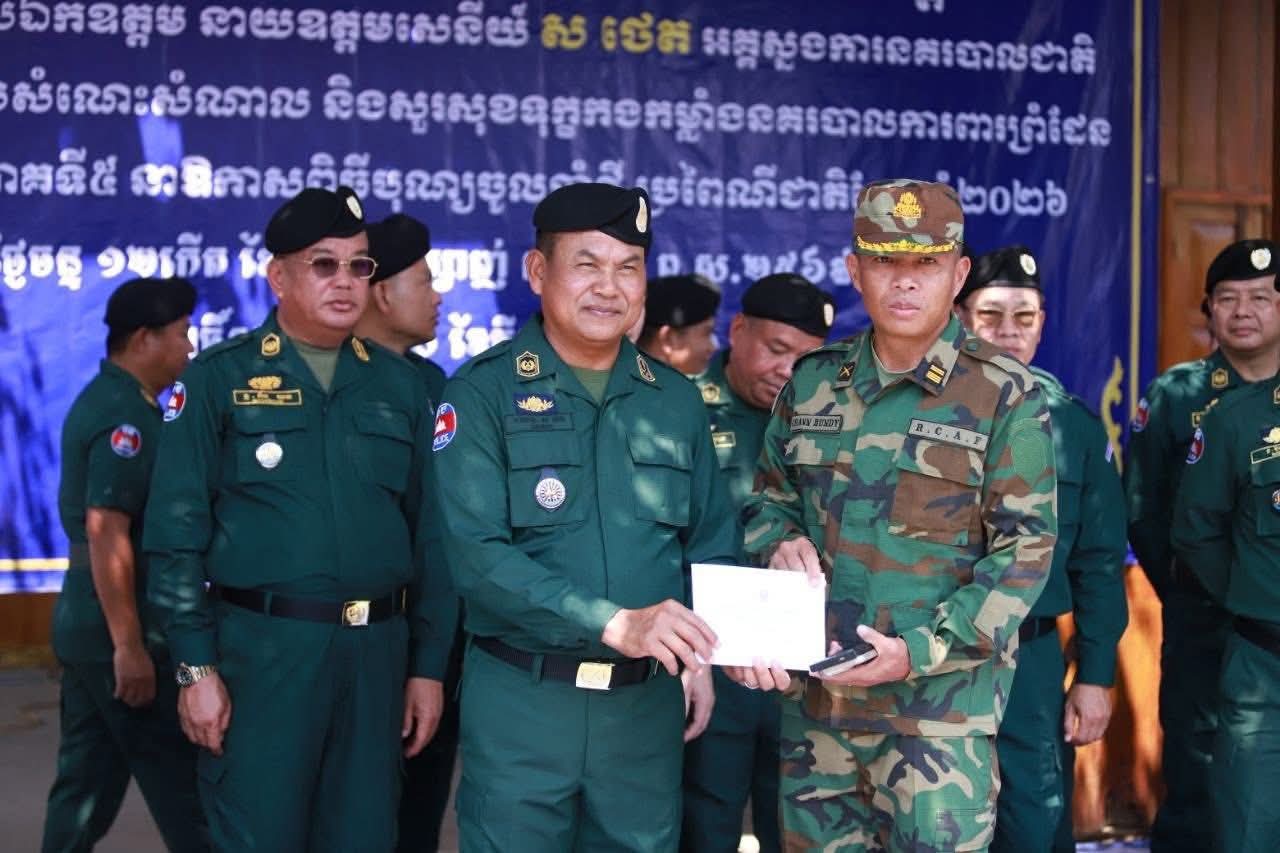 ខេត្តពោធិ៍សាត់ ៖ នាឱកាសដ៏វិសេសវិសាល នៃពិធីបុណ្យចូលឆ្នាំថ្មី ប្រពៃណីជាតិខ្មែរ ឆ្នាំ២០២៦ ខាងមុខនេះ លោកនាយឧត្តមសេនីយ៍ ស ថេត អគ្គស្នងការនគរបាលជាតិ បានអញ្ជើញចុះជួបសំណេះសំណាល និងសួរសុខទុក្ខផ្ទាល់ដល់កងកម្លាំងនគរបាលការពារព្រំដែន ប្រចាំទិសភូមិភាគទី៥ ដើម្បីលើកទឹកចិត្តដល់ស្មារតីលះបង់របស់កងកម្លាំង ដែលកំពុងឈរជើងបំពេញភារកិច្ចការពារបូរណភាពទឹកដី ។