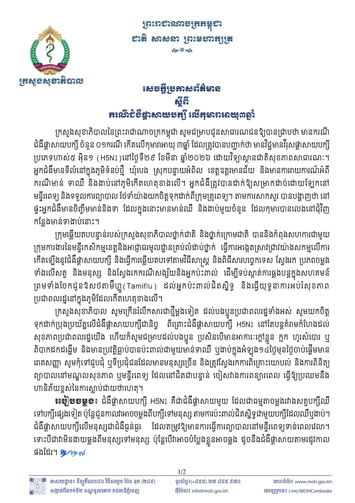រាជធានីភ្នំពេញ ៖ នៅថ្ងៃទី ៣១ ខែមីនា ឆ្នាំ ២០២៦ នេះ ក្រសួងសុខាភិបាល បានប្រកាសពី ករណីជំងឺផ្តាសាយបក្សី លើកុមារាអាយុ ៣ ឆាំ្ន ។ មានករណី ជំងឺផ្តាសាយបក្សី ចំនួន ០១ករណី កើតលើកុមារាអាយុ ៣ឆ្នាំ ដែលត្រូវបានបញ្ជាក់ថា មានវិជ្ជមានវីរុសផ្តាសាយបក្សី ប្រភេទ H5N1 នៅថ្ងៃទី ២៩ ខែមីនា ឆ្នាំ ២០២៦ ដោយវិទ្យាស្ថានជាតិសុខភាពសាធារណៈ ។