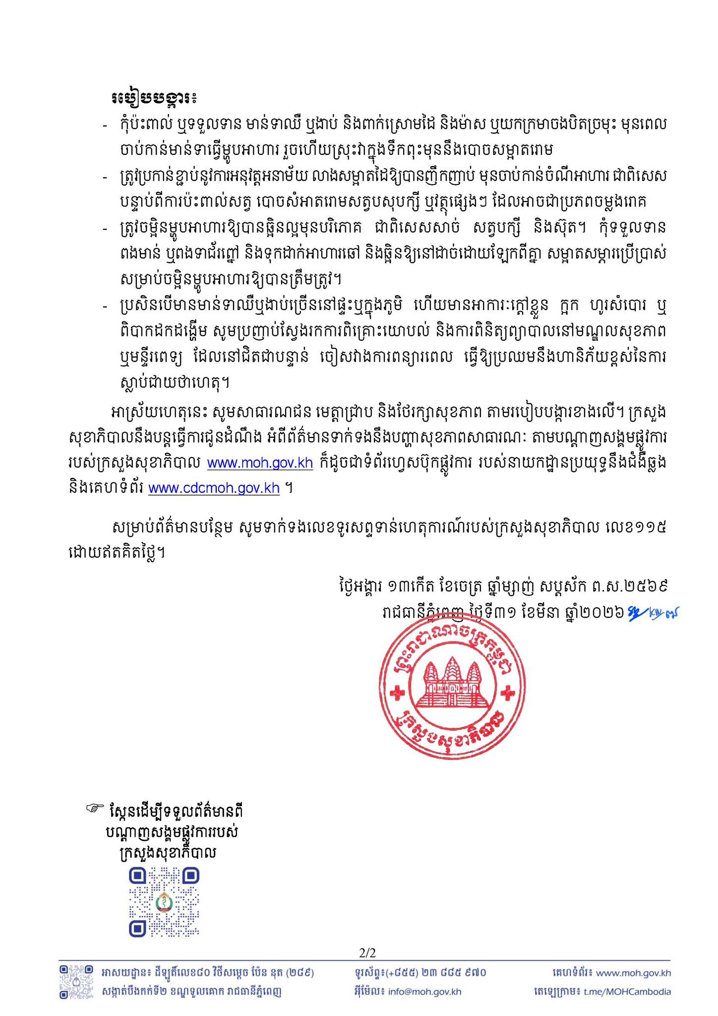 រាជធានីភ្នំពេញ ៖ នៅថ្ងៃទី ៣១ ខែមីនា ឆ្នាំ ២០២៦ នេះ ក្រសួងសុខាភិបាល បានប្រកាសពី…