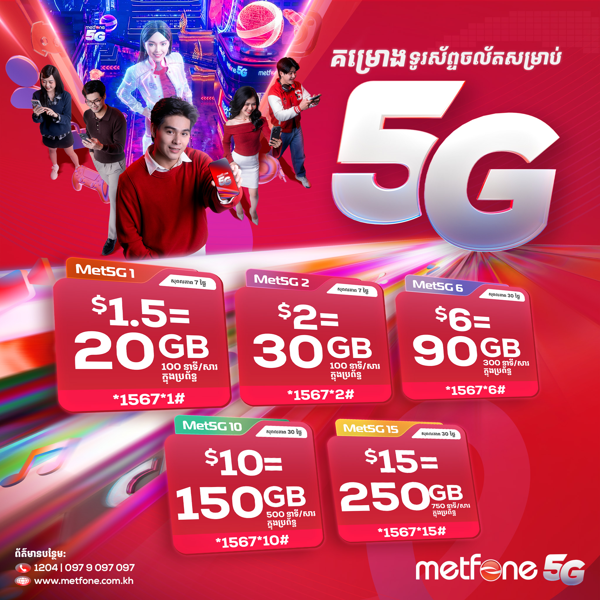 ដើម្បីបំពេញតម្រូវការអតិថិជនចម្រុះ Metfone ផ្តល់ជូននូវ 5 គម្រោងដែលបត់បែនចាប់ពីជម្រើសរយៈពេលខ្លីរហូតដល់រយៈពេលវែង ។ សម្រាប់ការប្រើប្រាស់ប្រចាំសប្តាហ៍ គម្រោង Met5G 1 និង Met5G 2 មានចាប់ពីតម្លៃត្រឹមតែ 1.5 ដុល្លារប៉ុននោះ ដែលសមស្របសម្រាប់ការចូលប្រើដែលមានតម្លៃសមរម្យ និងងាយស្រួល ។ សម្រាប់អ្នកប្រើប្រាស់ដែលមានតម្រូវការច្រើន គម្រោងប្រចាំខែដូចជា Met5G 6 Met5G 10 និង Met5G 15 ផ្តល់ជូនទិន្នន័យរហូតដល់ 250GB រួមជាមួយនឹងនាទី សារ SMS ឥតគិតថ្លៃជាច្រើន ។ ជាពិសេស គម្រោងទាំងអស់នេះ ក៏អាចប្រើប្រាស់បានជាមួយបណ្តាញ 4G ដែលធានាបាននូវការប្រើប្រាស់ដ៏រលូននៅទូទាំងតំបន់គ្របដណ្តប់ ។