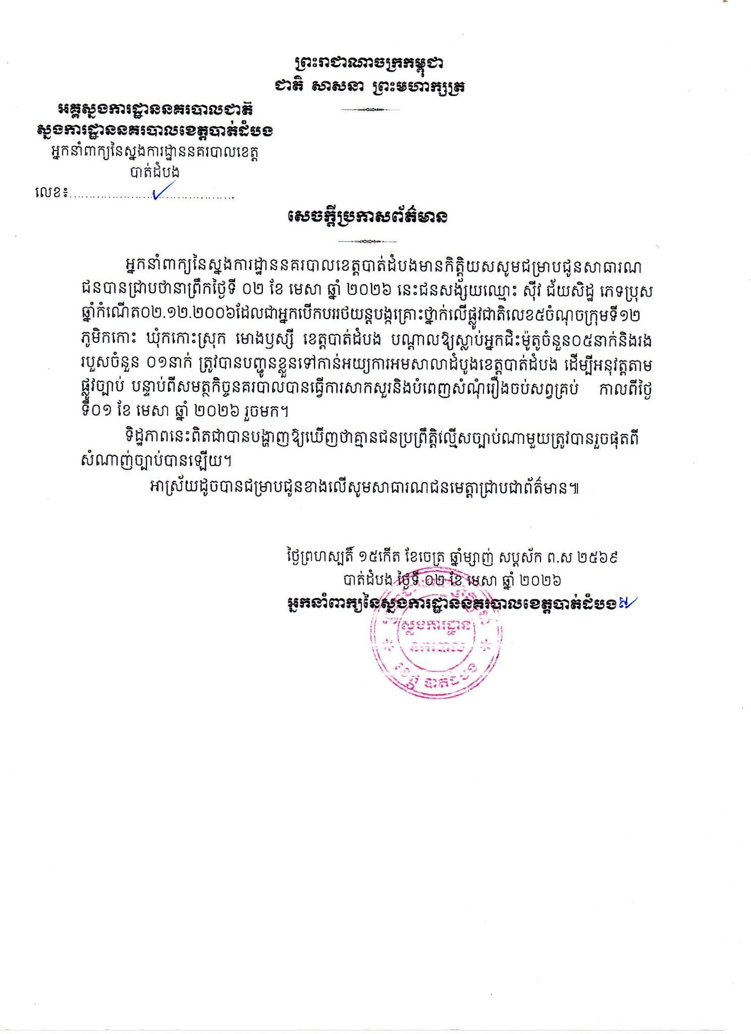 បើតាមសេចក្តីប្រកាសព័ត៌មាន របស់អ្នកនាំពាក្យនៃស្នងការដ្ឋាននគរបាលខេត្តបាត់ដំបងថា នាព្រឹកថ្ងៃទី ០២ ខែមេសា ឆ្នាំ២០២៦ នេះជនសង្ស័យឈ្មោះ ស៊ីវ ជ័យសិដ្ឋ ភេទប្រុស ឆ្នាំកំណើត០២.១២.២០០៦ដែលជាអ្នកបើកបររថយន្តបង្កគ្រោះថ្នាក់ លើផ្លូវជាតិលេខ៥ ចំណុចក្រុមទី១២ ភូមិកកោះ ឃុំកកោះស្រុក មោងឫស្សី ខេត្តបាត់ដំបង បណ្តាលឱ្យស្លា.ប់អ្នកជិះម៉ូតូចំនួន០៥នាក់ និងរងរបួសចំនួន០១នាក់ ត្រូវបានបញ្ជូនខ្លួនទៅកាន់អយ្យការអមសាលាដំបូងខេត្តបាត់ដំបង ដើម្បីអនុវត្តតាមផ្លូវច្បាប់ បន្ទាប់ពីសមត្ថកិច្ចនគរបាល បានធ្វើការសាកសួរ និងបំពេញសំណុំរឿងចប់សព្វគ្រប់ កាលពីថ្ងៃទី០១ ខែមេសា ឆ្នាំ២០២៦ រួចមក ។ ទិដ្ឋភាពនេះពិតជាបានបង្ហាញឱ្យឃើញថា គ្មានជនប្រព្រឹត្តិល្មើសច្បាប់ណាមួយ ត្រូវបានរួចផុតពីសំណាញ់ច្បាប់បានឡើយ ៕
