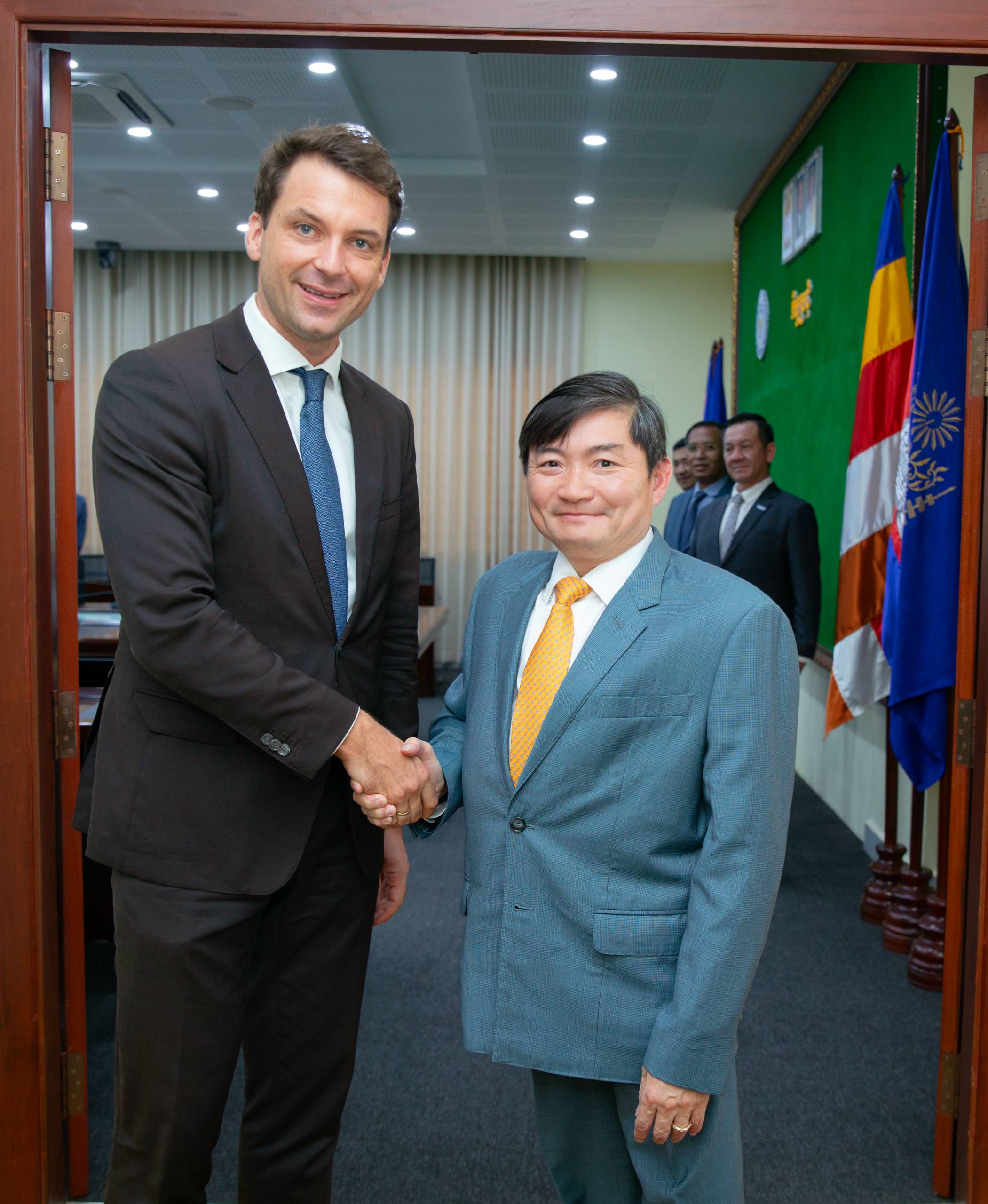 រាជធានីភ្នំពេញ ៖ ឯកឧត្តម ហេង សួរ រដ្ឋមន្ត្រីក្រសួងការងារ និងបណ្ដុះបណ្ដាលវិជ្ជាជីវៈ បានទទួលជួបសម្ដែងការគួរសមជាមួយលោក Christoph Weigelmeier ភារធារីស្តីទីនៃស្ថានទូតសាធារណរដ្ឋសហព័ន្ធអាល្លឺម៉ង់ប្រចាំកម្ពុជា និងលោកបណ្ឌិត Christoph Hoffmann អតីតសមាជិកសភាអាល្លឺម៉ង់ នាថ្ងៃទី១ ខែមេសា ឆ្នាំ២០២៦ នេះ នៅទីស្តីការក្រសួង ដើម្បីពិភាក្សាស្វែងរកឱកាសបង្កើតគំនិតផ្តួចផ្តើមដែលគាំទ្រដល់ការលើកកម្ពស់ការអភិវឌ្ឍធនធានមនុស្សនៅកម្ពុជា ដែលរួមមានទាំងសិក្ខាកាម ដែលអាចមានឱកាសទៅធ្វើកម្មសិក្សា និងកម្មសិក្សាឆ្លាស់នៅអាល្លឺម៉ង់ ។