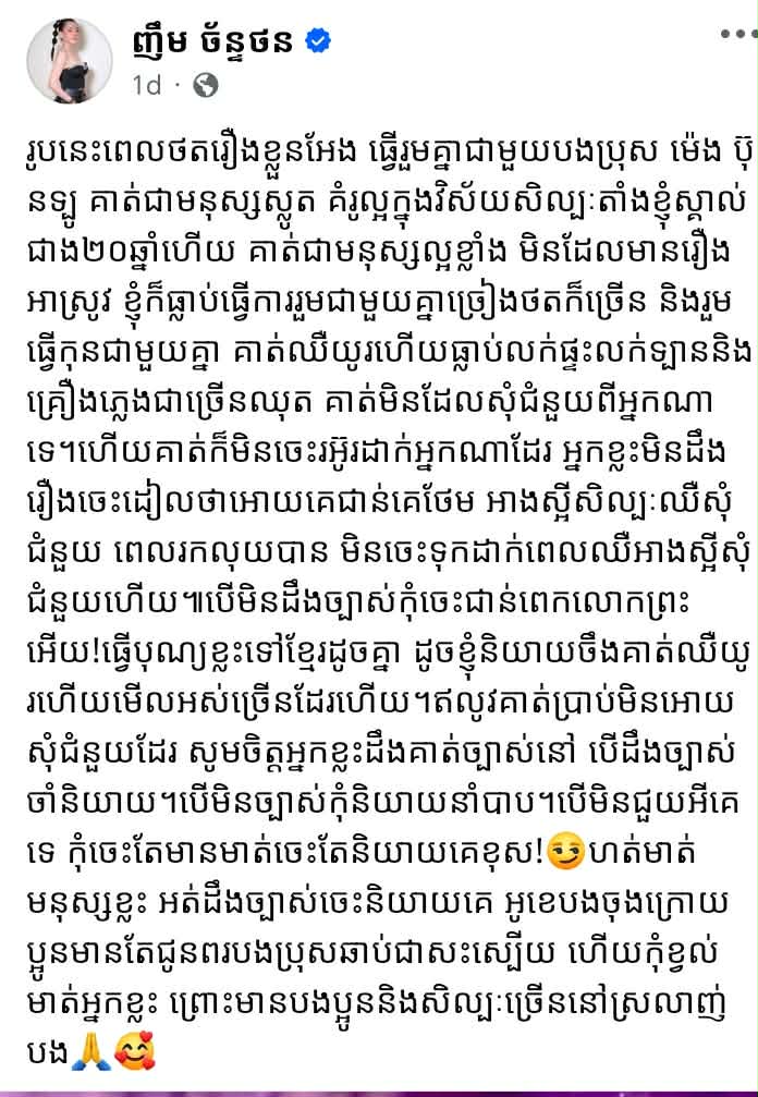 ត្រង់ចំណុចនេះ នាង ញឹម ច័ន្ទថន បានបញ្ជាក់ថា បើមិនដឹងច្បាស់ កុំចេះជាន់ពេក លោកព្រះអើយ! ធ្វើបុណ្យខ្លះទៅ ខ្មែរដូចគ្នា ដូចខ្ញុំនិយាយចឹងគាត់ឈឺយូរហើយ មើលអស់ច្រើនដែរ ហើយឥឡូវគាត់ប្រាប់មិនអោយសុំជំនួយដែរ សូមចិត្តអ្នកខ្លះដឹងគាត់ច្បាស់នៅ បើដឹងច្បាស់ចាំនិយាយ បើមិនច្បាស់កុំនិយាយនាំបាប។ បើមិនជួយអីគេទេ កុំចេះតែមានមាត់ចេះតែនិយាយគេខុស!😏ហត់មាត់មនុស្សខ្លះ អត់ដឹងច្បាស់ចេះនិយាយគេ អូខេបងចុងក្រោយប្អូនមានតែជូនពរបងប្រុសឆាប់ជាសះស្បើយ ហើយកុំខ្វល់មាត់អ្នកខ្លះ ព្រោះមានបងប្អូន និងអ្នកសិល្បៈច្រលននៅស្រលាញ់បង ។