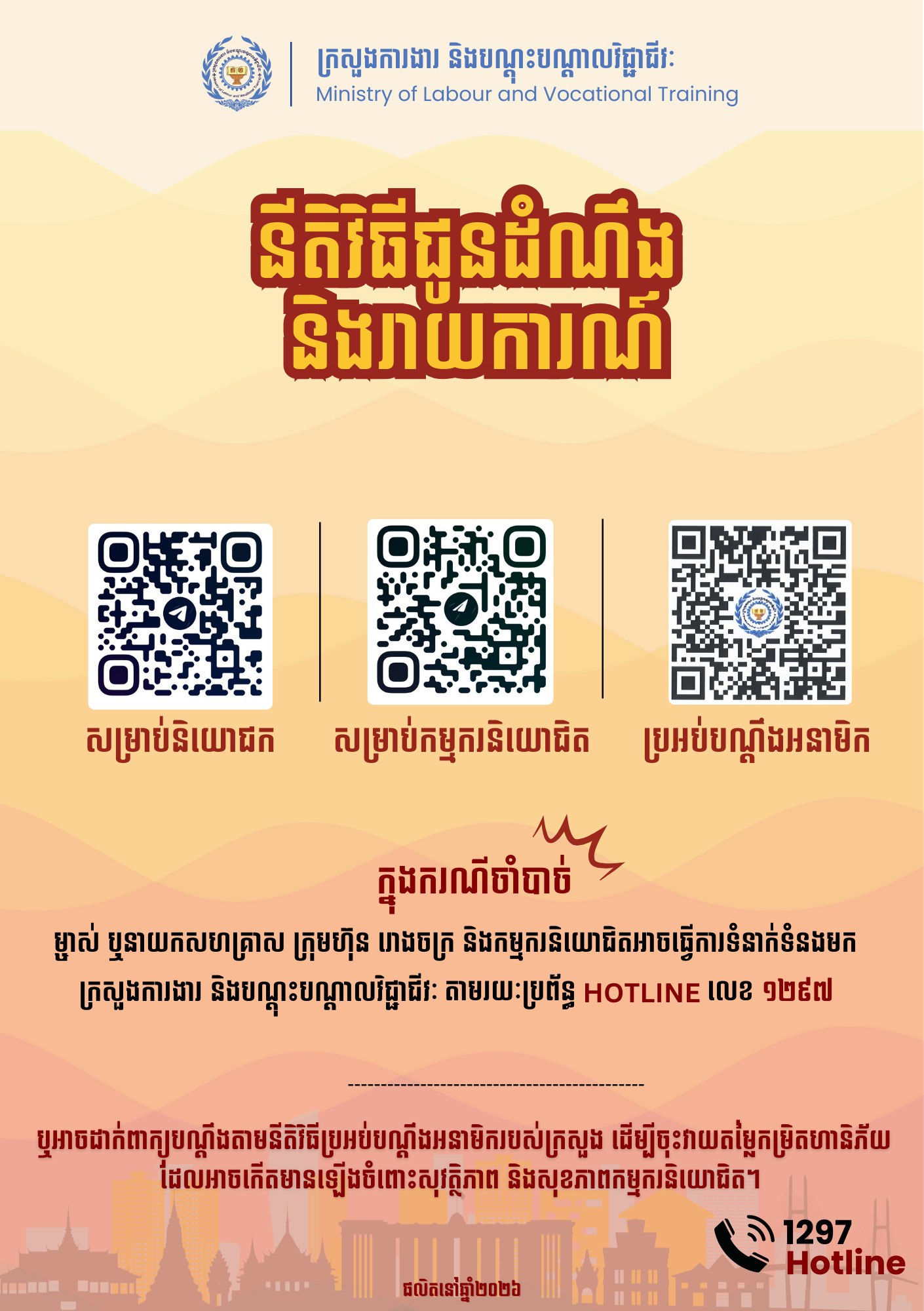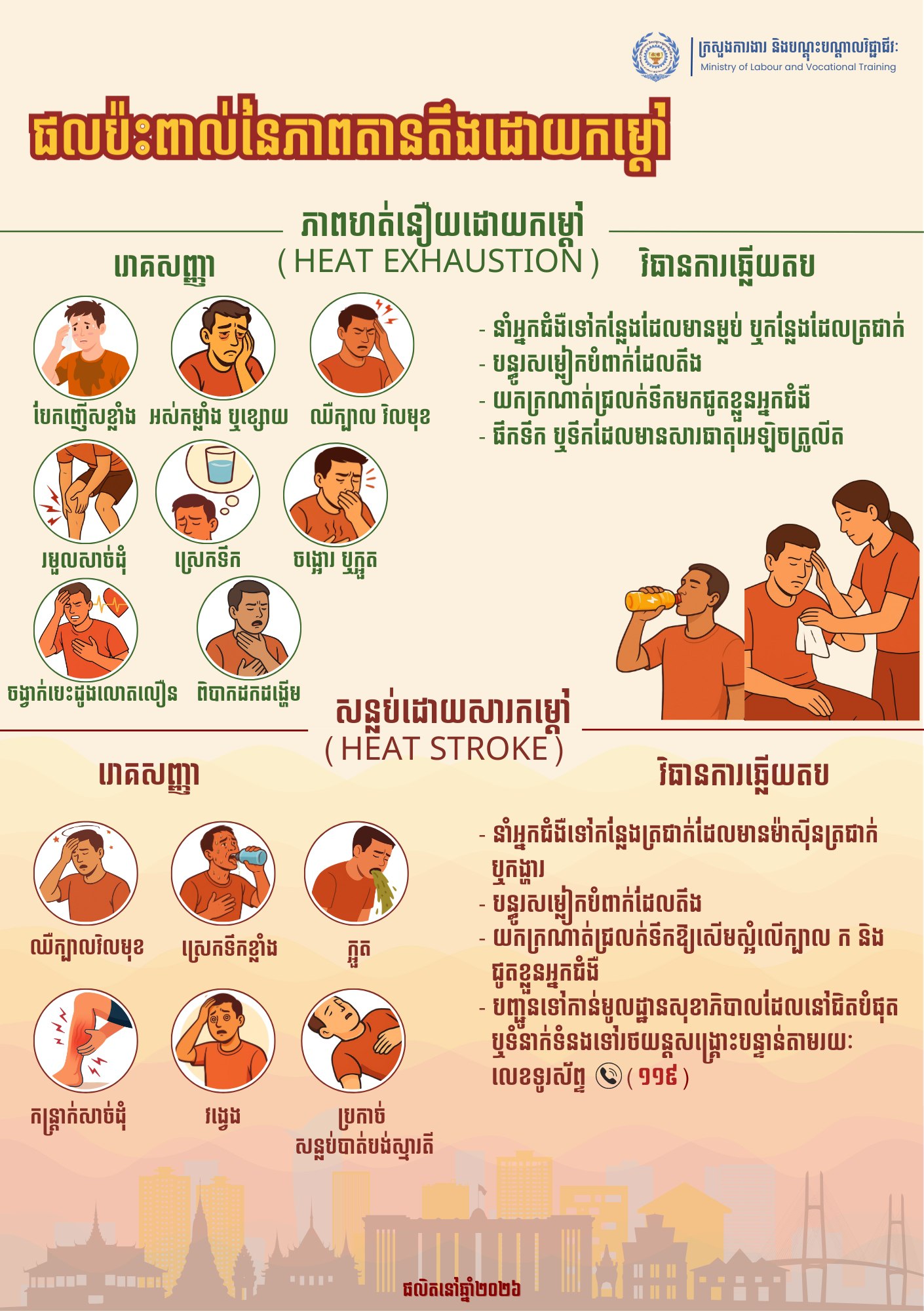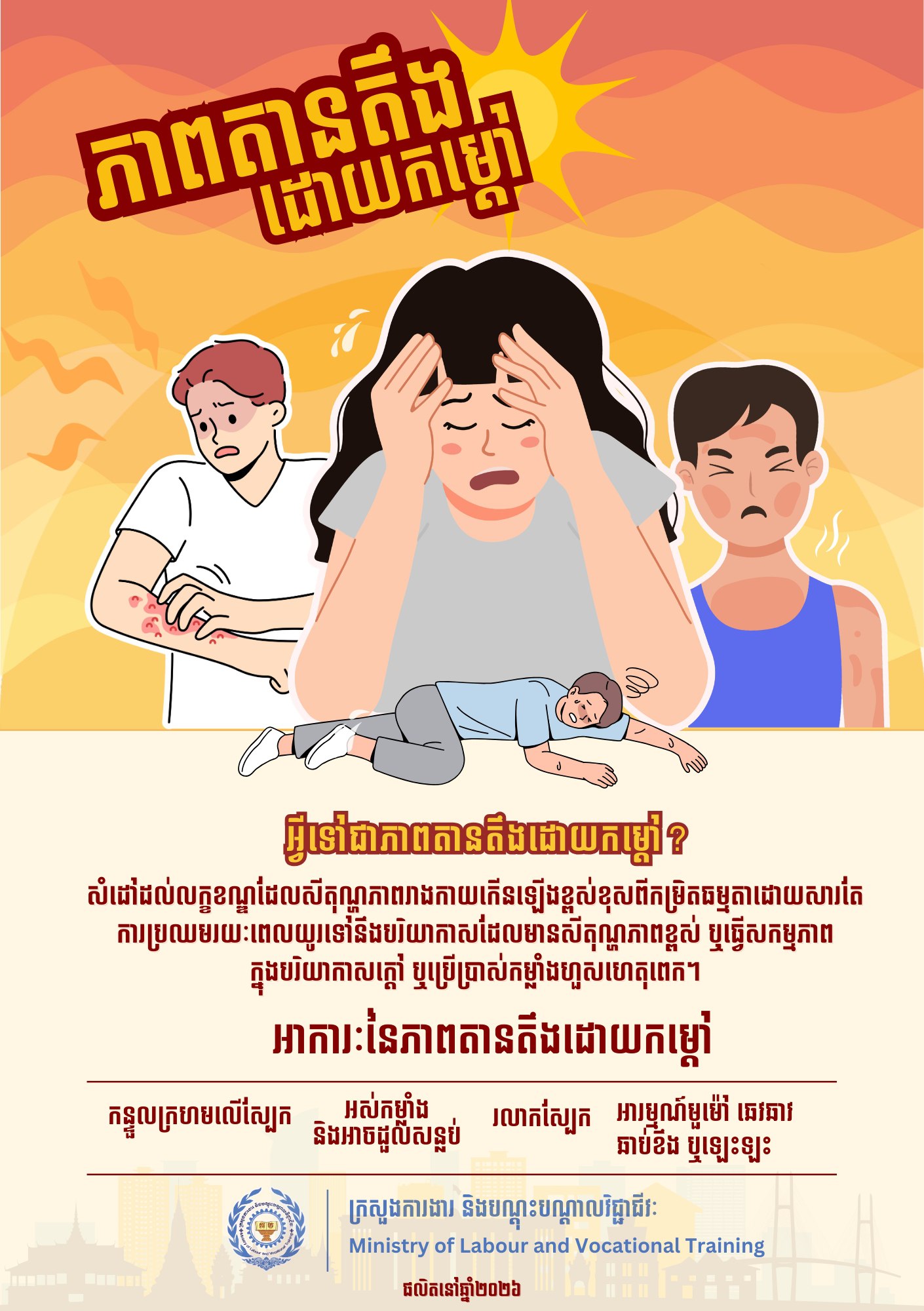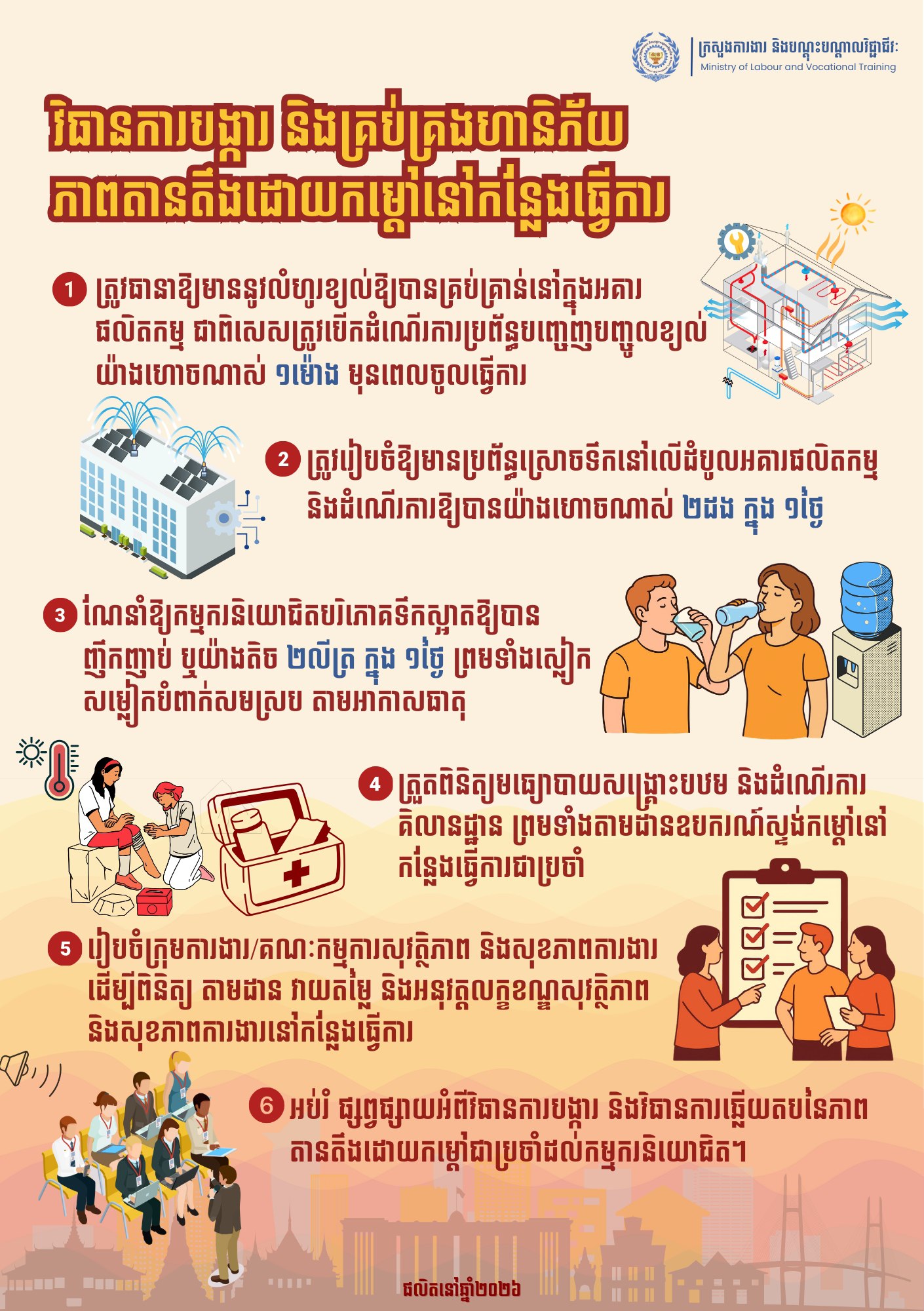 «ភាពតានតឹងដោយកម្តៅ»៖ ក្រសួងការងារ សូមជូនដំណឹង ដល់ម្ចាស់ឬនាយកសហគ្រាស ក្រុមហ៊ុន រោងចក្រ និងកម្មករនិយោជិតទាំងអស់ យកចិត្តទុកដាក់ អនុវត្តតាមការណែនាំរបស់ក្រសួង