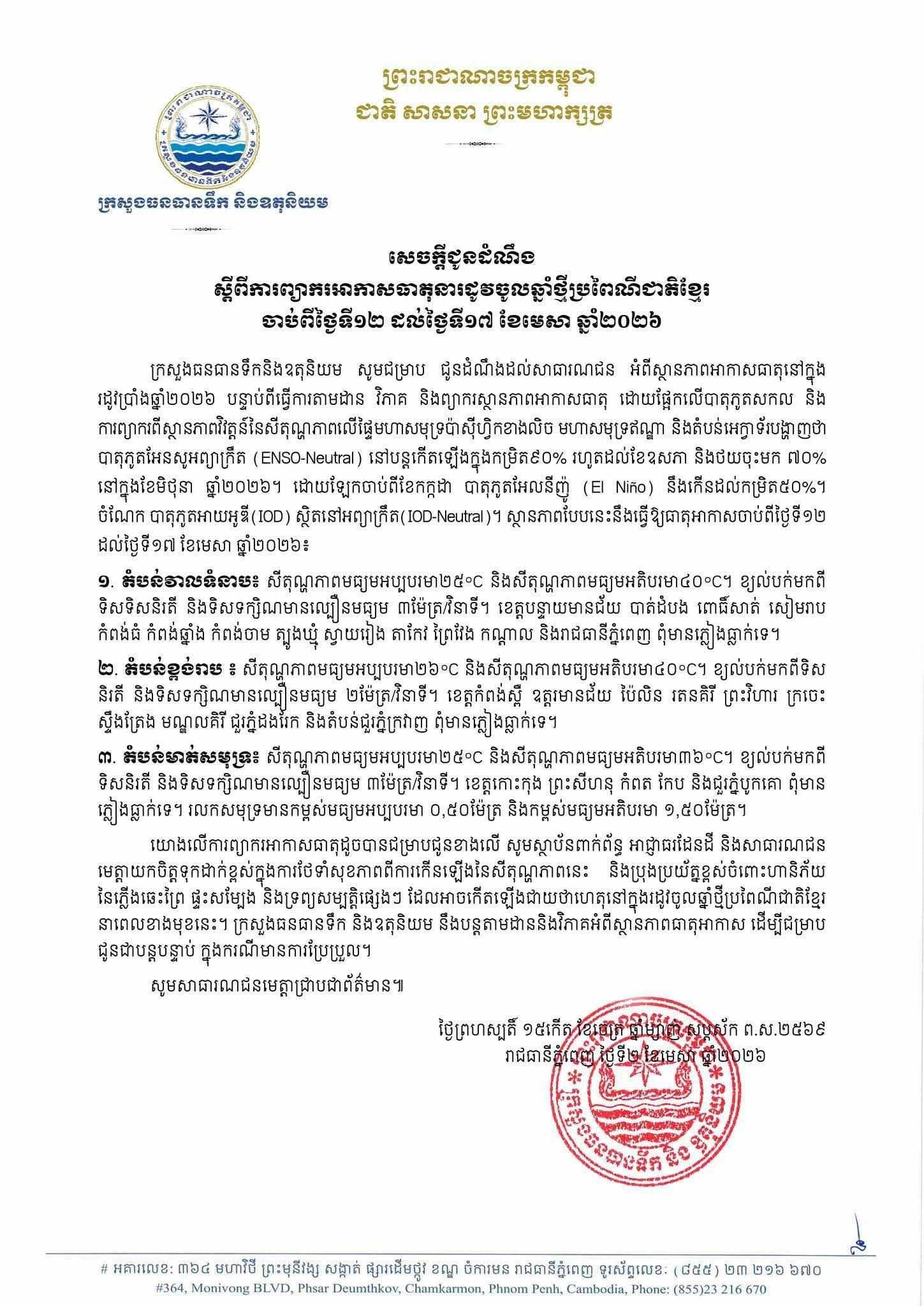 យោងតាមសេចក្តីជូនដំណឹង ស្តីពីការព្យាករអាកាសធាតុ នារដូវចូលឆ្នាំថ្មី ប្រពៃណីជាតិខ្មែរ ចាប់ពីថ្ងៃទី១២ ដល់ថ្ងៃទី១៧ ខែមេសា ឆ្នាំ២០២៦ របស់ក្រសួងធនធានទឹក នៅថ្ងៃទី២ ខែមេសា ឆ្នាំ២០២៦ បានលើកឡើងថា សូមសាធារណជន អំពីស្ថានភាពអាកាសធាតុនៅក្នុងរដូវប្រាំងឆ្នាំ២០២៦ បន្ទាប់ពីធ្វើការតាមដាន វិភាគ និងព្យាករស្ថានភាពអាកាសធាតុ ដោយផ្អែកលើបាតុភូតសកល និង ការព្យាករពីស្ថានភាពវិវត្តន៍ នៃសីតុណ្ហភាពលើផ្ទៃមហាសមុទ្រប៉ាស៊ីហ្វិកខាងលិច មហាសមុទ្រឥណ្ឌា និងតំបន់អេក្វាទ័រ បានបង្ហាញថា បាតុភូតអែនសូអព្យាក្រឹត (ENSO-Neutral) នៅបន្តកើតឡើងក្នុងកម្រិត៩០% រហូតដល់ខែឧសភា និងថយចុះមក ៧០% នៅក្នុងខែមិថុនា ឆ្នាំ២០២៦។ ដោយឡែក ចាប់ពីខែកក្កដា បាតុភូតអែលនីញ៉ូ (El Niño) នឹងកើនដល់កម្រិត៥០%។ ចំណែក បាតុភូតអោយអូឌី (IOD) ស្ថិតនៅអព្យាក្រឹត (IOD-Neutral) ។