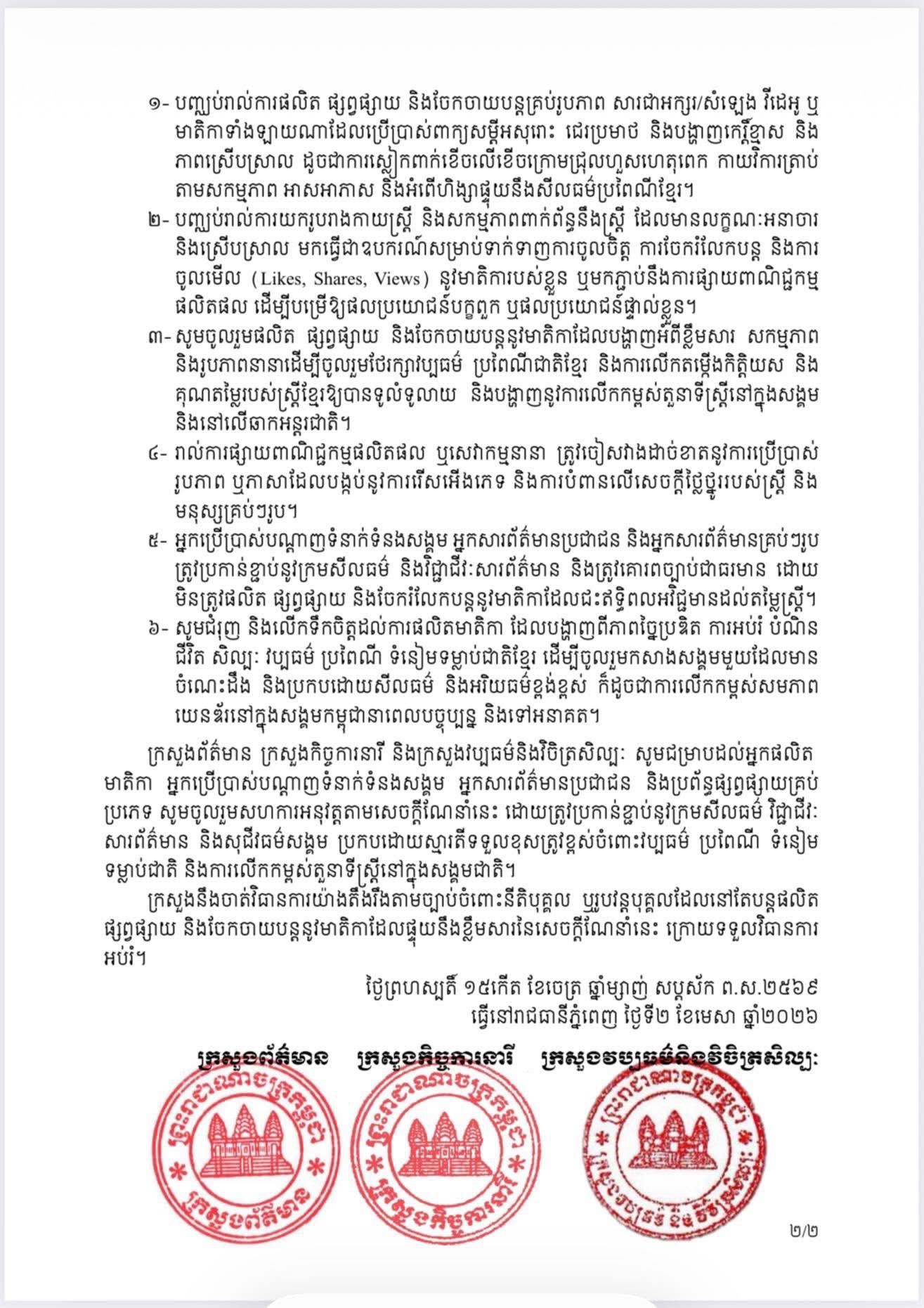 យោងតាមសេចក្តីណែនាំរួមគ្នា នៅថ្ងៃទី២ មេសា ឆ្នាំ២០២៦ របស់ក្រសួងព័ត៌មាន ក្រសួងកិច្ចការនារី និងក្រសួងវប្បធម៌ និងវិចិត្រសិល្បៈ បានលើកឡើងថា កន្លងមក ក្រសួងព័ត៌មាន ធ្លាប់បានផ្តល់ នូវសេចក្តីណែនាំដល់អ្នកផលិតមាតិកា ផ្សព្វផ្សាយ តាមបណ្តាញទំនាក់ទំនងសង្គម ដោយផ្តោតការផលិត និងការចែកចាយ ប្រកបដោយការទទួលខុសត្រូវ ដើម្បីរក្សាបាននូវសណ្តាប់ធ្នាប់សង្គម ប៉ុន្តែបច្ចុប្បន្ននេះ មានអ្នកផលិតមាតិកាមួយចំនួន បានបំពានសេចក្តីណែនាំ ក្រមសីលធម៌ និងមនសិការវិជ្ជាជីវៈ ឬខ្វះការពិចារណា ក្នុងការថែរក្សាវប្បធម៌ ប្រពៃណី អត្តសញ្ញាណជាតិខ្មែរ និងជាពិសេសការលើកតម្កើងសេចក្តី ថ្លៃថ្នូរ និងកិត្តិយសរបស់ស្ត្រី ដោយបានផលិត ផ្សព្វផ្សាយ និងចែកចាយបន្ត នូវមាតិកា ដែលប្រើប្រាស់ពាក្យសម្តីអសុរោះ អសីលធម៌ និងប្រើប្រាស់រូបរាងកាយស្ត្រីបង្ហាញរូបភាពអនាចារ និងស្រើបស្រាល ដើម្បីតែស្វែងរកការចាប់អារម្មណ៍ និងបម្រើផលប្រយោជន៍ផ្ទាល់ខ្លួន ឬបម្រើឱ្យការលក់ផលិតផលរបស់ខ្លួន ដែលនាំឱ្យប៉ះពាល់យ៉ាងធ្ងន់ធ្ងរដល់វប្បធម៌ ប្រពៃណី និងសីលធម៌សង្គម ជាតិខ្មែរ ។
