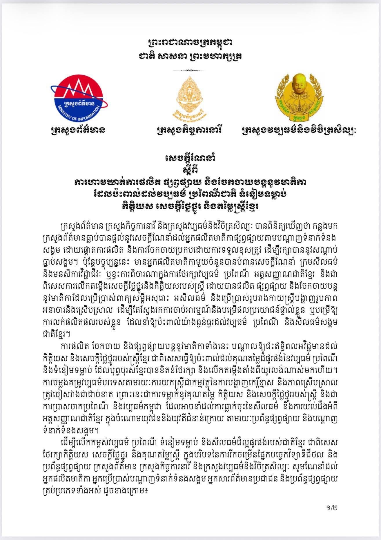 ក្រសួងព័ត៌មាន ក្រសួងកិច្ចការនារី និងក្រសួងវប្បធម៌ និងវិចិត្រសិល្បៈ សូមជម្រាបដល់អ្នកផលិត មាតិកា អ្នកប្រើប្រាស់បណ្តាញទំនាក់ទំនងសង្គម អ្នកសារព័ត៌មានប្រជាជន និងប្រព័ន្ធផ្សព្វផ្សាយគ្រប់ប្រភេទ សូមចូលរួមសហការអនុវត្តតាមសេចក្តីណែនាំនេះ ដោយត្រូវប្រកាន់ខ្ជាប់ នូវក្រមសីលធម៌ វិជ្ជាជីវៈ សារព័ត៌មាន និងសុជីវធម៌សង្គម ប្រកបដោយស្មារតីទទួលខុសត្រូវខ្ពស់ចំពោះវប្បធម៌ ប្រពៃណី ទំនៀម ទម្លាប់ជាតិ និងការលើកកម្ពស់តួនាទីស្ត្រីនៅក្នុងសង្គមជាតិ ។
