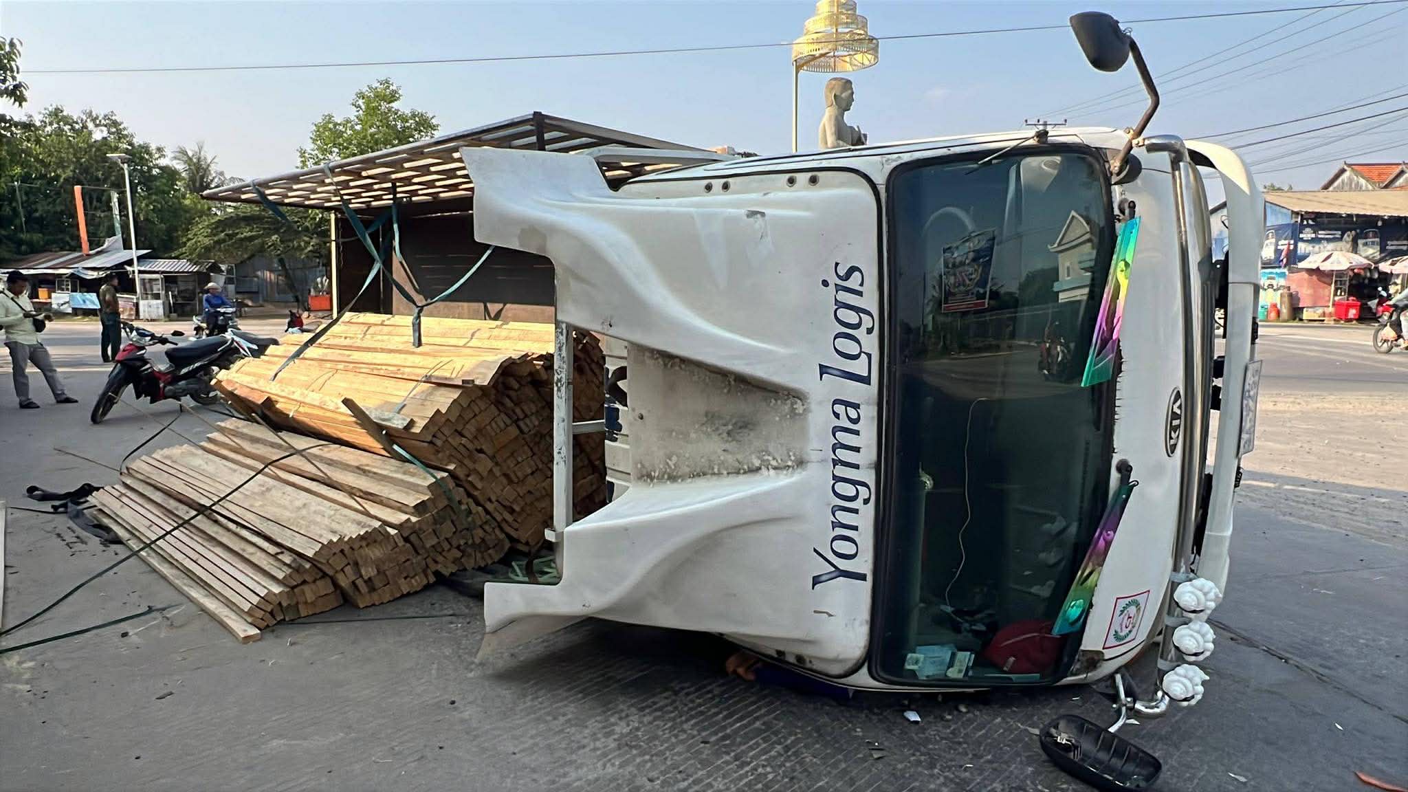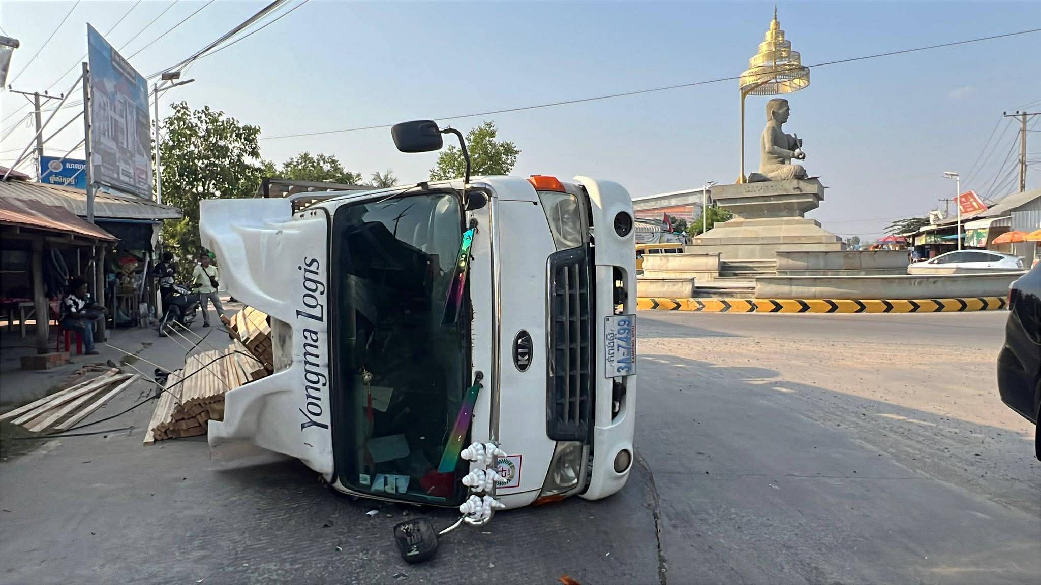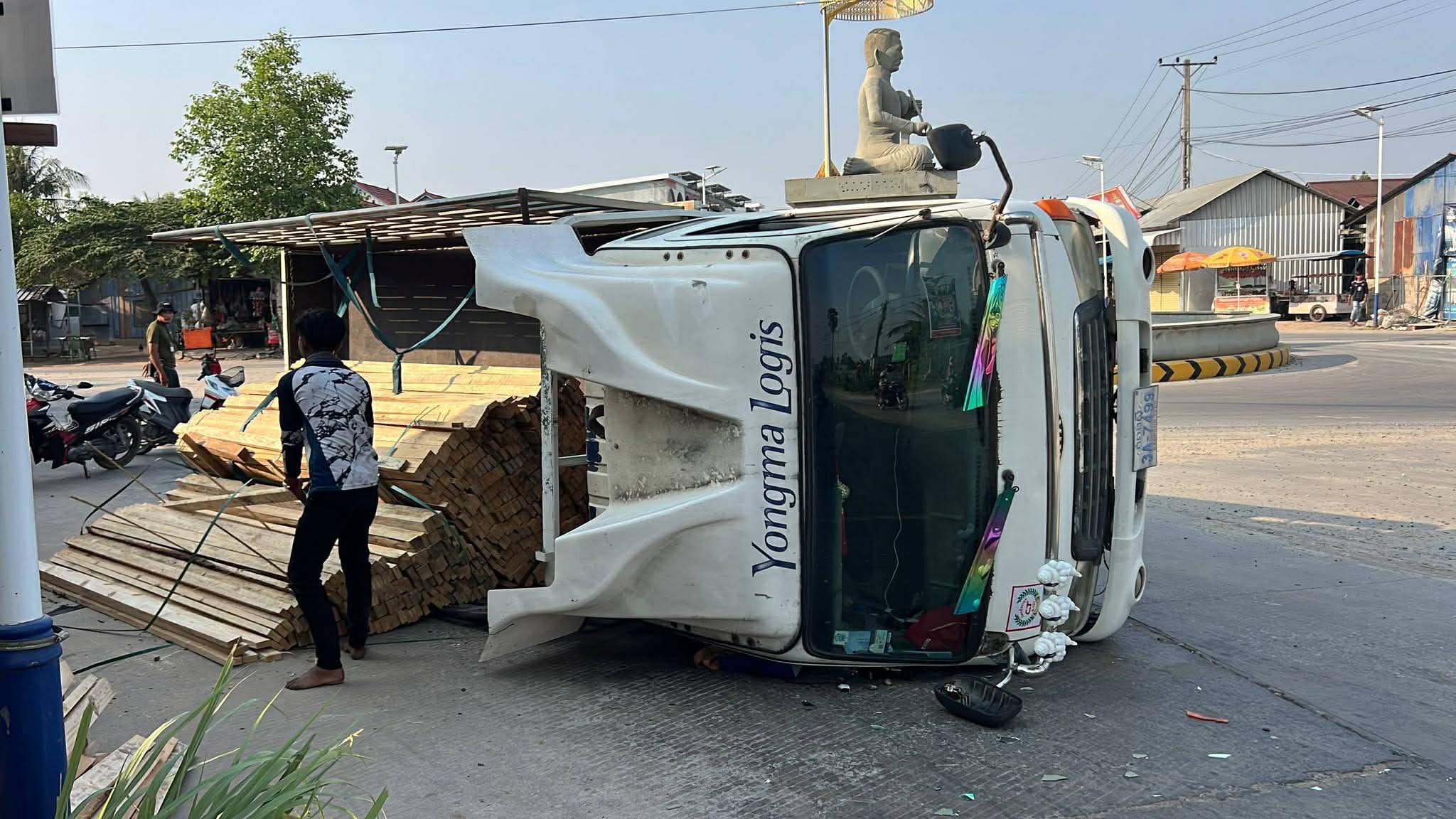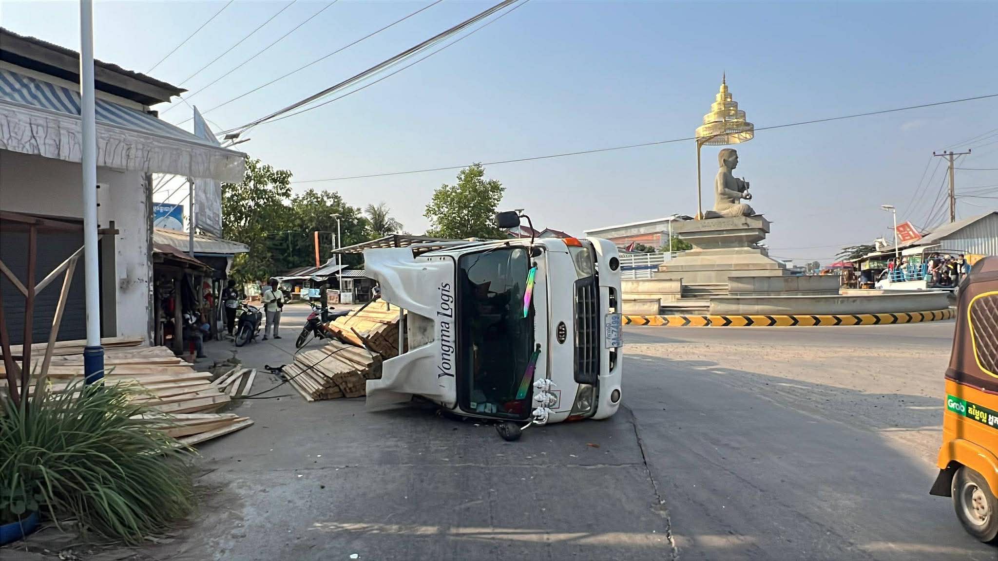 រាជធានីភ្នំពេញ ៖ រថយន្ត ១គ្រឿង ដឹកឈើស្រល់ពេញទ្រុង បានបើកបរក្រឡឹងរង្វង់មូលលោកភិរម្យភាសាអ៊ូ ហៅក្រមង៉ុយ ក្នុងល្បឿនលឿនគួរសមដែរ ក៏ស្រាប់តែក្រឡាប់ចាក់ឈើចោលពេញផ្លូវតែម្ដង។ ប៉ុន្តែសំណាងល្អ ដែលមិនបានបង្កឲ្យមានគ្រោះថ្នាក់ដល់អ្នកដំណើរ ឬសង្កត់លើផ្ទះអ្នកភូមិ ដែលស្ថិតនៅក្បែរនោះឡើយ ហើយអ្នកបើកបររថយន្តខាងលើនេះ ក៏គ្រាន់តែរបួសបន្តិចបន្តួចប៉ុណ្ណោះ ។