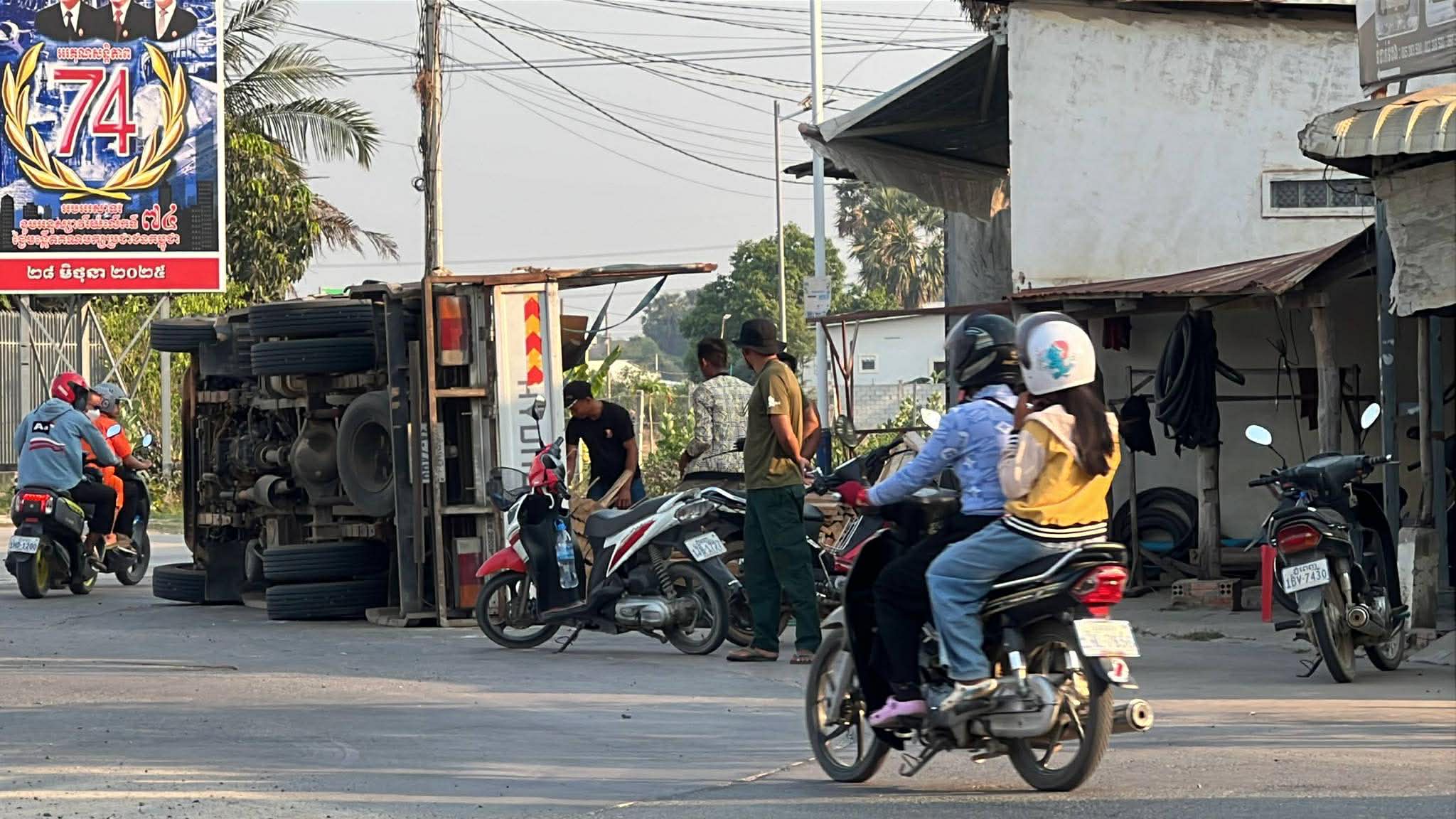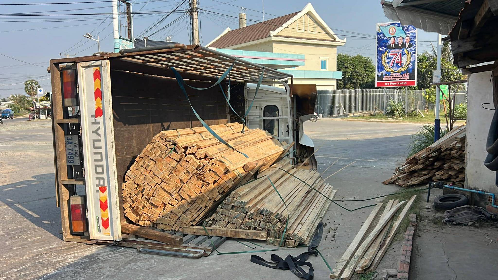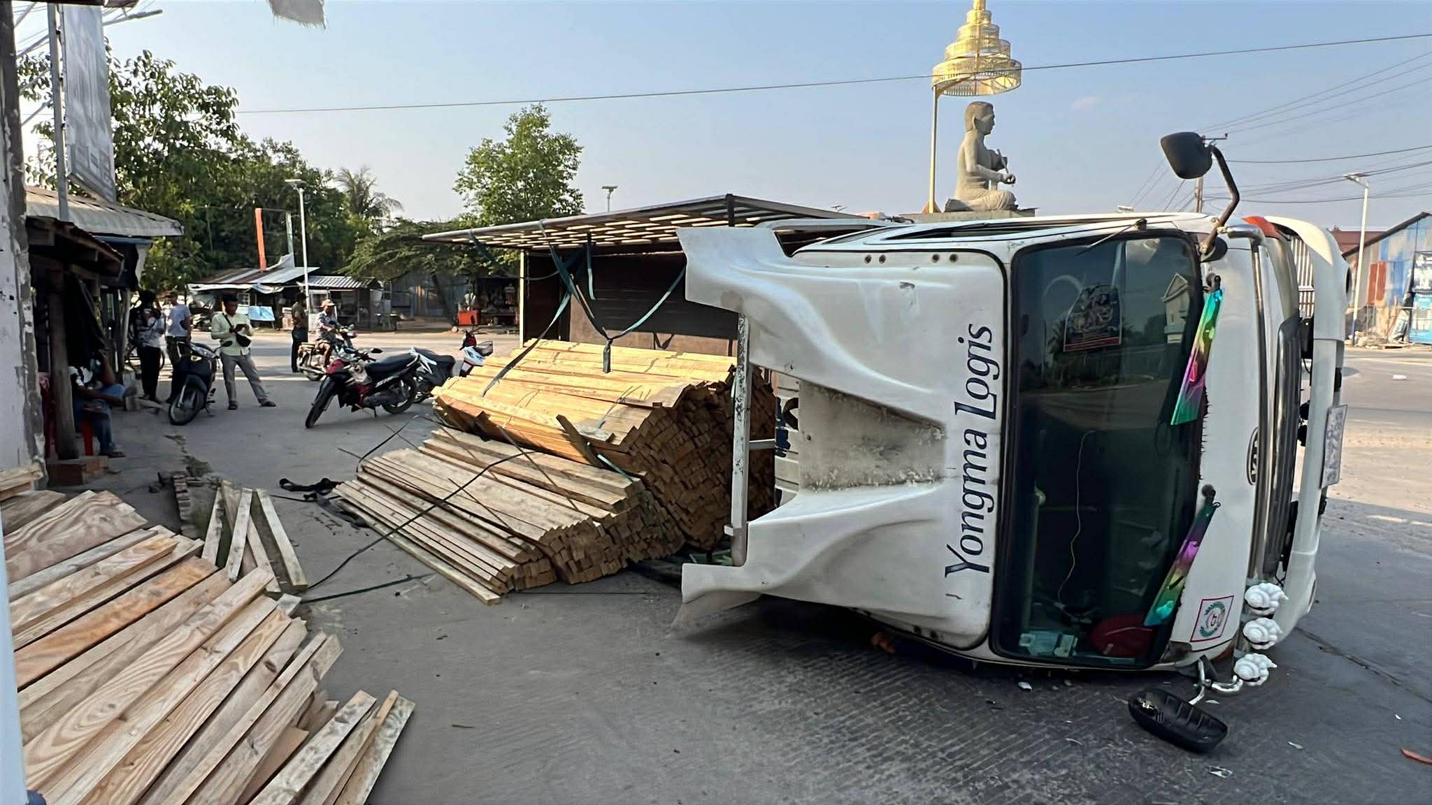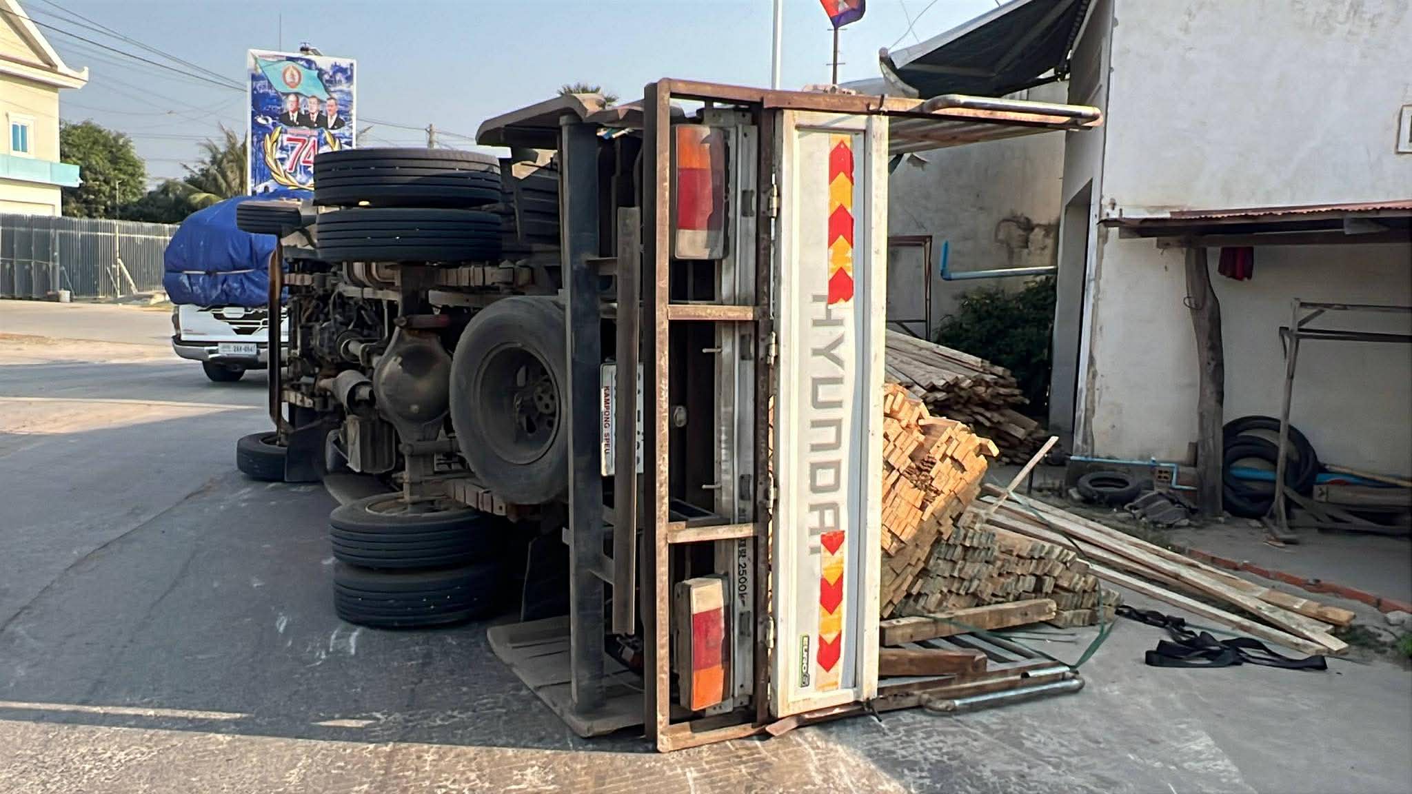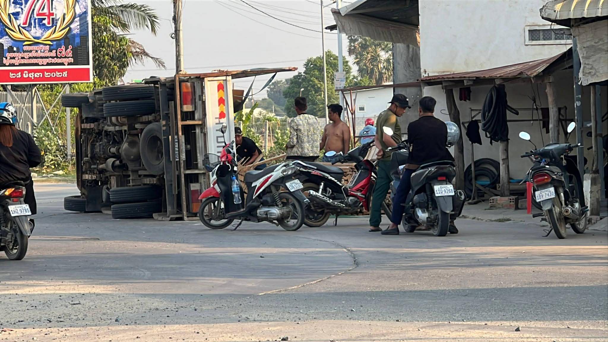 រាជធានីភ្នំពេញ ៖ រថយន្ត ១គ្រឿង ដឹកឈើស្រល់ពេញទ្រុង បានបើកបរក្រឡឹងរង្វង់មូលលោកភិរម្យភាសាអ៊ូ ហៅក្រមង៉ុយ ក្នុងល្បឿនលឿនគួរសមដែរ ក៏ស្រាប់តែក្រឡាប់ចាក់ឈើចោលពេញផ្លូវតែម្ដង។ ប៉ុន្តែសំណាងល្អ ដែលមិនបានបង្កឲ្យមានគ្រោះថ្នាក់ដល់អ្នកដំណើរ ឬសង្កត់លើផ្ទះអ្នកភូមិ ដែលស្ថិតនៅក្បែរនោះឡើយ ហើយអ្នកបើកបររថយន្តខាងលើនេះ ក៏គ្រាន់តែរបួសបន្តិចបន្តួចប៉ុណ្ណោះ ។