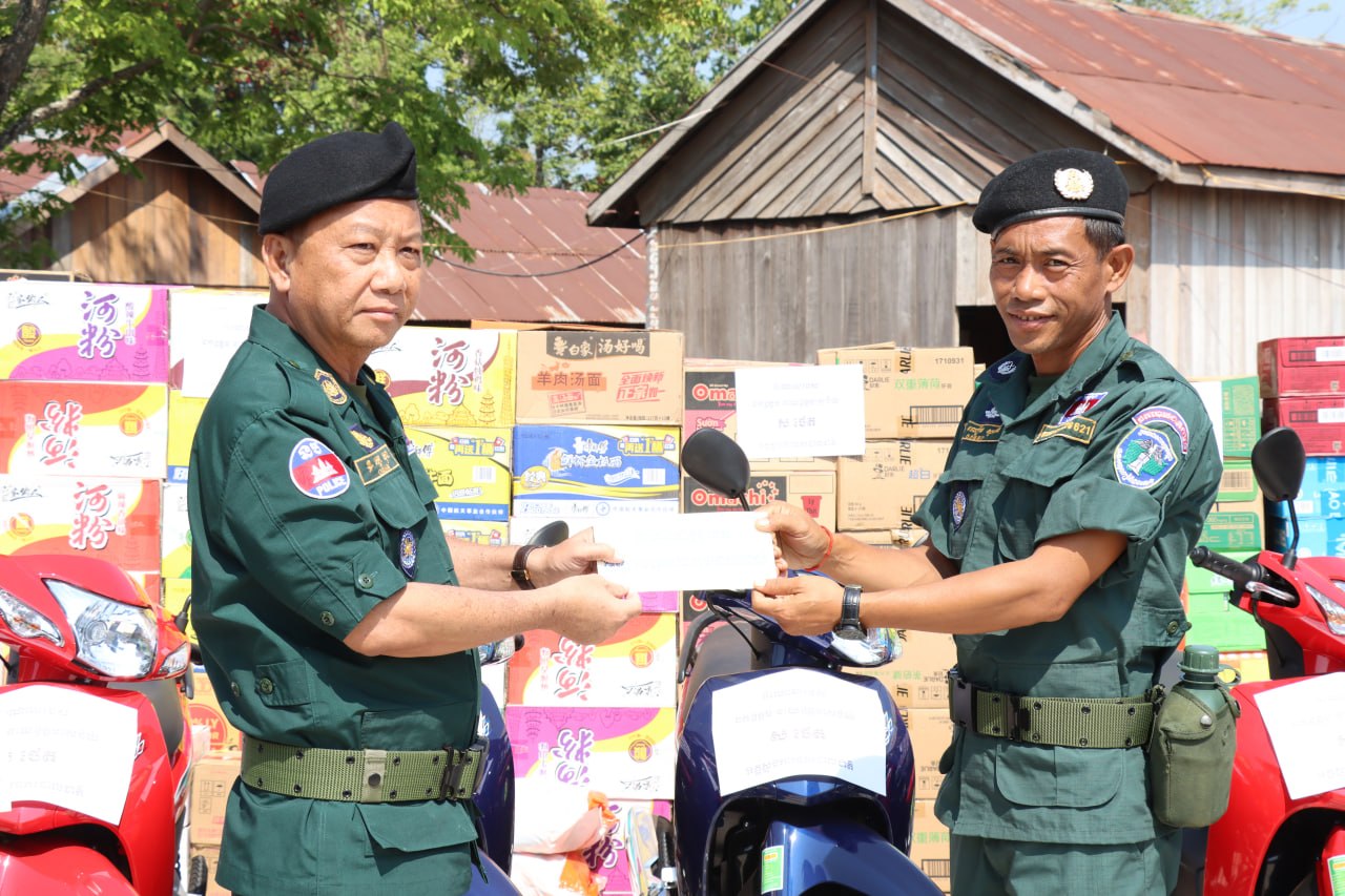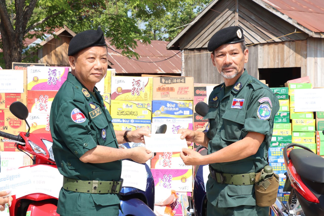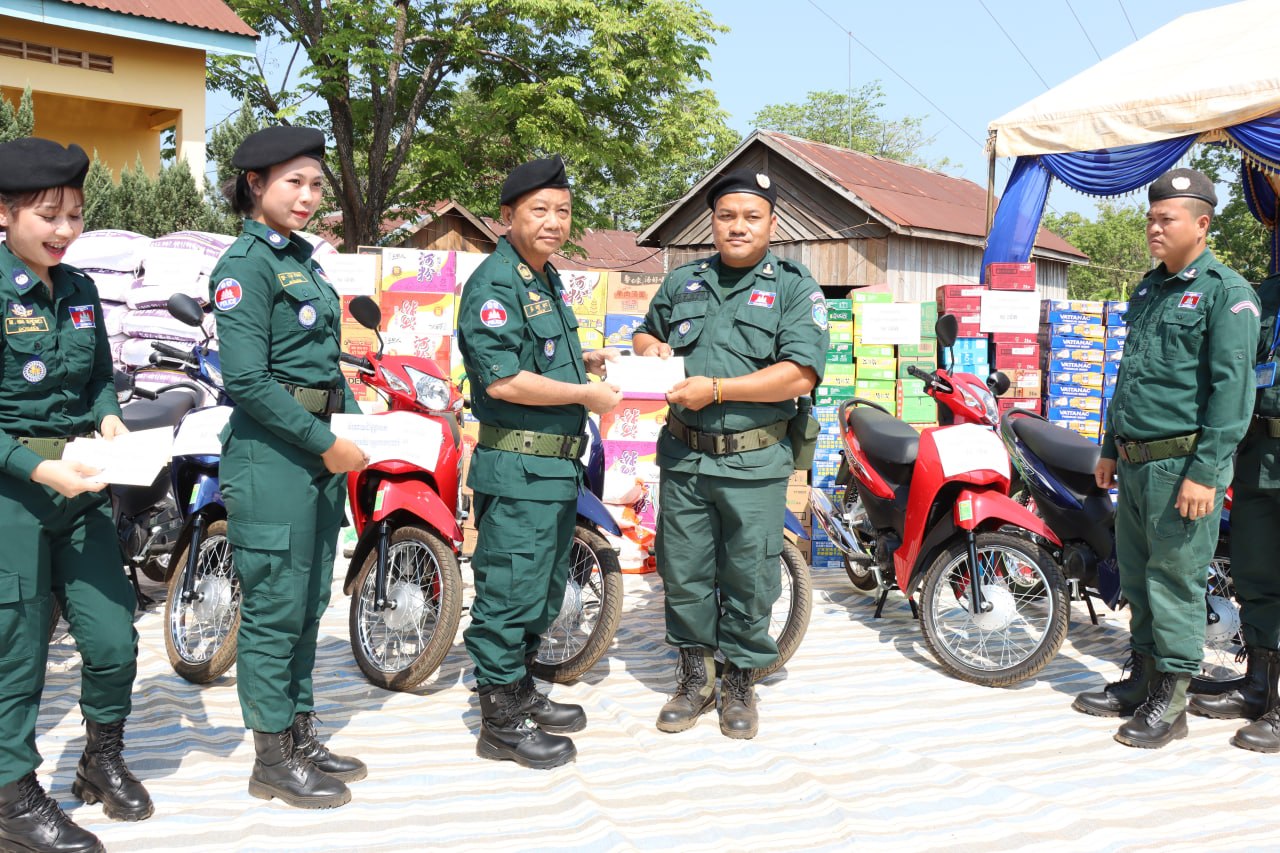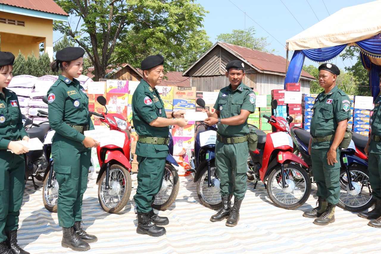 ខេត្តមណ្ឌលគិរី ៖ ម៉ូតូចំនួន ១៥គ្រឿង គ្រឿងឧបភោគបរិភោគ សម្ភារៈប្រើប្រាស់ចាំបាច់ប្រចាំថ្ងៃ និងថវិកាលើកទឹកចិត្តមួយចំនួន ដែលជាអំណោយដ៏ថ្លៃថ្លារបស់ ឯកឧត្តម នាយឧត្តមសេនីយ៍ ស ថេត អគ្គស្នងការនគរបាលជាតិ និង ឯកឧត្តម ថង សាវុន អភិបាលនៃគណៈអភិបាលខេត្តមណ្ឌលគិរី ត្រូវបានលោកឧត្តមសេនីយ៍ទោ ឡោ សុខា ស្នងការនគរបាលខេត្តមណ្ឌលគិរី នាំយកទៅប្រគល់ជូនដល់កងកម្លាំងវរសេនាតូចនគរបាលការពារព្រំដែនគោកលេខ ៣០៣ និងលេខ ៦២១ ដើម្បីសម្រួលដល់កិច្ចប្រតិបត្តិការ និងជីវភាពប្រចាំថ្ងៃ នាឱកាសបុណ្យចូលឆ្នាំថ្មីប្រពៃណីជាតិខ្មែរ។