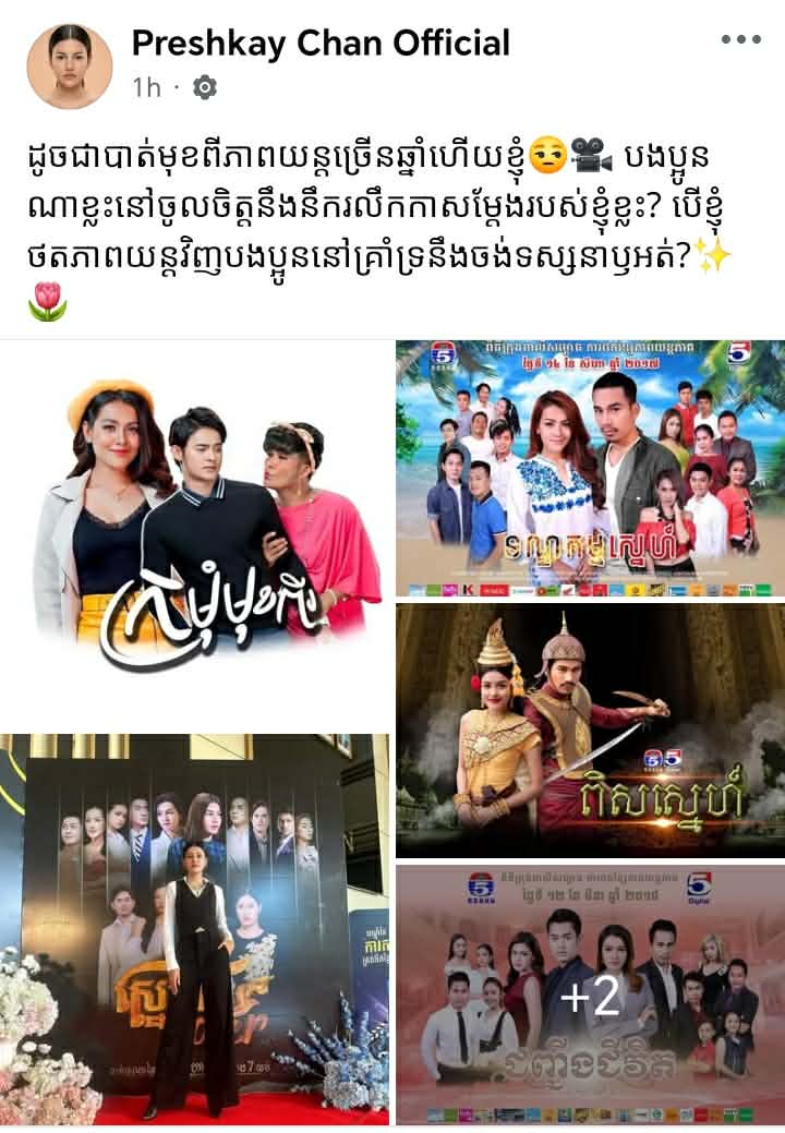ជាមួយរូបភាព Poster ផ្សព្វផ្សាយភាពយន្តមួយចំនួនដែលធ្លាប់សម្តែងនាពេលកន្លងមកនោះ តារាសម្តែងនាង ព្រះកាយច័ន្ទ បានភ្ជាប់ជាមួយនឹងសំណេរខ្លីបង្ហោះលើបណ្តាញសង្គមថា ដូចជាបាត់មុខពីភាពយន្តច្រើនឆ្នាំហើយខ្ញុំ😒🎥 បងប្អូនណាខ្លះនៅចូលចិត្តនឹងនឹករលឹកកាសម្តែងរបស់ខ្ញុំខ្លះ? បើខ្ញុំថតភាពយន្តវិញបងប្អូននៅគ្រាំទ្រនឹងចង់ទស្សនា ឬអត់ ។