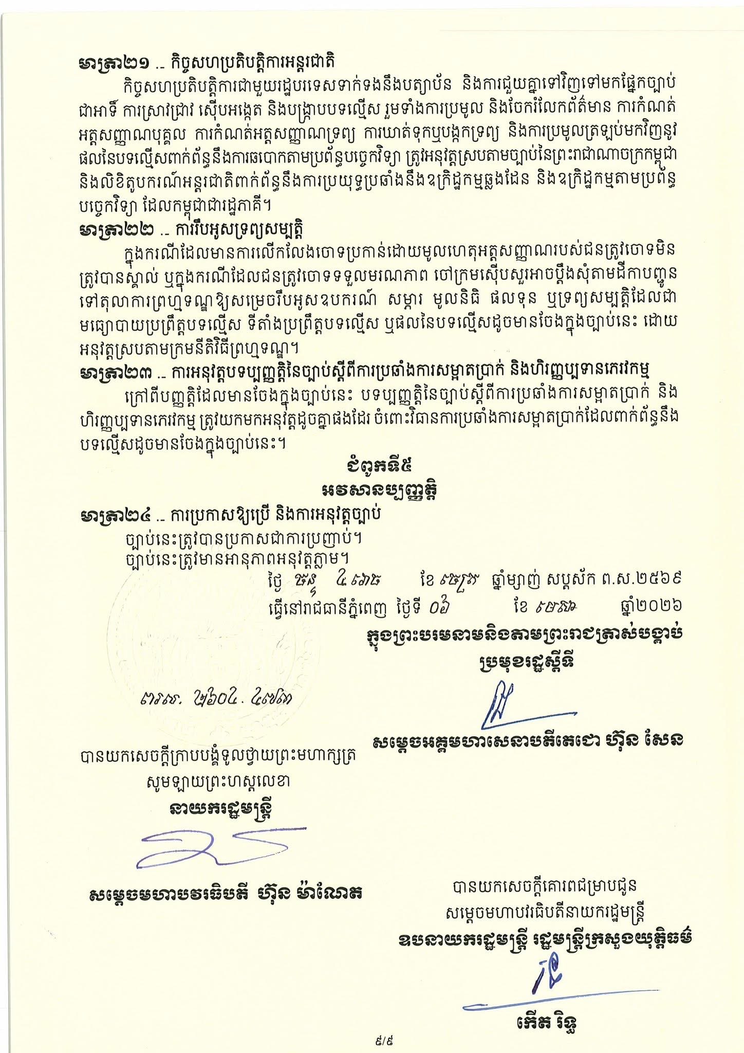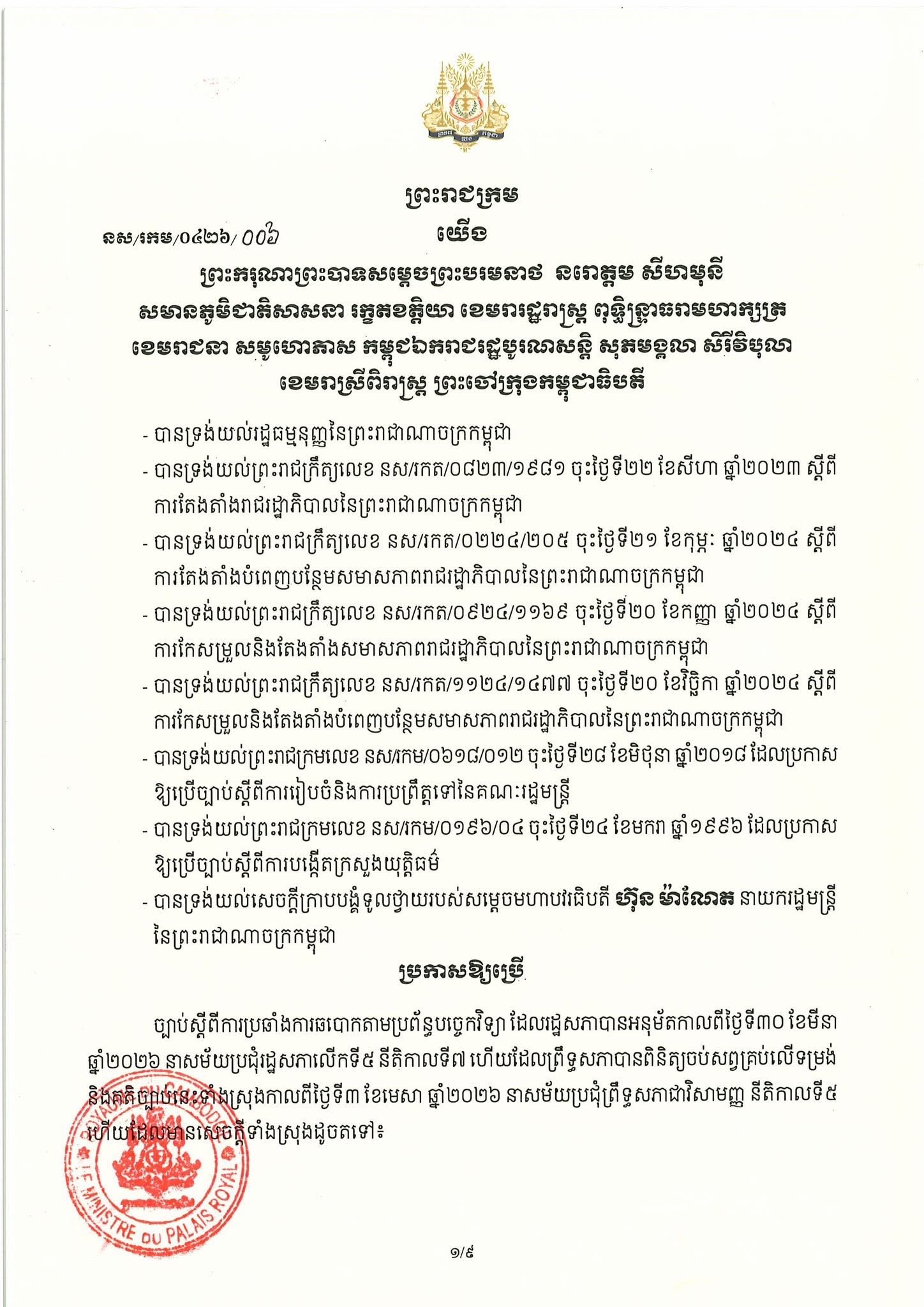 រាជធានីភ្នំពេញ ៖ សម្តេចអគ្គមហាសេនាបតីតេជោ ហ៊ុន សែន ប្រមុខរដ្ឋស្តីទី នៅថ្ងៃទី០៦ ខែមេសា ឆ្នាំ២០២៦ បានចេញព្រះរាជក្រម ប្រកាសឱ្យប្រើច្បាប់ស្តីពីការប្រឆាំងការឆបោកតាមប្រព័ន្ធបច្ចេកវិទ្យា ដែលរដ្ឋសភាបានអនុម័តកាលពីថ្ងៃទី៣០ ខែមីនា ឆ្នាំ២០២៦ នាសម័យប្រជុំរដ្ឋសភាលើកទី៥ នីតិកាលទី៧ ហើយដែលព្រឹទ្ធសភាបានពិនិត្យចប់សព្វគ្រប់លើទម្រង់ និងគតិ ច្បាប់នេះទាំងស្រុងកាលពីថ្ងៃទី៣ ខែមេសា ឆ្នាំ២០២៦ នាសម័យប្រជុំព្រឹទ្ធសភាជាវិសាមញ្ញ នីតិកាលទី៥ ៕
