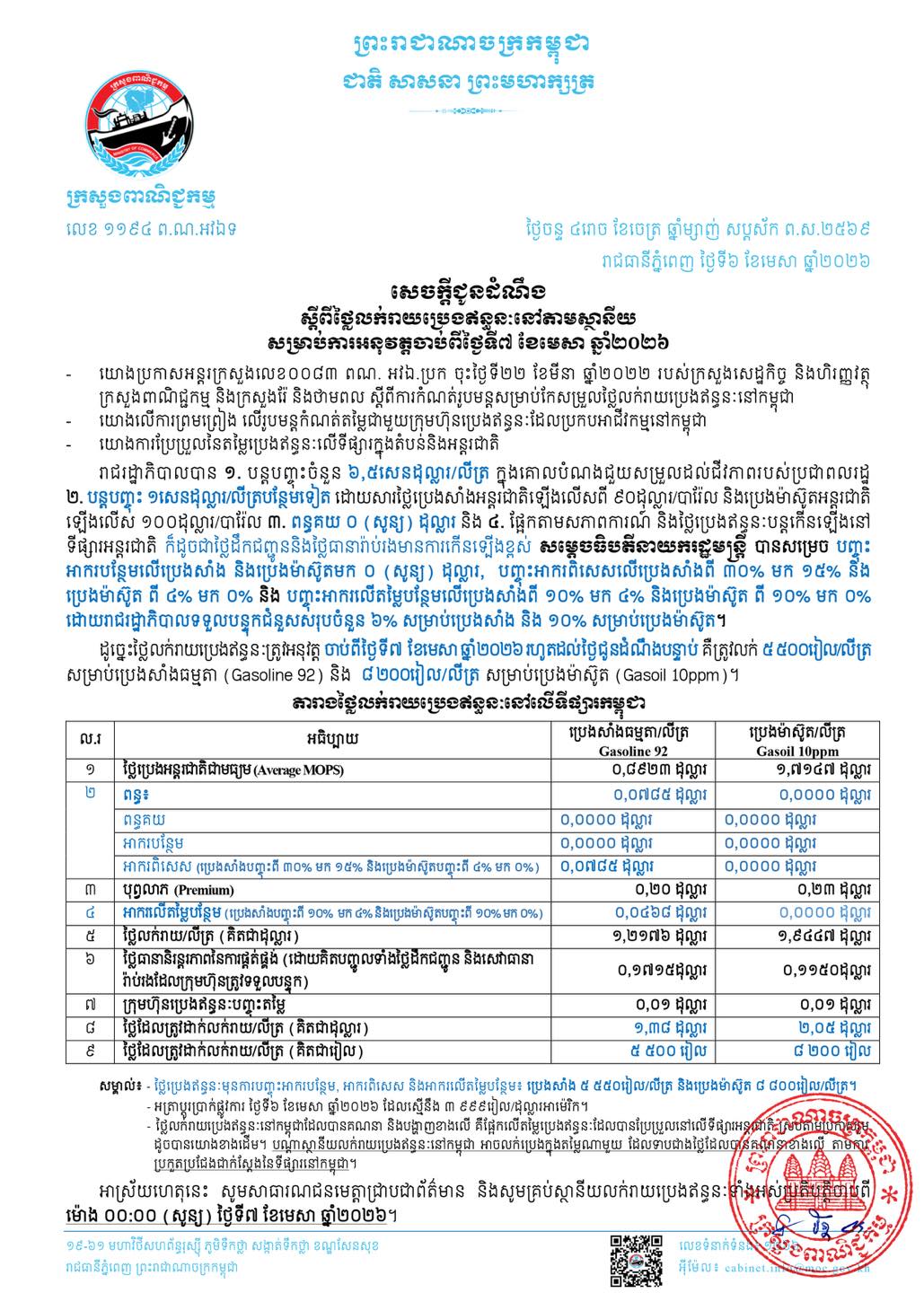 រាធានីភ្នំពេញ ៖ ក្រសួងពាណិជ្ជកម្ម បានប្រកាសនាយប់ថ្ងៃទី០៧ ខែមេសា ឆ្នាំ២០២៦នេះថា ៖ តម្លៃលក់រាយប្រេងឥន្ធនៈនៅតាមស្ថានីយ សម្រាប់ការអនុវត្តចាប់ពីម៉ោង០០:០០ (សូន្យ) ថ្ងៃទី៧ ខែមេសា ឆ្នាំ២០២៦ ។